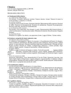 ANALISI CHIMICA, ELABORAZIONE DATI E LABORATORIO Classe terza [8 (6) ore] 1. Introduzione alla chimica delle soluzioni 1.1 Concetto di mole. 1.2 Composizione percentuale e formula minima. 1.3 Reazioni chimiche: bilanciamento e rapporti ponderali. 1.4 Soluzioni: concentrazione e sue espressioni. 1.5 Concetto di reazione chimica e calcoli stechiometrici relativi a reazioni complete. 1.6 Titolazioni e concetto di punto di equivalenza. 2. Equilibrio chimico 2.1 Costante di equilibrio: Kc. 2.2 Principio dell'equilibrio mobile. Fattori che influenzano l'equilibrio in soluzione. 2.3 Previsioni qualitative sul decorso delle reazioni. 3. Equilibri eterogenei 3.1 Solubilità e prodotto di solubilità. 3.2 La precipitazione. 3.3 Effetto dello ione a comune. 3.4 Interazione tra ioni. Cenni sulla teoria Debye-Hückel. Attività. Effetto sale. 3.5 Analisi volumetrica per precipitazione, tenendo anche presenti i sistemi colloidali. 4. Equilibri acido-base 4.1 Acidi e basi (Arrenhius e Brönsted). 4.2 Equilibrio di ionizzazione dell'acqua (autoprotolisi). Definizione e scala di pH. 4.3 Elettroliti forti e deboli. Calcolo delle concentrazioni di H3 0+ . 4.4 Reazioni tra acidi e basi forti. Reazioni con acidi o basi deboli. 4.5 Titolazioni e calcolo del pH al punto di equivalenza. Indicatori di pH. 4.6 Soluzioni tampone. 4.7 Curve di titolazione e loro calcolo teorico per punti. 4.8 pH e solubilità. 5. Equilibri redox; 5.1 Reazioni redox di interesse analitico (uso qualitativo della serie elettrochimica) e utilizzazione dell'equazione di Nernst. 5.2 Titolazioni di ossidoriduzione. 6. Complessometria. Composti di coordinazione e loro impiego nell'analisi. 7. Acquametria, finalizzata al concetto di "residuo secco". 8. Analisi qualitativa. 8.1 Solubilizzazione delle sostanze. 8.2 Condizioni generali di precipitazione e di ridissoluzione. 8.3 Analisi del residuo insolubile. 8.4 Fondamenti di analisi sistematica e reazioni analitiche degli ioni. Laboratorio · Introduzione al laboratorio (norme generali di sicurezza, organizzazione topografica, strumentazione di base, vetreria, reagenti e relativa etichettatura). · Tecnica della pesata e concetto di misura. · Taratura della vetreria (per pesata). · Schema generale di stesura delle relazioni (modello tipo "flow chart"). · Preparazione di soluzioni titolate. · Analisi quantitative ponderali. · Analisi quantitative volumetriche: acidimetria, ossidimetria, precipitazione, complessometria, con eventuale registrazione delle curve potenziometriche, senza particolari approfondimenti strumentali. · Analisi qualitative, superando in certa misura la sistematica tradizionale e facendo ricorso per quanto possibile ad agenti precipitanti non tossici, quali idrossidi, cloruri e solfati.