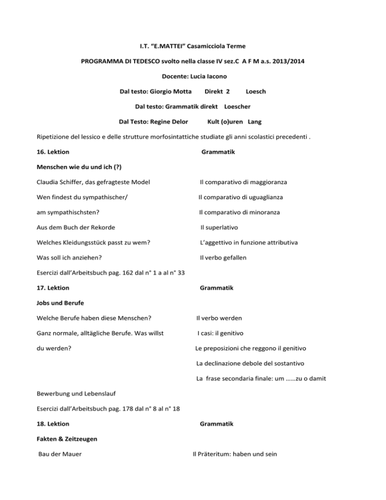 I.T. “E.MATTEI” Casamicciola Terme PROGRAMMA DI TEDESCO svolto nella classe IV sez.C A F M a.s. 2013/2014 Docente: Lucia Iacono Dal testo: Giorgio Motta Direkt 2 Loesch Dal testo: Grammatik direkt Loescher Dal Testo: Regine Delor Kult (o)uren Lang Ripetizione del lessico e delle strutture morfosintattiche studiate gli anni scolastici precedenti . 16. Lektion Grammatik Menschen wie du und ich (?) Claudia Schiffer, das gefragteste Model Il comparativo di maggioranza Wen findest du sympathischer/ Il comparativo di uguaglianza am sympathischsten? Il comparativo di minoranza Aus dem Buch der Rekorde Il superlativo Welches Kleidungsstück passt zu wem? L’aggettivo in funzione attributiva Was soll ich anziehen? Il verbo gefallen Esercizi dall’Arbeitsbuch pag. 162 dal n° 1 a al n° 33 17. Lektion Grammatik Jobs und Berufe Welche Berufe haben diese Menschen? Il verbo werden Ganz normale, alltägliche Berufe. Was willst I casi: il genitivo du werden? Le preposizioni che reggono il genitivo La declinazione debole del sostantivo La frase secondaria finale: um ……zu o damit Bewerbung und Lebenslauf Esercizi dall’Arbeitsbuch pag. 178 dal n° 8 al n° 18 18. Lektion Grammatik Fakten & Zeitzeugen Bau der Mauer Il Präteritum: haben und sein Fall der Mauer Il Präteritum die verbi modali, die verbi deboli e forti Als ich 16 war……… Paradigma dei verbi forti Mutti, war passierte, wenn du………. Le frasi secondarie temporali introdotte da als, wenn Le frasi secondarie temporali introdotte da nachdem, bevor, während La costruzione del periodo con frasi secondarie temporali Esercizi dall’Arbeitsbuch pag. 188 dal n° 3 al n° 26 19. Lektion Zukunftsvisionen GRAMMATIK La formazione del f uturo La frase secondaria: l’interrogativa indiretta Esercizi dall’Arbeitsbuch pag. 206 dal n° 4 al n° 30 21. Lektion: Liebe & Liebeskummer Was ist passiert? Warum ist Michael so traurig? Il Konjunktiv II degli ausiliari, dei verbi modali – La costruzione della frase Was würdest du machen, wenn………………… secondaria ipotetica (wenn) – e relativa Sollte Michael versuchen, Carole zurückzuerobern? I pronomi relativi Esercizi dall’Arbeitsbuch pag. 231 dal n° 1 al n° 24 22. Lektion Fantasien, Träume, Wünsche Il Konjunktiv II die verbi forti Esercizi dall’Arbeitsbuch pag. 248 dal n° 3 al n° 15 23. Lektion Events Oktoberfest Esercizi dall’Arbeitsbuch pag. 263 dal n° 3 al n° 16 Dal testo Kult(o)uren Geografie: Mitten in Europa pag. 29 La forma passiva Regole grammaticali oggetto di particolare approfondimento con esercizi da GRAMMATIK e da fotocopie Il comparativo Il superlativo La declinazione dell’aggettivo Il genitivo Frasi secondarie: temporali, finali, ipotetiche, relative La coniugazione del verbo: Presente debole e forte Il Perfekt: debole e forte Il Präteritum Paradigma dei verbi forti Il konjunktiv II Il Passivo Casamicciola, 3.6.2014 La docente Alunni …………………………………………………………………. …………………………………………………………………… …………………………………………………………………… ……………………………………..