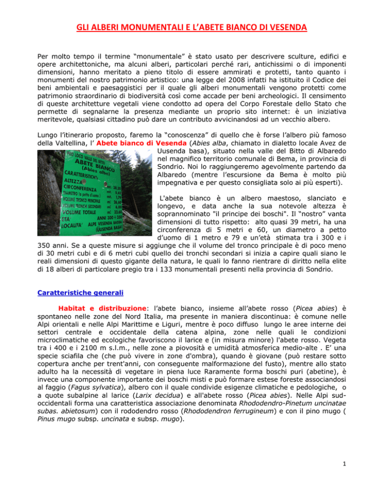GLI ALBERI MONUMENTALI E L’ABETE BIANCO DI VESENDA Per molto tempo il termine “monumentale” è stato usato per descrivere sculture, edifici e opere architettoniche, ma alcuni alberi, particolari perché rari, antichissimi o di imponenti dimensioni, hanno meritato a pieno titolo di essere ammirati e protetti, tanto quanto i monumenti del nostro patrimonio artistico: una legge del 2008 infatti ha istituito il Codice dei beni ambientali e paesaggistici per il quale gli alberi monumentali vengono protetti come patrimonio straordinario di biodiversità così come accade per beni archeologici. Il censimento di queste architetture vegetali viene condotto ad opera del Corpo Forestale dello Stato che permette di segnalarne la presenza mediante un proprio sito internet: è un iniziativa meritevole, qualsiasi cittadino può dare un contributo avvicinandosi ad un vecchio albero. Lungo l’itinerario proposto, faremo la “conoscenza” di quello che è forse l’albero più famoso della Valtellina, l’ Abete bianco di Vesenda (Abies alba, chiamato in dialetto locale Avez de Uusenda basa), situato nella valle del Bitto di Albaredo nel magnifico territorio comunale di Bema, in provincia di Sondrio. Noi lo raggiungeremo agevolmente partendo da Albaredo (mentre l’escursione da Bema è molto più impegnativa e per questo consigliata solo ai più esperti). L'abete bianco è un albero maestoso, slanciato e longevo, e data anche la sua notevole altezza è soprannominato "il principe dei boschi". Il “nostro” vanta dimensioni di tutto rispetto: alto quasi 39 metri, ha una circonferenza di 5 metri e 60, un diametro a petto d’uomo di 1 metro e 79 e un’età stimata tra i 300 e i 350 anni. Se a queste misure si aggiunge che il volume del tronco principale è di poco meno di 30 metri cubi e di 6 metri cubi quello dei tronchi secondari si inizia a capire quali siano le reali dimensioni di questo gigante della natura, le quali lo fanno rientrare di diritto nella elite di 18 alberi di particolare pregio tra i 133 monumentali presenti nella provincia di Sondrio. Caratteristiche generali Habitat e distribuzione: l’abete bianco, insieme all’abete rosso (Picea abies) è spontaneo nelle zone del Nord Italia, ma presente in maniera discontinua: è comune nelle Alpi orientali e nelle Alpi Marittime e Liguri, mentre è poco diffuso lungo le aree interne dei settori centrale e occidentale della catena alpina, zone nelle quali le condizioni microclimatiche ed ecologiche favoriscono il larice e (in misura minore) l'abete rosso. Vegeta tra i 400 e i 2100 m s.l.m., nelle zone a piovosità e umidità atmosferica medio-alte . E’ una specie sciafila che (che può vivere in zone d'ombra), quando è giovane (può restare sotto copertura anche per trent'anni, con conseguente malformazione del fusto), mentre allo stato adulto ha la necessità di vegetare in piena luce Raramente forma boschi puri (abetine), è invece una componente importante dei boschi misti e può formare estese foreste associandosi al faggio (Fagus sylvatica), albero con il quale condivide esigenze climatiche e pedologiche, o a quote subalpine al larice (Larix decidua) e all'abete rosso (Picea abies). Nelle Alpi sudoccidentali forma una caratteristica associazione denominata Rhododendro-Pinetum uncinatae subas. abietosum) con il rododendro rosso (Rhododendron ferrugineum) e con il pino mugo ( Pinus mugo subsp. uncinata e subsp. mugo). 1 In Centro Italia si trova in gruppi isolati sui Monti della Laga. Le abetine appenniniche, soprattutto quelle toscane, sono, però, da considerare in gran parte non naturali, in quanto sono il risultato di interventi umani di rimboschimento attuati dai granducati e da alcuni ordini monastici oppure sono il prodotto di una selezione, operata all'interno di foreste miste (faggio e abete bianco), che ha favorito la conifera a discapito della latifoglia. Nel Meridione lo si rinviene sia nell'Appennino lucano e sia nell'Appennino calabro: in Basilicata, lo si ritrova nella Riserva regionale Abetina di Laurenzana e nel versante settentrionale Parco nazionale del Pollino, associato al faggio; in Calabria lo si rinviene oltre che in Aspromonte, anche sulle Serre calabresi. In queste zone è degno di nota il Bosco Archiforo, nel comune di Serra San Bruno, dove sono impressionanti le dimensioni delle piante. Caratteristiche botaniche di fronte all’albero, verificatele! È una conifera sempreverde e monoica, cioè presenta sulla stessa pianta fiori maschili e femminili distinti e separati. Corteccia: negli esemplari giovani, è liscia, ha un colore bianco-grigio argenteo e presenta delle piccole sacche resinose che, se premute, diffondo odore di trementina; nelle piante più vecchie (oltre i cinquant'anni d'età) la corteccia si ispessisce tendendo a desquamarsi in placche sottili e diventa, partendo dalla base, rugosa, screpolata (fessurata) e di colore tendente al nero. Foglie: sono persistenti (8-10 anni) e costituite da aghi appiattiti, rigidi e inseriti singolarmente e separatamente sui rametti, secondo una disposizione a pettine (cioè come i denti di un doppio pettine). Gli aghi sono lunghi circa 1,5–3 cm e larghi 1,5–2 mm, leggermente ristretti alla base, con la punta arrotondata non pungente e i margini lisci. La pagina superiore, di colore verde scuro, è lucida, mentre quella inferiore presenta due caratteristiche linee parallele biancastre-azzurrognole (ecco perché si chiama abete bianco!), dette bande stomatifere, che presentano 6-8 file di stomi e canali resiniferi marginali. Altra caratteristica tipica di questa specie sono i rametti coperti da sottili peli di colore bruno chiaro. Fiori: alle nostre latitudini la fioritura dell'abete bianco avviene tra maggio e giugno. Parlare di fioritura delle conifere è in realtà inesatto, dal momento che queste piante sono gimnosperme e non producono fiori come siamo abituati ad intenderli né frutti. Gli organi riproduttivi consistono di sporofilli raggruppati a