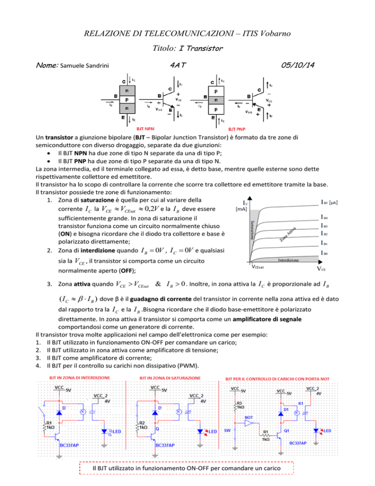 RELAZIONE DI TELECOMUNICAZIONI – ITIS Vobarno Titolo: I Transistor Nome: Samuele Sandrini 4AT 05/10/14 Un transistor a giunzione bipolare (B BJT – Bipolar Junction Transistor) è formato da tre zone di semiconduttore con diverso drogaggio, separate da due giunzioni: Il BJT NPN ha due zone di tipo N separate da una di tipo P; Il BJT PNP ha due zone di tipo P separate da una di tipo N. La zona intermedia, ed il terminale collegato ad essa, è detto base, mentre quelle esterne sono dette rispettivamente collettore ed emettitore. Il transistor ha lo scopo di controllare la corrente che scorre tra collettore ed emettitore tramite la base. Il transistor possiede tre zone di funzionamento: 1. Zona di saturazione è quella per cui al variare della corrente I C la VCE VCEsat 0,2V e la I B deve essere sufficientemente grande. In zona di saturazione il transistor funziona come un circuito normalmente chiuso (O ON) e bisogna ricordare che il diodo tra collettore e base è polarizzato direttamente; 2. Zona di interdizione quando I B 0V , I C 0V e qualsiasi sia la VCE , il transistor si comporta come un circuito normalmente aperto (O OFF); 3. Zona attiva quando VCE VCEsat & I B 0 . Inoltre, in zona attiva la I C è proporzionale ad I B ( I C I B ) dove β è il guadagno di corrente del transistor in corrente nella zona attiva ed è dato dal rapporto tra la I C e la I B .Bisogna ricordare che il diodo base-emettitore è polarizzato direttamente. In zona attiva il transistor si comporta come un amplificatore di segnale comportandosi come un generatore di corrente. Il transistor trova molte applicazioni nel campo dell’elettronica come per esempio: 1. Il BJT utilizzato in funzionamento ON-OFF per comandare un carico; 2. Il BJT utilizzato in zona attiva come amplificatore di tensione; 3. Il BJT come amplificatore di corrente; 4. Il BJT per il controllo su carichi non dissipativo (PWM). Il BJT utilizzato in funzionamento ON-OFF per comandare un carico Tale circuito utilizza un transistor BJT NPN (in funzionamento ON-OFF) per separare galvanicamente l’elemento di comando dal carico che può essere a tensioni molto superiori; in questo modo anche con un semplice circuito digitale può essere controllata la corrente di base del transistor il quale comanda un relè, il cui carico può lavorare a tensioni molto più elevate rispetto al circuito di controllo. Il relè è un elemento elettromagnetico meccanico costituito da una bobina che viene eccitata quando si verifica un passaggio di corrente e determina l’apertura o la chiusura dei contatti. Un relè si definisce normalmente aperto se a riposo presenta un interruttore aperto mentre si definisce normalmente chiuso se presenta un interruttore chiuso quando è in situazione di riposo. Il funzionamento ON-OFF del transistor ammette solo due condizioni estreme di funzionamento, la saturazione e l’interdizione, nelle quali il comportamento del BJT è assimilabile ad un interruttore chiuso o aperto tra i terminali C ed E, pilotato dalla corrente di base(IB). Analizzando il circuito si può notare che: Quando l’interruttore è aperto, la I B 0 A e di conseguenza I C 0 A , per cui il transistor è in zona di interdizione; in tale situazione il transistor funziona come un interruttore normalmente aperto per cui la bobina del relè non si eccita ed il contatto rimante aperto, il carico non viene alimentato. Quando l’interruttore è chiuso, la I B 0 A e la VCE VCEsat per cui il transistor è in zona di saturazione e si comporta come un interruttore normalmente chiuso; la bobina si eccita al passaggio della corrente ed il carico viene alimentato. In parallelo al relè vi è un diodo, il “d diodo di riciclo”, che serve per dissipare la forte corrente che si crea quando il relè si diseccita; senza tale accorgimento la corrente creata causerebbe la rottura del transistor. 2. Il BJT utilizzato in zona attiva come amplificatore di tensione BJT come amplificatore di tensione Per utilizzare il BJT come amplificatore bisogna realizzare un circuito di polarizzazione con opportune correnti e tensioni in modo tale che il BJT funzioni in zona attiva. Il guadagno dell’amplificatore è un guadagno di tensione( g v0 ) ed è dato dal rapporto tra la tensione e vi quella in ingresso, esso dipende fondamentalmente dal circuito di polarizzazione e in maniera secondaria dal transistor. Si dimostra che nel circuito rappresentato in figura il: Guadagno sull’emettitore ( g E v0 E 1 ) vale circa uno (ccircuito inseguitore), in quanto la vi tensione di uscita è uguale a quella di ingresso; Guadagno sul collettore si determina che equivale a g C amplificatore invertente. v0 C R C per cui il circuito è un vi RE Tale circuito presenta un condensatore di disaccoppiamento che ha la funzione i separare punti con differente tensione. BJT come amplificatore di tensione ad emettitore comune L’amplificatore invertente ad emettitore comune rappresentato in figura presenta un elevatissimo guadagno: si dimostra che il guadagno sul collettore ( gC 40VRC ). Tale circuito presenta un condensatore di bypass in parallelo ad Re e serve per mantenere costante la tensione sull’emettitore(VRE). 3. Il BJT come amplificatore di corrente I circuiti “P Push Pull” sono circuiti alimentati con tensione duale e non sono amplificatori di tensione ma di corrente per cui di potenza. Tali circuiti vengono realizzati sfruttando le caratteristiche dei transistor NPN e PNP, infatti analizzando il segnale di ingresso in relazione al funzionamento dei transistor, del primo circuito rappresentato sopra, si può osservare che: Nella semionda positiva, il circuito è in funzionalità “p push” per cui il BJT PNP è in zona di interdizione, al contrario entra in funzione il BJT NPN (il “diodo” del transistor è polarizzato direttamente) e quindi v0 vi 0,6V ; Nella semionda negativa il circuito è in funzionalità “p pull” per cui il BJT NPN è in zona di interdizione, mentre entra in funzione