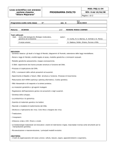 LICEO SCIENTIFICO STATALE “P. GOBETTI” PROGRAMMAZIONE ANNUALE A. S. 2016-2017 DOCENTE: FILOMENA VULCANO MATERIA - SCIENZE: BIOLOGIA - CHIMICA CLASSE 3^ C TESTI: D. SADAVA- H. C. HELLER- G. H. ORIANS- W. K. PURVES- D.M. HILLIS- “LE BASI MOLECOLARI DELLA VITA E DELL’EVOLUZIONE”-ZANICHELLI EDITORE D. SADAVA - D.M. HILLIS - H. C. HELLER- MAY R. BERENBAUM- “IL CORPO UMANO” - SECONDA EDIZIONE DI BIOLOGIA. BLU - ZANICHELLI EDITORE CHIMICA:G. VALITUTTI- M. FALASCA- A. TIFI- A. GENTILE-“CHIMICA CONCETTI E MODELLI BLU MULTIMEDIALE(LDM) DALLA STRUTTURA ATOMICA ALL’ELETTROCHIMICA - ZANICHELLI EDITORE COMPETENZE CONTENUTI BIOLOGIA BIOLOGIA Cogliere l’origine e lo sviluppo storico della genetica molecolare comprendendo come viene applicato il metodo scientifico in questa disciplina Da Mendel ai modelli di ereditarietà: - le leggi di Mendel (ripasso) - dominanza incompleta - codominanza pleiotropia - alleli multipli - eredità poligenica - eredità legata al sesso - le mutazioni Acquisire i concetti di base per comprendere la trasmissione dei caratteri ereditari e il perché di loro modificazioni Essere in grado di costruire, leggere e interpretare grafici rappresentativi della trasmissione dei caratteri ereditari Acquisire la consapevolezza che tutte le informazioni per dare origine a nuove cellule sono contenute nel DNA e trasformate in proteine Le basi chimiche dell’ereditarietà - L’esperimento di Griffith - L’esperimento di Avery - L’esperimento di Hershey e Chase DNA : il modello di Watson e Crick; la duplicazione del DNA; il codice genetico e la sintesi proteica ; mutazioni puntiformi e conseguenze; la genetica dei virus :struttura dei batteriofagi e modalità di riproduzione ; virus animali: cicli riproduttivi. la genetica dei batteri: coniugazione, plasmidi, trasformazione e trasduzione; la regolazione dell’espressione genica nei procarioti . L’evoluzione biologica L’evoluzione biologica Comprendere gli sviluppi storici del pensiero evoluzionista anche attraverso le interpretazioni attuali Saper interpretare i complessi processi evolutivi che portano alla comparsa di nuove specie Le prove e i meccanismi dell’evoluzione L’equilibrio di Hardy-Weinberg Le diverse modalità di selezione naturale Il concetto di specie e i meccanismi di speciazione CHIMICA CHIMICA Individuare la disposizione e il ruolo delle particelle subatomiche in un atomo Acquisire il concetto di dimensione degli atomi e delle loro masse Modelli atomici e molecolari Sistema periodico Legame chimico Composti inorganici Nomenclatura Riconoscere e applicare il criterio della periodicità di comportamento degli elementi Dimostrare di aver compreso il significato qualitativo e quantitativo delle formule chimiche, sapendole interpretare sia dal punto di vista particellare ,sia dal punto di vista macroscopico Classificare le principali categorie di composti inorganici .