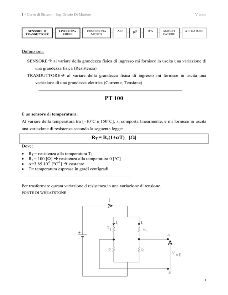 1 - Corso di Sistemi - Ing. Orazio Di Martino SENSORE O TRASDUTTORE LINEARIZZA ZIONE V anno CONDIZIONA MENTO A/D P D/A AMPLIFI CATORE ATTUATORE Definizioni: SENSORE al variare della grandezza fisica di ingresso mi fornisce in uscita una variazione di una grandezza fisica (Resistenza) TRASDUTTORE al variare della grandezza fisica di ingresso mi fornisce in uscita una variazione di una grandezza elettrica (Corrente, Tensione) PT 100 È un sensore di temperatura. Al variare della temperatura tra [–10°C e 150°C], si comporta linearmente, e mi fornisce in uscita una variazione di resistenza secondo la seguente legge: RT = Ro(1+T) [] Dove: RT = resistenza alla temperatura T; Ro = 100 [] resistenza alla temperatura 0 [°C] =3.85 10-3 [°C-1] costante T= temperatura espressa in gradi centigradi ________________________________________________ Per trasformare questa variazione d resistenza in una variazione di tensione. PONTE DI WHEATSTONE 1 2 - Corso di Sistemi - Ing. Orazio Di Martino SENSORE O TRASDUTTORE LINEARIZZA ZIONE V anno CONDIZIONA MENTO A/D P D/A AMPLIFI CATORE ATTUATORE ESEMPIO: Si progetti il circuito che mi consenti di ottenere una tensione di 0 [V] quando il mio sensore PT100 mi rileva una temperatura di –20°C , ed una tensione di 5 V quando mi rileva una temperatura di +80°C. ________ La legge di variazione dell’uscita del sensore PT100 al variare della temperatura è data dalla seguente espressione: RT = Ro(1+T) [ ] Calcoliamo il valore della resistenza in uscita del sensore alla temperatura di –20 [°C]: RT =100(1+3.85 10-3 (-20)) [] RT = 92,3 [] Calcoliamo il valore della resistenza in uscita del sensore alla temperatura di +80 [°C]: RT =100(1+3.85 10-3 (80)) [] RT = 130,8 [] Per trasformare questa variazione di resistenza in una variazione di tensione utilizzo un ponte di Wheatstone unitamente a due inseguitori di tensione o anche detti disaccoppiatori ed un amplificatore differenziale. fisso la tensione E= 12 [V] dimensionamento di R Per bilanciare il ponte alla T=-20°C, pongo R=RT(T=-20°C) ovvero a R=92.30 [] 2 3 - Corso di Sistemi - Ing. Orazio Di Martino SENSORE O TRASDUTTORE LINEARIZZA ZIONE V anno CONDIZIONA MENTO A/D P D/A AMPLIFI CATORE ATTUATORE dimensionamento di R1 Dai data sheet si rileva che la massima corrente sopportabile del mio sensore è I=3 [mA], pertanto faccio il modo di limitare la corrente che attraversa il sensore intervenendo sulla R1; ricavo l’espressione della corrente che attraversa il ramo del ponte di Wheatstone dove risiede il sensore : IB E IB R1 RT mi pongo nella condizione peggiore per il sensore, cioè massima corrente, ovvero minimo denominatore I B max E R1 RT (T 20C ) Sostituendo i valori, ottengo: I B max 12 3 10 3 [ A] R1 92.30 da cui ricavo la R1: 12 R1 92.30 4000 92.30 3907[] VALORE _ COMM .4.3[] 3 10 3 dimensionamento di R2 - R3 per il dimensionamento della R2 e della R3 , devo dapprima conoscere i valori della VAB sia a –20°C che a 80 °C. Si ricorda che la tensione all’uscita del ponte di Wheatstone VAB è data dalla seguente formula: RT R0 V AB V A V B E R1 R R R R 1 0 1 T si ricorda, inoltre che, Ro equivale alla RT(T=-20°C)=92.30[]; sostituendo i valori sia per T=-20[°C] che per T=80[°C], si ottengono i due valori di VAB, che sono VAB (T=-20 °C)=0 [V] VAB (T=80 °C)= 0,102[V] Poiché Vo deve essere uguale a 5[V], e dato che l’amplificazione dello stadio amplificatore differenziale finale è data dalla seguente espressione: 3 4 - Corso di Sistemi - Ing. Orazio Di Martino SENSORE O TRASDUTTORE LINEARIZZA ZIONE A CONDIZIONA MENTO V anno A/D P D/A AMPLIFI CATORE ATTUATORE R3 R2 Si ha: V0 A V AB V0 R3 R3 VAB R2 V0 R2 V AB impongo R2=10.000[], sostituendo ottengo: R3 5 10000 490.196 Valore comm. 470 k + 47 k 0.102 4