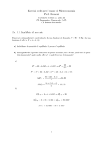 EQUILIBRIO DI MERCATO, POLITICHE ECONOMICHE E BENESSERE CONTROLLO dei PREZZI • Vi sono situazioni in cui il principio di efficienza si scontra • • • • con quello di equità. Considerazioni di tipo normativo possono indurre i decisori politici ad intervenire nel mercato con una regolamentazione dei prezzi. Vengono così create delle soglie di prezzo: Soglie superiori, quando si impone che il prezzo non possa salire oltre un certo limite: prezzo massimo imposto Soglie inferiori, quando si impone che il prezzo non possa scendere oltre il limite fissato: prezzo minimo imposto Prezzo massimo o soglia superiore • Se la soglia superiore si trova al di sopra del prezzo che si verrebbe a creare nel mercato non regolamentato, la soglia non è vincolante. • Per esempio, se si impone che il prezzo del pane non possa essere superiore a 4 €, ed il mercato «lasciato a sé stesso» trova un equilibrio a 3 €, il prezzo imposto non è vincolante: è come se l’imposizione non ci fosse. • Se invece la soglia superiore imposta fosse di 2 €, allora al prezzo di mercato di 3 € il prezzo imposto è vincolante. • Quando la politica economica impone soglie superiori di prezzo vincolanti, si determinerà una situazione di disequilibrio (scarsità dell’offerta rispetto alla domanda) Prezzo massimo o soglia superiore Prezzo minimo o soglia inferiore • Se la soglia minima di prezzo a cui si richiede debba essere venduto il bene si trova al di sotto del prezzo che si verrebbe a creare nel mercato non regolamentato, la soglia non è vincolante • Per esempio, se si impone che il salario di un lavoratore non possa essere al di sotto della soglia di 10 € all’ora, e l’equilibrio di mercato è di 15 € , allora il prezzo imposto non sarà vincolante, e l’equilibrio di mercato non viene modificato • Se invece il mercato trovasse l’equilibrio a 5 €, allora il prezzo minimo imposto sarebbe vincolante: l’effetto sarebbe che una parte del lavoro offerto dai lavoratori non troverebbe una domanda corrispondente • Ci sarebbe cioè un eccesso di offerta di lavoro, o in altri termini un certo livello di disoccupazione determinato dalla politica del salario minimo imposto Prezzo minimo o soglia inferiore Esempio di soglia minima: salario • Per molti contratti di lavoro viene imposta una soglia minima di retribuzione. • Questo comporterà una situazione di disequilibrio se la quantità di lavoro domandata dalle imprese al prezzo soglia è inferiore rispetto alla quantità che i lavoratori vogliono offrire a quel prezzo. • Se però le imprese possono trasferire i costi sui consumatori aumentando il prezzo del bene, la curva di domanda di lavoro si sposterà verso alto/destra e si determinerà un nuovo equilibrio (si recupera un po’ di occupazione) Esempio di soglia minima: salario a) Mercato del lavoro libero da vincoli Offerta di lavoro Salario di equilibrio Domanda di lavoro Occupazione di equilibrio Esempio di soglia minima: salario b) Mercato del lavoro con salario minimo vincolante Eccedenza di lavoro (disoccupazione) Offerta di lavoro Salario minimo Domanda di lavoro Quantità domandata Quantità offerta Esempio di soglia minima: salario c) Mercato del lavoro con salario minimo vincolante e aumento della domanda di lavoro Nuovo livello di disoccupazione Offerta di lavoro Salario minimo 𝐷2 𝐷1 Nuova quantità domandata Quantità offerta IMPOSTE • Si è visto precedentemente che lo Stato può adottare delle politiche di assistenza e sostegno per i lavoratori disoccupati • Le voci di spesa relative all’assistenza sono uno dei (tanti) capitoli della spesa pubblica • Come si finanziano? • Le imposte servono per finanziare la spesa pubblica. EFFETTI DISTORSIVI DELLE IMPOSTE • La spesa pubblica ha un effetto positivo sul benessere della società (soprattutto se questa è efficiente) quando è destinata ad un effettivo miglioramento del benessere dei cittadini: per finanziare programmi di assistenza, sanità, istruzione, beni pubblici, etc. • Anche quando la spesa pubblica è efficiente però si deve considerare l’effetto negativo delle imposte sull’economia di mercato • Tranne pochissime eccezioni, che comunque presentano altre controindicazioni poco desiderabili, tutte le forme di imposizione fiscale (sul reddito, sul patrimonio, sui consumi) determinano una qualche forma di distorsione sul mercato, in quanto modificano gli incentivi degli agenti economici IMPOSTA SUL CONSUMO: INCIDENZA • Consideriamo il caso di un’imposta sul consumo: un’imposta sul consumo ha un effetto depressivo sull’economia, dato che in seguito all’incremento di prezzo la quantità scambiata sul mercato sarà inferiore rispetto a quella desiderata in assenza di tassazione • Il prezzo del bene aumenterà, anche se in genere di un ammontare inferiore rispetto all’imposta • Acquirenti e venditori dei beni di consumo tassati si ripartiscono l’onere dell’imposta. • L’incidenza dell’imposta è il modo in cui l’onere dell’imposta si ripartisce tra acquirenti e venditori IMPOSTA SUL CONSUMO: INCIDENZA • Le imposte sul consumo possono essere di due tipi: sulla quantità o ad valorem • Nel caso di imposte sulla quantità il prelievo fiscale è determinato da un prezzo (l’imposta) che si aggiunge al prezzo di mercato per ogni unità di prodotto. Questo tipo di imposta viene chiamata accisa: esempi di accisa sono l’imposta sulla benzina, sui tabacchi, sugli alcolici • Nel caso di imposte ad valorem l’imposta viene fissata in rapporto al valore del bene: per esempio l’IVA, imposta sul valore aggiunto, per molti beni è attualmente fissata al 22% del valore del bene • L’effetto dell’imposta sul consumo sull’equilibrio di mercato (l’incidenza dell’imposta) è lo stesso, sia che l’imposta sia di tipo ad valorem sia che sia un’accisa IMPOSTA SUL CONSUMO: INCIDENZA • Consideriamo per esempio un’imposta sulla quantità di un bene di c