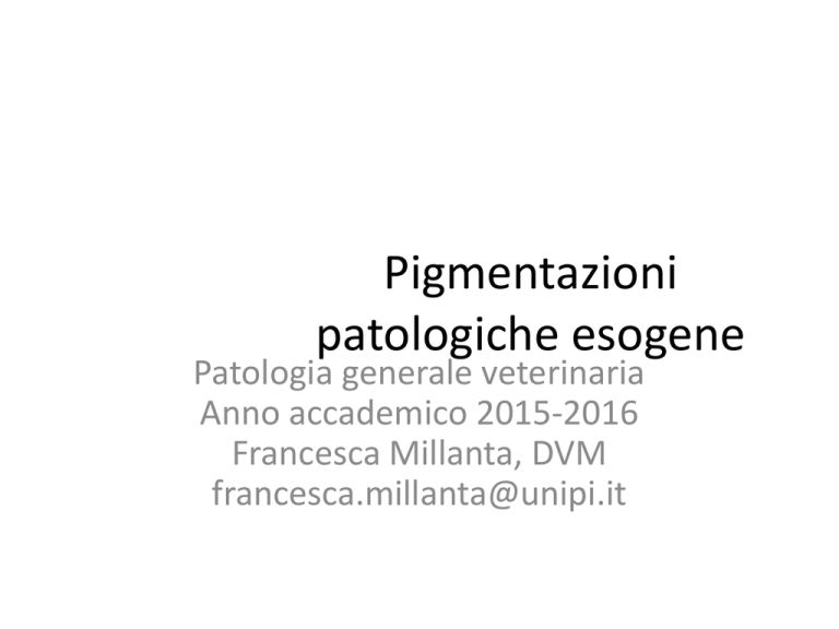 Pigmentazioni patologiche esogene Patologia generale veterinaria Anno accademico 2015-2016 Francesca Millanta, DVM [email protected] Pigmenti • Sostanze con colorazione propria di origine esogena estranee al corpo ed introdotte dall’esterno endogena presenti nelle cellule, tessuti e sangue, dove svolgono importanti funzioni biologiche Pigmentazioni patologiche • Deposizione di pigmenti per: eccessivo accumulo in sedi dove normalmente sono presenti comparsa in sedi dove normalmente sono assenti Pigmentazioni patologiche • Classificazione: • Pigmentazioni ESOGENE • Pigmentazioni ENDOGENE Pigmentazioni patologiche Pneumoconiosi antracosi, siderosi Silicosi, asbestosi Saturnismo Argirosi Carotenosi … Pneumoconiosi • La gravità delle pneumoconiosi è dovuta al fatto che, se le polveri sono biologicamente attive provocano infiammazione e fibrosi. Pneumoconiosi • L’evoluzione del processo dipende dalle dimensioni delle polveri: • < 3 µm giungono agli alveoli • > 3 µm vengono arrestate ed espulse Pneumoconiosi • Antracosi in soggetti che vivono in aree urbane con smog o presso miniere di carbone polvere nera fagocitata dai macrofagi (che migrano nell’interstizio) e drenata dai linfatici Pneumoconiosi Polmone di cane con antracosi Pneumoconiosi Pneumoconiosi Pneumoconiosi Siderosi in soggetti che vivono presso miniere di ferro Ematite (siderosi rossa) Limatura di ferro (siderosi nera) colore rosso rugginoso colore nero Pneumoconiosi • Silicosi inalazione di ossido di silicio • A) I microcristalli penetrano nell’interstizio, sono fagocitati e inglobati dai fagolisosomi dei macrofagi Pneumoconiosi Silicosi Pneumoconiosi b) rottura della membrana del fagolisosoma con autolisi Pneumoconiosi c) liberazione del microcristallo con perpetuazione del ciclo Pneumoconiosi • d) il materiale liberato ha attività proflogogena e chemiotattica sui fibroblasti NODULO SILICOTICO Pneumoconiosi NODULO SILICOTICO Pneumoconiosi Asbestosi malattia professionale per inalazione di asbesto o amianto (silicati di mg) Aghi sottili (0,5 µm) e lunghi (100 µm) che si fermano nei bronchioli FIBROSI MESOTELIOMA Pneumoconiosi Saturnismo Intossicazione cronica con deposito di solfuro di Pb nelle gengive ardesiaco stria color grigio bluastro “Orletto saturnino di Burton” Argirosi • Sali di Ag e Bi somministrati a scopo terapeutico. Comparsa nei tessuti interstiziali di granuli di solfuro di argento color grigio scuro di cuore, fegato, milza e reni Carotenoidi • Sono composti lipidici esistenti in natura sotto forma di esteri (500). • Struttura di base 40 atomi di C, per fusione di 2 subunità terpeniche Carotenoidi • Classificazione: • 1) CAROTENI idrocarburi a) beta carotene (carote e foglie) b) licopene (pomodoro e frutta) Carotenoidi • Classificazione: • 2) XANTOFILLE con gruppi alcolici ecc. a) criptoxantina (arancia e mais) b) luteina (glutine e mais) c) cantaxantina (insetti e alghe) d) astaxantina (crostacei) ecc. Carotenoidi • La capacità pigmentante è legata alla conversione in vit A (la trasformazione in vit A fa perdere il potere pigmentante) Carotenoidi NB! In condizione di sufficiente apporto di vit A con la dieta questa conversione non avviene per alcuni carotenoidi e quindi fungono da pigmento NB! I carotenoidi possono seguire diverse vie metaboliche e si possono produrre colori diversi rispetto ai pigmenti di partenza (dicromismo sessuale) Carotenoidi • I carotenoidi con maggior potere pigmentante sono le xantofille il loro contenuto può essere modificato da diverse cause (tempo del raccolto, conservazione, ecc…) Carotenoidi • L’efficienza della mucosa intestinale nella - conversione del beta-carotene a vit A e della sua - eliminazione per via digerente varia di specie in specie Carotenoidi • ALTA animali a grasso bianco pecora capra suino ratto Carotenoidi • SCARSA animali a grasso giallo pollo bovino cavallo topo con deposito nel tessuto adiposo Carotenoidi Pigmentazione gialla del fegato per mancata conversione e metabolizzazione del beta-carotene ingerito con la dieta per danno tossico epatico peculiare dei bovini Bioflavonidi Quercitina presente nei cereali pigmento nerastro dello strato corneo epiteliale del rumine di ovini e bovini alimentati con concentrati Ghiande Pigmentazione bruna del colon, milza, fegato, rene e linfonodi di suini alimentati per lungo tempo con ghiande. Fave secche Pigmentazione bruna dei linfonodi meseraici di vitelloni alimentati con integratori a base di fave secche. Piante Swansonia Lipopigmento giallastro nei mecrofagi e neuroni Phalaris Lipopigmento giallo-bruno nei neuroni Altre sostanze Tetracicline Composti fluorescenti (ossa) Inoculazione di sostanze estranee Tatuaggio nel cane Iniezione di ferro destrano nei suinetti
