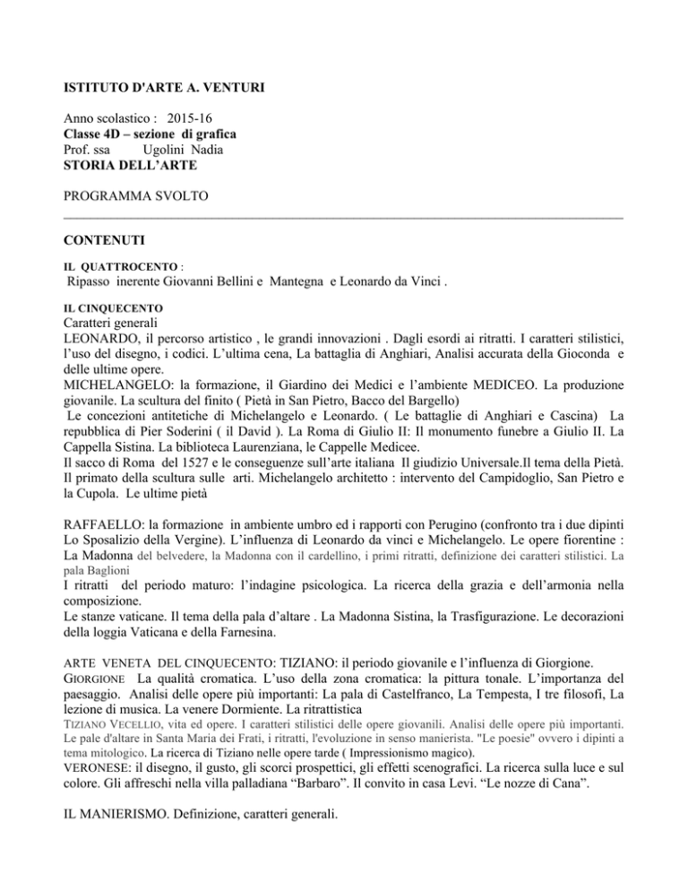 ISTITUTO D'ARTE A. VENTURI Anno scolastico : 2015-16 Classe 4D – sezione di grafica Prof. ssa Ugolini Nadia STORIA DELL’ARTE PROGRAMMA SVOLTO ___________________________________________________________________________________ CONTENUTI IL QUATTROCENTO : Ripasso inerente Giovanni Bellini e Mantegna e Leonardo da Vinci . IL CINQUECENTO Caratteri generali LEONARDO, il percorso artistico , le grandi innovazioni . Dagli esordi ai ritratti. I caratteri stilistici, l’uso del disegno, i codici. L’ultima cena, La battaglia di Anghiari, Analisi accurata della Gioconda e delle ultime opere. MICHELANGELO: la formazione, il Giardino dei Medici e l’ambiente MEDICEO. La produzione giovanile. La scultura del finito ( Pietà in San Pietro, Bacco del Bargello) Le concezioni antitetiche di Michelangelo e Leonardo. ( Le battaglie di Anghiari e Cascina) La repubblica di Pier Soderini ( il David ). La Roma di Giulio II: Il monumento funebre a Giulio II. La Cappella Sistina. La biblioteca Laurenziana, le Cappelle Medicee. Il sacco di Roma del 1527 e le conseguenze sull’arte italiana Il giudizio Universale.Il tema della Pietà. Il primato della scultura sulle arti. Michelangelo architetto : intervento del Campidoglio, San Pietro e la Cupola. Le ultime pietà RAFFAELLO: la formazione in ambiente umbro ed i rapporti con Perugino (confronto tra i due dipinti Lo Sposalizio della Vergine). L’influenza di Leonardo da vinci e Michelangelo. Le opere fiorentine : La Madonna del belvedere, la Madonna con il cardellino, i primi ritratti, definizione dei caratteri stilistici. La pala Baglioni I ritratti del periodo maturo: l’indagine psicologica. La ricerca della grazia e dell’armonia nella composizione. Le stanze vaticane. Il tema della pala d’altare . La Madonna Sistina, la Trasfigurazione. Le decorazioni della loggia Vaticana e della Farnesina. ARTE VENETA DEL CINQUECENTO: TIZIANO: il periodo giovanile e l’influenza di Giorgione. GIORGIONE La qualità cromatica. L’uso della zona cromatica: la pittura tonale. L’importanza del paesaggio. Analisi delle opere più importanti: La pala di Castelfranco, La Tempesta, I tre filosofi, La lezione di musica. La venere Dormiente. La ritrattistica TIZIANO VECELLIO, vita ed opere. I caratteri stilistici delle opere giovanili. Analisi delle opere più importanti. Le pale d'altare in Santa Maria dei Frati, i ritratti, l'evoluzione in senso manierista. "Le poesie" ovvero i dipinti a tema mitologico. La ricerca di Tiziano nelle opere tarde ( Impressionismo magico). VERONESE: il disegno, il gusto, gli scorci prospettici, gli effetti scenografici. La ricerca sulla luce e sul colore. Gli affreschi nella villa palladiana “Barbaro”. Il convito in casa Levi. “Le nozze di Cana”. IL MANIERISMO. Definizione, caratteri generali. Toscana: Reazione anti-classica in PONTORMO (La deposizione di Firenze, la Visitazione ) e ROSSO FIORENTINO ( la deposizione di Volterra ). GIULIO ROMANO a Roma e Palazzo Te a Mantova. La “maniera” a Venezia TINTORETTO, il pittore della luce: le opere della scuola grande di San Rocco, e della scuola di San Marco. L’ultima cena di San Giorgio Maggiore PALLADIO: la vocazione classicista. Il tema delle ville e delle chiese. Cenni sull’attività a Vicenza . La basilica ed il Teatro Olimpico. I manieristi toscani al tempo di Cosimo I, cenni: Cellini, Vasari, Il Bronzino, Giambologna, La pittura in Emilia CORREGGIO: La Camera di San Paolo a Parma, le cupole di san Giovanni Evangelista e del Duomo di Parma. Quadri mitologici per Federico di Gonzaga. La Pala di San Girolamo ( IL giorno) e l’adorazione dei pastori ( La notte). PARMIGIANINO: la Madonna con il collo lungo, autoritratto allo specchio; decorazione della Rocca di Fontanellato. Riforma e controriforma. Il concilio di Trento e le arti. IL SEICENTO Opposizione al Manierismo: Accademia dei CARRACCI a Bologna, cenni a Ludovico e d Agostino. ANNIBALE CARRACCI I dipinti di genere ( Il mangia fagioli, Macelleria ) . Lo studio dell’antico attraverso il vero naturale negli affreschi di palazzo Farnese a Roma: il paesaggio classico. CARAVAGGIO la rivoluzione naturalistica verso la pittura di realtà. La formazione in area Lombarda. A Roma presso il Cavaglier D’Arpino, i dipinti della Cappella Contarelli in S.Luigi dei Francesi. La funzione rivelatrice della luce, l’innovazione iconografica. I passaggi a Napoli, Malta, Sicilia e le ultime opere. Accenni ai caravaggisti ( Orazio ed Artemisia Gentileschi) La natura morta : i temi e le declinazioni, in Italia, nei paesi fiamminghi ed in Spagna. La pittura di paesaggio. Poussin e Lorrain accenni. I seguaci dei Carracci: Guido Reni, Domenichino, Guercino. Accenni ai caratteri ed analisi di opere significative Il “BAROCCO”. Definizione, caratteri generali. GIAN LORENZO BERNINI: le opere giovanili. Gli incarichi a Roma. Le Fontane. Le tecniche miste ed il meraviglioso. Il progetto per il colonnato di piazza di San Pietro Francesco BORROMINI: i caratteri fortemente innovativi proposti negli edifici progettati. Analisi delle opere più importanti PIETRO DA CORTONA : Il trionfo della Divina Provvidenza. Le regge in Europa. L’esempio di Versailles. IL SETTECENTO Caratteri generali del secolo dal rococò al neoclassicismo. Il “ROCOCO’” italiano ed europeo. Definizione e aspetti generali. Francia: cenni ad ANTOINE WATTEAU ( le feste galanti), FRAGONARD, BOUSCHER E HOGART: la critica sociale. I caratteri generali della pittura rococò . L’architettura rococò in Europa: Amalienburg, accenni all’opera di Juvarra , La reggia di Caserta. FRA SETTECENTO ED OTTOCENTO IL NEOCLASSICISMO. Definizione, caratteri generali, teorie artistiche di Winckelman e Mengs. Idea di bellezza ed idea di natura. METODOLOGIE E STRUMENTI Gli argomenti sono stati presentati secondo un ordine cronologico, con lezioni prevalentemente frontali, integrate da interlocuzioni con la classe, Si è utilizzato per lo studio il libro di testo ed altri sussidi didattici