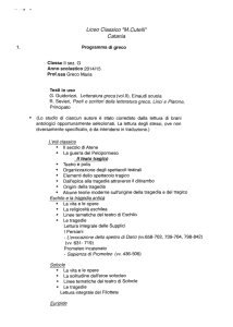 Letteratura – poesia Tragedia Il genere tragico nasce in Grecia nel vi secolo a.C. e trova soprattutto nella città di Atene il massimo sviluppo, attraverso le figure dei tre grandi tragici di cui sono state tramandate le tragedie, Eschilo, Sofocle e Euripide. Grazie ai soggiorni di Eschilo a Siracusa e di Euripide in Macedonia la tragedia fu rappresentata anche in questi centri. La sua origine è un argomento ampiamente dibattuto ed irrisolto, soprattutto in ragione del fatto che non possediamo tragedie appartenenti alle origini, ma solo testi che ne rappresentano lo sviluppo maturo, basti pensare che la prima tragedia a noi pervenuta, i Persiani di Eschilo, furono rappresentati nel 472 a.C., mentre secondo le fonti il primo vincitore di un agone tragico, l’ateniese Tespi vinse nel 535-34. Accanto alle figure dei tre grandi tragici ateniesi si collocano i nomi di altri autori ateniesi, quali appunto Tespi, Agatone, Frinico, ecc., di cui la tradizione tramanda titoli e frammenti, ma non testi completi; l’ultima tragedia originale rappresentata a noi pervenuta è l’Edipo a Colono di Sofocle, nel 401; in seguito furono rappresentate solo repliche delle tragedie di Eschilo e soprattutto di Sofocle ed Euripide. La tragedia greca ha profondo valore religioso ed è rappresentata nel contesto delle feste cittadine (le grandi Dionisie); essa è scandita in sezioni ben definite: il prologo, la parodo, canto di ingresso del coro, gli episodi, recitati dagli attori, e gli stasimi, cantati dal coro, guidato dal corifeo. L’ultimo stasimo è seguito dall’esodo, che chiude la tragedia; gli attori, originariamente due, furono aumentati a tre da Sofocle, che incrementò anche il numero dei coreuti da 12 a 15. La tragedia greca ha per argomento il mito, eccezione fatta per i Persiani di Eschilo, che mettono in scena la vittoria greca contro i Persiani guidati da Serse, proiettando comunque la vicenda sullo sfondo mitico; essa mette in scena un grave conflitto che si sviluppa tra i protagonisti e che comporta lo scontro tra concezioni diverse della vita o dello stato, oppure una vicenda dolorosa da cui il protagonista è travolto inconsapevolmente, o di cui si rende responsabile in nome dei suoi valori. Lo scioglimento della vicenda è spesso, ma non sempre, infausto e comporta la morte o il suicidio del protagonista, salvo i casi in cui la divinità interviene a risolvere il conflitto tragico. Il teatro tragico latino dà le prime prove nel iii secolo e si basa sull’imitazione del teatro greco, grazie alle opere di autori quali Livio Andronico, Nevio ed Ennio, che avevano assistito alle rappresentazioni teatrali greche nelle città della Magna Grecia. Le tragedie latine di argomento greco, spesso tratte dal ciclo troiano, sono definite fabulae cothurnatae, dal nome degli alti sandali, cothurni, che gli attori della tragedia greca indossavano, mentre quelle di argomento latino, ispirate alle vicende antichissime della storia romana, si definiscono fabulae praetextae, dalla toga praetexta, la veste dei magistrati romani. Anche la tragedia latina viene rappresentata nel contesto di feste religiose o di celebrazioni di particolare rilievo per la città. Livio Andronico scrisse unicamente cothurnatae, mentre a Nevio (iii sec.a. C.) ed Ennio (239-169 a. C.) si devono anche fabulae praetextae; il teatro latino ebbe in seguito autori minori (Accio e Pacuvio) e anche il tentativo augusteo di riportare in auge il teatro come spettacolo collettivo attraverso la sua riforma, affidata all’Ars poetica di Orazio, non ebbe grande successo. Il teatro tragico romano torna a fiorire nelle tragedie di Seneca (5 a.C.- 65 d. C.), tutte cothurnate, tranne l’Octavia, quasi sicuramente spuria, che sono però con tutta probabilità destinate alla lettura o a recitazioni private e non al teatro, e costituiscono una sorta di rappresentazione scenica della filosofia senecana.