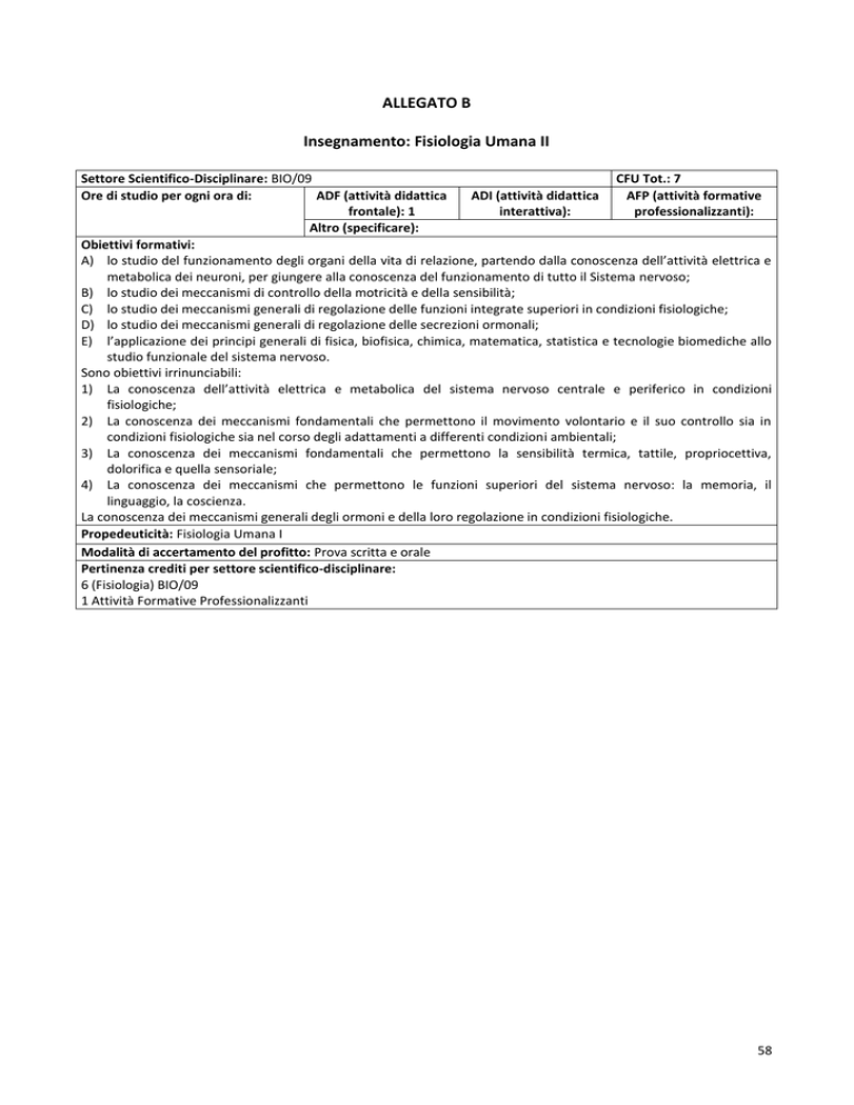 ALLEGATO B Insegnamento: Fisiologia Umana II Settore Scientifico-Disciplinare: BIO/09 CFU Tot.: 7 Ore di studio per ogni ora di: ADF (attività didattica ADI (attività didattica AFP (attività formative frontale): 1 interattiva): professionalizzanti): Altro (specificare): Obiettivi formativi: A) lo studio del funzionamento degli organi della vita di relazione, partendo dalla conoscenza dell’attività elettrica e metabolica dei neuroni, per giungere alla conoscenza del funzionamento di tutto il Sistema nervoso; B) lo studio dei meccanismi di controllo della motricità e della sensibilità; C) lo studio dei meccanismi generali di regolazione delle funzioni integrate superiori in condizioni fisiologiche; D) lo studio dei meccanismi generali di regolazione delle secrezioni ormonali; E) l’applicazione dei principi generali di fisica, biofisica, chimica, matematica, statistica e tecnologie biomediche allo studio funzionale del sistema nervoso. Sono obiettivi irrinunciabili: 1) La conoscenza dell’attività elettrica e metabolica del sistema nervoso centrale e periferico in condizioni fisiologiche; 2) La conoscenza dei meccanismi fondamentali che permettono il movimento volontario e il suo controllo sia in condizioni fisiologiche sia nel corso degli adattamenti a differenti condizioni ambientali; 3) La conoscenza dei meccanismi fondamentali che permettono la sensibilità termica, tattile, propriocettiva, dolorifica e quella sensoriale; 4) La conoscenza dei meccanismi che permettono le funzioni superiori del sistema nervoso: la memoria, il linguaggio, la coscienza. La conoscenza dei meccanismi generali degli ormoni e della loro regolazione in condizioni fisiologiche. Propedeuticità: Fisiologia Umana I Modalità di accertamento del profitto: Prova scritta e orale Pertinenza crediti per settore scientifico-disciplinare: 6 (Fisiologia) BIO/09 1 Attività Formative Professionalizzanti 58 CORSO INTEGRATO DI FISIOLOGIA UMANA II Settore Scientifico-Disciplinare: BIO/09 CFU Tot.: 6.00 Pertinenza crediti per settore scientifico disciplinare: N. ore ADF: 80 BIO/09: 6.00 N. ore ADI: 15 Coordinatore: Prof. Colantuoni Antonio, Dip.:Dipartimento di Neuroscienze, Ed.:19 Tel.:3212, [email protected]. Segreteria Didattica: Sig Giacomo Sivo, Dip.: Dipartimento di Neuroscienze, Ed.: 19, Tel.:3221 Nome e Cognome Qualifica Disciplina Tel. E-Mail Colantuoni Antonio PO Fisiologia 3212 [email protected] Mondola Paolo PO Fisiologia 3225 [email protected] Pizzuti Giovanni PO Fisiologia 3220 [email protected] Belfiore Annamaria RC Fisiologia 3638 [email protected] Gambardella Pasquale RC Fisiologia 3207 [email protected] Guida Bruna RC Fisiologia 3216 [email protected] Santangelo Franco RC Fisiologia 3228 fra [email protected] FUNZIONARI TECNICI Nome e Cognome Disciplina Tel. E-Mail Mastursi Marina Fisiologia 3223 [email protected] Santillo Rosaria Fisiologia 3233 [email protected] Sticchi Raffaella Fisiologia 3208 [email protected] Villani Angela Fisiologia 3223 [email protected] OBIETTIVI FORMATIVI A) Lo studio del funzionamento degli organi della vita di relazione, partendo dalla conoscenza dell’attività elettrica e metabolica dei neuroni, per giungere alla conoscenza del funzionamento di tutto il Sistema nervoso; B) lo studio dei meccanismi di controllo della motricità e della sensibilità; C) lo studio dei meccanismi generali di regolazione delle funzioni integrate superiori in condizioni fisiologiche; l’applicazione dei principi generali di fisica, biofisica, chimica, matematica, statistica e tecnologie biomediche allo studio funzionale del sistema nervoso e del sistema endocrino. CONTENUTI 1) 2) 3) 4) 5) La conoscenza dell’attività elettrica e metabolica del sistema nervoso centrale e periferico in condizioni fisiologiche; la conoscenza dei meccanismi fondamentali che permettono il movimento volontario e il suo controllo sia in condizioni fisiologiche sia nel corso degli adattamenti a differenti condizioni ambientali; la conoscenza dei meccanismi fondamentali che permettono la sensibilità termica, tattile, propriocettiva, dolorifica e quella sensoriale; conoscenza dei meccanismi che permettono le funzioni superiori del sistema nervoso: la memoria, il linguaggio, la coscienza; la conoscenza dei meccanismi generali degli ormoni e della loro regolazione in condizioni fisiologiche. PREREQUISITI Si richiedono conoscenze approfondite morfologiche e funzionali del sistema nervoso centrale e periferico. PROPEDEUTICITÀ Vedi Allegato B2 MODALITÀ DI ACCERTAMENTO DEL PROFITTO: prova scritta e orale 164 CALENDARIO DELL’ATTIVITA’ DIDATTICA DEL C.I. DI FISIOLOGIA UMANA II Settimana 1° 04/08 ott. 2010 2° 11/15 ott. 2010 3° 18/22 ott. 2010 4° 25/29 ott. 2010 5° 02/05 nov. 2010 6° 08/12 nov. 2010 7° 15/19 nov. 2010 8° 22/26 nov. 2010 9° 29 nov./3 dic. 2010 10° 06/10 dic. 2010 11° 13/17 dic. 2010 12° 20/23 dic. 2010 13° 10/14 gen. 2011 Giorni/Ora Lunedì 8:30-10:30 Martedì 11:30-13:30 Mercoledì 8:30-10:30 Giovedì 11:30-13:30 Lunedì 8:30-10:30 Martedì 11:30-13:30 Mercoledì 8:30-10:30 Giovedì 11:30-13:30 Lunedì 8:30-10:30 Martedì 11:30-13:30 Mercoledì 8:30-10:30 Giovedì 11:30-13:30 Lunedì 8:30-10:30 Martedì 11:30-13:30 Mercoledì 8:30-10:30 Giovedì 11:30-13:30 Lunedì 8:30-10:30 Martedì 11:30-13:30 Mercoledì 8:30-10:30 Giovedì 11:30-13:30 Lunedì 8:30-10:30 Martedì 11:30-13:30 Mercoledì 8:30-10:30 Giovedì 11:30-13:30 Lunedì 8:30-10:30 Martedì 11:30-13:30 Mercoledì 8:30-10:30 Giovedì 11:30-13:30 Lunedì 8:30-10:30 Martedì 11:30-13:30 Mercoledì 8:30-10:30 Giovedì 11:30-13:30 Lunedì 8:30-10:30 Martedì 11:30-13:30 Mercoledì 8:30-10:30 Giovedì 11:30-13:30 Lunedì 8:30-10:30 Martedì 11:30-13:30 Mercoledì 8:30-10:30 Giovedì 11:30-13:30 Lunedì 8:30-10:30 Martedì 11:30-13:30 Mercoledì 8:30-10:30 Giovedì 11:30-13:30 Lunedì 8:30-10:30 Martedì 11:30-13:30 Mercoledì 8:30-10:30 Giovedì 11:30-13:30 Lunedì 8:30-10:30 Martedì 11:30-13:30 Mercoledì 8:30-10:30 Giovedì 11:30