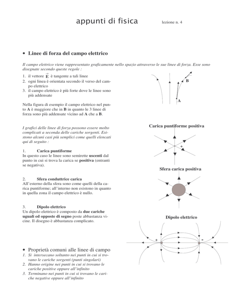 lezione n. 4 • Linee di forza del campo elettrico Il campo elettrico viene rappresentato graficamente nello spazio attraverso le sue linee di forza. Esse sono disegnate secondo queste regole : → 1. il vettore E è tangente a tali linee 2. ogni linea è orientata secondo il verso del campo elettrico 3. il campo elettrico è più forte dove le linee sono più addensate B A Nella figura di esempio il campo elettrico nel punto A è maggiore che in B in quanto le 3 linee di forza sono più addensate vicino ad A che a B. I grafici delle linee di forza possono essere molto complicati a seconda delle cariche sorgenti. Esistono alcuni casi più semplici come quelli elencati qui di seguito : Carica puntiforme positiva + 1. Carica puntiforme In questo caso le linee sono semirette uscenti dal punto in cui si trova la carica se positiva (entranti se negativa). Sfera carica positiva 2. Sfera conduttrice carica All’esterno della sfera sono come quelli della carica puntiforme; all’interno non esistono in quanto in quella zona il campo elettrico è nullo. 3. Dipolo elettrico Un dipolo elettrico è composto da due cariche uguali ed opposte di segno poste abbastanza vicine. Il disegno è abbastanza complicato. Dipolo elettrico + • Proprietà comuni alle linee di campo 1. Si intersecano soltanto nei punti in cui si trovano le cariche sorgenti (punti singolari) 2. Hanno origine nei punti in cui si trovano le cariche positive oppure all’infinito 3. Terminano nei punti in cui si trovano le cariche negative oppure all’infinito -