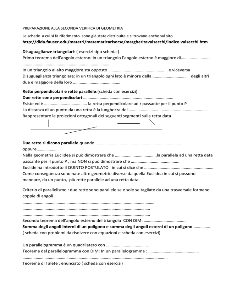 PREPARAZIONE ALLA SECONDA VERIFICA DI GEOMETRIA Le schede a cui si fa riferimento sono già state distribuite e si trovano anche sul sito http://dida.fauser.edu/matetri/matematicarisorse/margheritavalsecchi/indice.valsecchi.htm Disuguaglianze triangolari: ( esercizi tipo scheda ) Primo teorema dell’angolo esterno: in un triangolo l’angolo esterno è maggiore di……………………… …………………………………………………………………….. In un triangolo al alto maggiore sta opposto ……………………………………………… e viceversa Disuguaglianza triangolare: in un triangolo ogni lato è minore della…………………………… degli altri due e maggiore della loro …………………………………….. Rette perpendicolari e rette parallele:(scheda con esercizi) Due rette sono perpendicolari ………………………………………………………………………. Esiste ed è ………………………………… la retta perpendicolare ad r passante per il punto P La distanza di un punto da una retta è la lunghezza del …………………………………………………………….. Rappresentare le proiezioni ortogonali dei seguenti segmenti sulla retta data Due rette si dicono parallele quando …………………………………………………………………… oppure……………… Nella geometria Euclidea si può dimostrare che ………………………………..la parallela ad una retta data passante per il punto P , ma NON si può dimostrare che …………………………………….. Euclide ha introdotto il QUINTO POSTULATO in cui si dice che ……………………………………………………… Come conseguenza sono nate altre geometrie diverse da quella Euclidea in cui si possono mandare, da un punto, più rette parallele ad una retta data. Criterio di parallelismo : due rette sono parallele se e sole se tagliate da una trasversale formano coppie di angoli ………………………………………………………………………………………………………… …………………………………………………………………………………………………….. …………………………………………………………………………………………………….. Secondo teorema dell’angolo esterno del triangolo CON DIM: ……………………………….. Somma degli angoli interni di un poligono e somma degli angoli esterni di un poligono …………… ( scheda con problemi da risolvere con equazioni e scheda con esercizi) Un parallelogramma è un quadrilatero con ……………………………….. Teorema del parallelogramma con DIM: In un parallelogramma : ………………………………………. …………………………………………………………………………………………………………………… Teorema di Talete : enunciato ( scheda con esercizi)