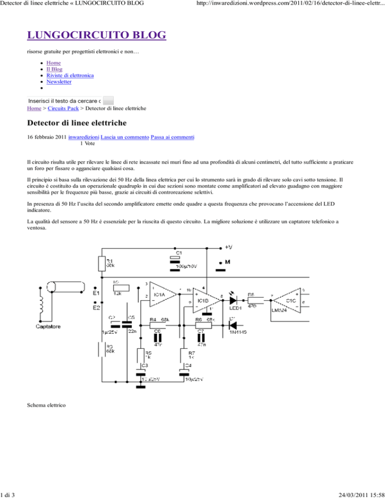 Detector di linee elettriche « LUNGOCIRCUITO BLOG 1 di 3 http://inwaredizioni.wordpress.com/2011/02/16/detector-di-linee-elettr... LUNGOCIRCUITO BLOG risorse gratuite per progettisti elettronici e non… Home Il Blog Riviste di elettronica Newsletter Home > Circuits Pack > Detector di linee elettriche Detector di linee elettriche 16 febbraio 2011 inwaredizioni Lascia un commento Passa ai commenti 1 Vote Il circuito risulta utile per rilevare le linee di rete incassate nei muri fino ad una profondità di alcuni centimetri, del tutto sufficiente a praticare un foro per fissare o agganciare qualsiasi cosa. Il principio si basa sulla rilevazione dei 50 Hz della linea elettrica per cui lo strumento sarà in grado di rilevare solo cavi sotto tensione. Il circuito è costituito da un operazionale quadruplo in cui due sezioni sono montate come amplificatori ad elevato guadagno con maggiore sensibilità per le frequenze più basse, grazie ai circuiti di controreazione selettivi. In presenza di 50 Hz l’uscita del secondo amplificatore emette onde quadre a questa frequenza che provocano l’accensione del LED indicatore. La qualità del sensore a 50 Hz è essenziale per la riuscita di questo circuito. La migliore soluzione è utilizzare un captatore telefonico a ventosa. Schema elettrico 24/03/2011 15:58 Detector di linee elettriche « LUNGOCIRCUITO BLOG 2 di 3 http://inwaredizioni.wordpress.com/2011/02/16/detector-di-linee-elettr... Articolo pubblicato nella raccolta Circuits Pack di Inware Edizioni. © Riproduzione vietata, tutti i diritti riservati. Condividi: Email Stampa Facebook Digg Reddit 1 StumbleUpon Categories: Circuits Pack Tag:elettronica, schema elettrico, LM324, 1N4148, detector, linee elettriche, detector linee elettriche Like Be the first to like this post. Commenti (0) Trackback (0) Lascia un commento Trackback 1. Non c'è ancora nessun commento. 1. No trackbacks yet. Lascia un Commento Il tuò indirizzo email non verrà pubblicato. Required fields are marked * Nome * Email * Sito web Commento You may use these HTML tags and attributes: <a href="" title=""> <abbr title=""> <acronym title=""> <b> <blockquote cite=""> <cite> <code> <pre> <del datetime=""> <em> <i> <q cite=""> <strike> <strong> 24/03/2011 15:58 Detector di linee elettriche « LUNGOCIRCUITO BLOG 3 di 3 http://inwaredizioni.wordpress.com/2011/02/16/detector-di-linee-elettr... Avvisami via e-mail della presenza di nuovi commenti a questo articolo Notificatemi di nuovi post via email Generazione di toni DTMF con AVR Grandissima offerta!!! RSS feed Google Youdao Xian Guo Zhua Xia My Yahoo! newsgator Bloglines iNezha Twitter Articoli recenti Allarme ingresso Adattatore da S-video a SCART Comunicazione dati su bus USB Auguri Italia!!! Amplificatore per cuffie Post più letti Alimentatore 12V 30A Voltmetro digitale a LCD Allarme ingresso L/C Meter Adattatore da S-video a SCART Comunicazione dati su bus USB Alimentatore con LM317 Caricabatterie per pile alcaline Amplificatore per cuffie I Flip Flop: comandare due luci con un solo pulsante Pagine web correlate Gruppo Facebook Inware Edizioni Pagina Facebook Fare Elettronica Pagina Facebook Firmware Sfoglia Firmware in formato digitale Sito web Fare Elettronica Sito web Firmware Aggiornamenti Twitter Tra poco la nostra Social Letter con un regalo IRRIPETIBLE! Non sei iscritto? Affrettati!!! http://eepurl.com/sc_L #elettronica #inware 2 hours ago SUNIX Serial-SATA soluzione per Intel P67/H67 Sandy Bridge http://bit.ly/eryU79 #elettronica #inware #intel 6 hours ago Su LungoCircuito Blog: Allarme ingresso http://bit.ly/fulqg9 - Adattatore da S-video a SCART http://bit.ly/fPpg1G #elettronica #inware 1 day ago Digi-Key Corporation distribuisce Advanced Linear Devices http://bit.ly/f1VEOp #elettronica #inware #digikey @digikey 1 day ago La Piattaforma OMAP 5 di TI trasforma il concetto di “mobile” http://bit.ly/feroWH #elettronica #inware #TXInstruments @TXInstruments 1 day ago Alto WordPress Copyright © 2010-2011 LUNGOCIRCUITO BLOG Blog su WordPress.com. Theme: INove by NeoEase. 24/03/2011 15:58