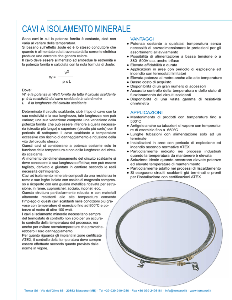 CAVI A ISOLAMENTO MINERALE Sono cavi in cui la potenza fornita è costante, cioè non varia al variare della temperatura. Si basano sull’effetto Joule ed è lo stesso conduttore che quando è alimentato ed attraversato dalla corrente elettrica produce una corrente che genera calore. Il cavo deve essere alimentato ad ambedue le estremità e la potenza fornita è calcolata con la nota formula di Joule: V2 W= ρxL Dove: W è la potenza in Watt fornita da tutto il circuito scaldante ρ è la resistività del cavo scaldante in ohm/metro L è la lunghezza del circuito scaldante Determinato il circuito scaldante, cioè il tipo di cavo con la sua resistività e la sua lunghezza, tale lunghezza non può variare; una sua variazione comporta una variazione della potenza fornita che può essere inferiore a quella necessaria (circuito più lungo) o superiore (circuito più corto) con il pericolo di sottoporre il cavo scaldante a temperature eccessive con rischio di danneggiamento e riduzione della vita del circuito stesso. Questi cavi si considerano a potenza costante solo in funzione della temperatura e non della lunghezza del circuito scaldante. Al momento del dimensionamento del circuito scaldante si deve conoscere la sua lunghezza effettiva; non può essere tagliato, derivato e giuntato in cantiere secondo le reali necessità dell’impianto. Cavi ad isolamento minerale composti da una resistenza in rame o sue leghe isolata con ossido di magnesio compresso e ricoperto con una guaina metallica ricavata per estrusione, in rame, cupronichel, acciaio, inconel, ecc. Questa struttura particolarmente robusta e con materiali altamente resistenti alle alte temperature consente l’impiego di questi cavi scaldanti nelle condizioni più gravose con temperature di esercizio fino ad 800°C e potenze al metro di oltre 100 watt. I cavi a isolamento minerale necessitano sempre del termostato di controllo non solo per un accurato controllo della temperatura del processo, ma anche per evitare sovratemperature che provocherebbero il loro danneggiamento. Per quanto riguarda gli impianti in zone certificate ATEX, il controllo della temperatura deve sempre essere effettuato secondo quanto previsto dalle norme in vigore. VANTAGGI ● Potenza costante a qualsiasi temperatura senza necessità di sovradimensionare le protezioni per gli assorbimenti all’avviamento ● Possibilità di alimentazione a bassa tensione o a 380- 500V c.a. anche trifase ● Elevata affidabilità e durata ● Applicazioni in aree con pericolo di esplosione ed incendio con termostati limitatori ● Elevata potenza al metro anche alle alte temperature ● Basso costo di acquisto ● Disponibilità di un gran numero di accessori ● Accurato controllo della temperatura e dello stato di funzionamento dei circuiti scaldanti ● Disponibilità di una vasta gamma di resistività ohm/metro APPLICAZIONI ● Mantenimento di prodotti con temperature fino a 500°C ● Antigelo anche su tubazioni di vapore con temperature di esercizio fino a 650°C ● Lunghe tubazioni con alimentazione solo ad un terminale ● Installazioni in aree con pericolo di esplosione ed incendio secondo normative ATEX ● Particolarmente indicato nei processi industriali quando la temperatura da mantenere è elevata ● Soluzione ideale quando occorrono elevate potenze ed elevate temperature di mantenimento ● Particolarmente adatto nei processi di riscaldamento ● Si eseguono circuiti scaldanti già terminati e pronti per l’installazione con certificazioni ATEX Temar Srl - Via dell’Olmo 66 - 20853 Biassono (MB) - Tel +39-039-2494256 - Fax +39-039-2495161 - [email protected] - www.temarsrl.it