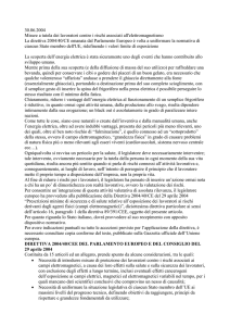 CORSO DI FORMAZIONE ASL AL 2010 Studio associato ECORAD ECOLOGIA, RADIOPROTEZIONE, PROGETTAZIONE INDUSTRIALE, SICUREZZA SUL LAVORO, IGIENE AMBIENTALE Dott. Carlo Bergamaschi Legge di Ohm : V=RI l R = ρ (Ω ) s Densità di corrente : r i ) J= n S r v J =σ ⋅E Effetto Joule : conversione dell’energia elettrica in calore in un conduttore Potenza : quantità di energia trasferita nell’unità di tempo dal campo elettrico alle cariche in movimento 2 V P = i2 ⋅ R = R (W) r⎛ A⎞ H⎜ ⎟ Campo magnetico : regione dello spazio dove si ⎝ m⎠ manifestano forze sui dipoli magnetici e sui conduttori percorsi da correnti elettriche Induzione magnetica: r r B = µH (T ) Onde elettromagnetiche : r r ∂ E 2 ∇ E − εµ 2 = 0 ∂t 2 r r ∂ B 2 ∇ B − εµ =0 2 ∂t 2 1. La frequenza condiziona la struttura del campo 2. elettromagnetico nell'intorno della sorgente, che si modifica notevolmente in funzione della distanza da essa, rapportata alla lunghezza d'onda del campo, passando - come vedremo dalla zona dei campi reattivi a quella dei campi radiativi. Il meccanismo di accoppiamento fisico tra campi ed oggetti biologici dipende in modo critico dal rapporto tra la dimensione dell'organismo esposto e la lunghezza d'onda del campo. Campo reattivo e campo radiativo Campo reattivo: campo presente vicino la sorgente; dipende dalla distribuzione di cariche e di correnti sulla sorgente , che a loro volta dipendono dalla geometria della stessa e dalle proprietà elettriche dei suoi componenti Il campo reattivo è confinato nei pressi della sorgente in un volume che si estende fino a distanze dell’ordine di frazioni λ di λ usualmente 10 Poter dire di essere nella zona di campo vicino o lontano dipende oltre che dalla distanza r dalla sorgente (o meglio, dal rapporto fra distanza e lunghezza d’onda ) anche dalle dimensioni di questa,sempre in rapporto alla lunghezza d’onda. Nella zona di campo lontano: E 1. il rapporto tra le ampiezze E ed H è costante η = H nel vuoto η è circa 377 Ω . 2. E, H e la direzione di propagazione costituiscono una terna destrorsa 3. L’intensità di un’onda sferica decresce come 12 all’aumentare r di r 1 4. E ed H decrescono come r Interazione dei campi EM con la materia vivente Meccanismi di interazione Gli organismi viventi esposti ai campi EM interagiscono con essi assorbendone energia. σ ( conducibilità ): parametro che caratterizza un materiale come conduttore di elettricità. Campo incidente: campo che sarebbe presente nella zona di spazio di interesse in assenza del corpo materiale Campo interno: campo realmente presente all’interno del corpo ed è la somma del campo incidente e di quello dovuto all’insieme delle corrente e alla ridistribuzione di cariche elettriche prodotte dal campo incidente all’interno del corpo e della sua superficie Campo interno ∝ Campo incidente Il fattore di proporzionalità cambia da punto a punto dipendendo dalle proprietà elettriche del corpo e dalla sua geometria Radiazioni non ionizzanti Per frequenze ≤ 300 GHz l’interazione dei campi EM con i sistemi materiali non può produrre variazioni permanenti di struttura atomica o molecolare perché il valore del salto energetico ∆E s necessario è di gran −3 lunga superiore all’energia del fotone ( hf = 1.2 × 10 eV ).Per quello che si può ottenere è l’eccitazione degli stati traslazionali, rotazionali e al limite , vibrazionali delle particelle. Fenomeno Energia di attivazione (eV) Frequenza corrispondente (HZ) 0.08-0.2 23×1013-4.8×1013 IR Cambio reversibile di conformazione delle proteine Rottura del legame covalente 0.4 1014 IR 5 1.2×1015 UV ionizzazione 10 2.4×1015 UV Rottura del idrogeno legame Proprietà dielettriche dei tessuti umani La definizione di costante dielettrica relativa complessa può essere fatta discendere dall’equazione di Ampere-Maxwell: r r r r ∂D ∇× H = J + ∂t r J è la densità di corrente di cariche libere e dove elettrico. Sotto le seguenti ipotesi: la densità r D di flusso 1. Il materiale con cui si ha a che fare deve essere un dielettrico (eventualmente) con perdite, condizione verificata da tutti i tessuti biologici. 2. Non devono essere presenti correnti elettriche impresse 3. Si deve essere in regime armonico sinusoidale L’equazione precedente può essere scritta nella forma r r )r ∇ × H = jωε 0 ε E Caratteristiche elettriche dei tessuti biologici Al posto della conducibilità elettrica vengono usate due quantità ad essa proporzionali σ ε = ωε 0 fattore di perdita ε" σ tan α = = ε r ωε 0 ε r tangente di perdita '' Nei tessuti biologici, l’elemento di maggior significato per le loro proprietà elettriche è l’acqua che costituisce il 70% del peso del corpo umano. È logico quindi che le caratteristiche elettriche dei vari tessuti biologici siano perfettamente correlate con la percentuale di acqua in essi contenuta. Possiamo classificare i tessuti biologici in: 1. Tessuti ad altissimo contenuto di acqua (90% o più di acqua): sangue , liquido cerebrospinale e altri liquidi organici. 2. Tessuti ad alto contenuto di acqua (circa l’80% di acqua) : pelle, muscolo, cervello,e organi interni,quali reni fegato milza ecc. 3. Tessuti a basso contenuto di acqua (acqua circa 50% e meno): grasso, tendini e ossa. L’andamento di εr e di σ del tessuto muscolare sono, a pari frequenza, più elevate di circa un ordine di grandezza rispetto a quelle del tessuto adiposo. Questo comportamento è conseguenza del fatto che, i fenomeni di polarizzazione e di conduzione sono fortemente determinati dal contenuto di acqua e che il tessuto muscolare ha una percentuale di acqua molto maggiore di quella presente nel tessuto adiposo. Propagazione e assorbimento dei campi EM nei tessuti Quando un’onda EM incide sull’interfaccia fra due mezzi materiali di caratteristiche elettromagnetiche diverse, una parte dell’energia viene riflessa mentre l’altra trasmessa. Se il mezzo è un materiale con p