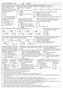 A TEST “calorimetria” data classe cognome leggi ! Rispondi alle seguenti domande. Se le risposte richiedono dei calcoli, dei disegni o delle precisazioni riportale sul foglio. Ricordati: se rispondi in modo corretto 1 punto, se non rispondi 0 punti. Infine se sbagli le domande vero-falso -1, quelle a scelta multipla -0,25.(U=energia interna; Q= calore; L=lavoro) Due masse uguali di acqua, la prima a 80°C, l’altra a 20 °C vengono mescolate. In assenza di dispersioni di calore, quale sarà la temperatura di equilibrio A. 30 ° C B. 40 ° C C. 50 ° C D. non si può calcolare perché non si conoscono le masse Due oggetti sono in equilibrio termico se hanno: A. lo stesso calore specifico B. la stessa massa C. la stessa capacità termica D. la stessa temperatura Quale grandezza fisica si mantiene costante durante un passaggio di stato: A. la temperatura della sostanza B. il volume C. la densità D. nessuna grandezza fisica rimane costante Il periodo (T) di un pendolo si calcola con la formula T l dove l è lunghezza filo, g l'accelerazione g di gravità. Se il filo è metallico, il periodo del pendolo : A. è maggiore in inverno che in estate B. è maggiore in estate che in inverno C. è sempre lo stesso durante tutto l’anno D. non si può dire nulla perché non si conosce la lunghezza Nel piano cartesiano ( V,T) una trasformazione isocora di un gas perfetto è graficamente rappresentata da una retta : A. parallela all’asse dei volumi B. passante per l’origine degli assi C. parallela all’asse delle temperature assolute Quale dei grafici seguenti illustra la legge di Boyle nel piano (P,T)? I quattro diagrammi a lato rappresentano delle trasformazioni nel piano (P,V). In quale caso abbiamo una trasformazione isobara ? = 2π Una mole di gas perfetto inizialmente nello stato (p, V,T) viene condotta nello stato (2p, 2T). Qual è il volume del gas nello stato finale A. 2V B. V C. 4V D. non si può determinare Per aumentare di 1°C la temperatura di 10 Kg d’acqua sono necessarie A. 10 cal B. 10Cal C. 1000cal D. 1000 Cal Nel piano cartesiano ( V,T) una trasformazione isobara di un gas perfetto è graficamente rappresentata da una retta : A. parallela all’asse delle pressioni B. passante per l’origine degli assi C. parallela all’asse delle temperature assolute D. non è una retta ma un ramo di iperbole Una lamina bimetallica è fatta da due Se inseriamo sotto una campana di vetro un ricciolo di Un palloncino (trattenuto da un striscioline di metalli diversi (ottone e crema da barba e iniziamo ad estrarre l'aria, possiamo peso) viene inserito all'interno di un dire che ferro) saldate o fissate l'una sull'altra. recipiente pieno d'acqua, possiamo Sapendo che l'ottone ha un coefficiente di A. la pressione diminuisce all'interno della campana dire che quando nell'acqua si dilatazione maggiore del ferro se ed il ricciolo di crema da barba aumenta di introduce del ghiaccio volume in conseguenza dell'espansione delle scaldiamo la lamina questa: A. il volume del palloncino A. si incurva dalla parte del ferro bollicine d'aria. intrappolate nella crema da barba. diminuisce B. si incurva dalla parte dell'ottone B. la pressione aumenta all'interno della campana ed B. il volume del palloncino C. si dilata semplicemente il ricciolo di crema da barba diminuisce di aumenta D. nessuna delle risposte precedenti è volume. C. il volume del palloncino rimane vera C. Non succede niente. invariato E’ più potente L'unità di misura SI Quando si fornisce calore all'acqua La quantità di calore richiesta per Quale delle una macchina del calore è durante un cambiamento di fase: cambiare di 1°C la temperatura di seguenti è l'unità che compie il A. La caloria A. si osserva un aumento della 1kg di sostanza è di misura del lavoro di: B. La kilocaloria temperatura A. Il calore specifico calore latente? A. 2000J in 1h C. Il Joule B. il calore latente di fusione e di B. Il calore latente A. °C-1 B. 6000J in 2h D. Nessuna delle vaporizzazione dell'acqua sono C. Il potere calorifico B. J/kg°C C. 8000J in 2h precedenti uguali D. L'equivalente meccanico del C. J/°C D. 1000J in 1h C. la temperatura rimane costante calore D. J/kg D. le frasi precedenti sono tutte false • • • • • • • • • • • • Nel sistema internazionale la pressione si misura in N. m V F Nel sistema internazionale il calore si misura in gradi Celsius. V F La grande caloria è un’unità di temperatura. V F Se si scioglie nell'acqua zucchero o sale la temperatura di solidificazione si abbassa. V F Quando usciamo dalla doccia se andiamo in un ambiente secco sentiamo freddo in quanto l'evaporazione dell'acqua sottrae calore al nostro corpo. V F Il calore latente di fusione è il calore necessario per fondere un certa quantità di sostanza. V F Il potere calorifico è la quantità di energia liberata per unità di massa di un combustibile durante il processo di combustione. V F Un gas può essere liquefatto se si trova ad una temperatura è inferiore alla temperatura critica. V F I processi connessi con la propagazione del calore per convezione, originati dalle differenze di densità che si manifestano per effetto delle variazioni locali di temperatura, sono sempre accompagnati da trasporto di materia. V F Durante un cambiamento di stato la temperatura del corpo aumenta V F Per l'acqua il calore latente di fusione è maggiore del calore latente di vaporizzazione V F Il punto triplo è il punto oltre il quale nessun aumento di pressione può causare la liquefazione di un gas V F