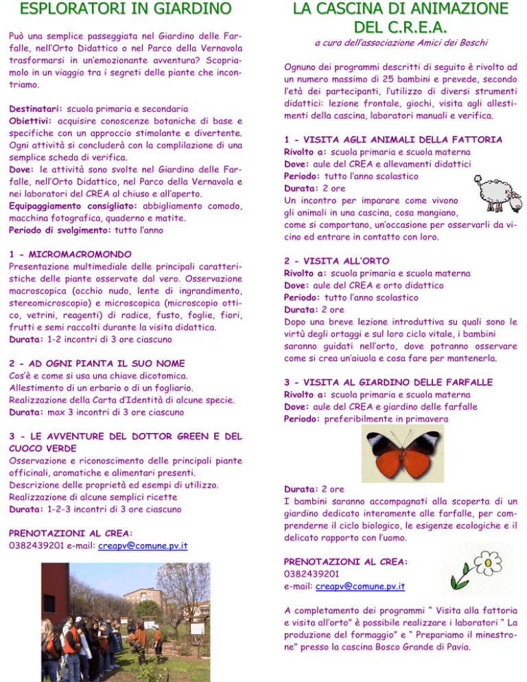 ESPLORATORI IN GIARDINO Può una semplice passeggiata nel Giardino delle Farfalle, nell’Orto Didattico o nel Parco della Vernavola trasformarsi in un’emozionante avventura? Scopriamolo in un viaggio tra i segreti delle piante che incontriamo. Destinatari: scuola primaria e secondaria Obiettivi: acquisire conoscenze botaniche di base e specifiche con un approccio stimolante e divertente. Ogni attività si concluderà con la complilazione di una semplice scheda di verifica. Dove: le attività sono svolte nel Giardino delle Farfalle, nell’Orto Didattico, nel Parco della Vernavola e nei laboratori del CREA al chiuso e all’aperto. Equipaggiamento consigliato: abbigliamento comodo, macchina fotografica, quaderno e matite. Periodo di svolgimento: tutto l’anno 1 - MICROMACROMONDO Presentazione multimediale delle principali caratteristiche delle piante osservate dal vero. Osservazione macroscopica (occhio nudo, lente di ingrandimento, stereomicroscopio) e microscopica (microscopio ottico, vetrini, reagenti) di radice, fusto, foglie, fiori, frutti e semi raccolti durante la visita didattica. Durata: 1-2 incontri di 3 ore ciascuno 2 - AD OGNI PIANTA IL SUO NOME Cos’è e come si usa una chiave dicotomica. Allestimento di un erbario o di un fogliario. Realizzazione della Carta d’Identità di alcune specie. Durata: max 3 incontri di 3 ore ciascuno 3 - LE AVVENTURE DEL DOTTOR GREEN E DEL CUOCO VERDE Osservazione e riconoscimento delle principali piante officinali, aromatiche e alimentari presenti. Descrizione delle proprietà ed esempi di utilizzo. Realizzazione di alcune semplici ricette Durata: 1-2-3 incontri di 3 ore ciascuno PRENOTAZIONI AL CREA: 0382439201 e-mail: [email protected] LA CASCINA DI ANIMAZIONE DEL C.R.E.A. a cura dell’associazione Amici dei Boschi Ognuno dei programmi descritti di seguito è rivolto ad un numero massimo di 25 bambini e prevede, secondo l’età dei partecipanti, l’utilizzo di diversi strumenti didattici: lezione frontale, giochi, visita agli allestimenti della cascina, laboratori manuali e verifica. 1 - VISITA AGLI ANIMALI DELLA FATTORIA Rivolto a: scuola primaria e scuola materna Dove: aule del CREA e allevamenti didattici Periodo: tutto l’anno scolastico Durata: 2 ore Un incontro per imparare come vivono gli animali in una cascina, cosa mangiano, come si comportano, un’occasione per osservarli da vicino ed entrare in contatto con loro. 2 - VISITA ALL’ORTO Rivolto a: scuola primaria e scuola materna Dove: aule del CREA e orto didattico Periodo: tutto l’anno scolastico Durata: 2 ore Dopo una breve lezione introduttiva su quali sono le virtù degli ortaggi e sul loro ciclo vitale, i bambini saranno guidati nell’orto, dove potranno osservare come si crea un’aiuola e cosa fare per mantenerla. 3 - VISITA AL GIARDINO DELLE FARFALLE Rivolto a: scuola primaria e scuola materna Dove: aule del CREA e giardino delle farfalle Periodo: preferibilmente in primavera Durata: 2 ore I bambini saranno accompagnati alla scoperta di un giardino dedicato interamente alle farfalle, per comprenderne il ciclo biologico, le esigenze ecologiche e il delicato rapporto con l’uomo. PRENOTAZIONI AL CREA: 0382439201 e-mail: [email protected] A completamento dei programmi “ Visita alla fattoria e visita all’orto” è possibile realizzare i laboratori “ La produzione del formaggio” e “ Prepariamo il minestrone” presso la cascina Bosco Grande di Pavia.