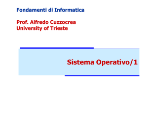 TITLE Sistemi Operativi 1 Cos'è un sistema operativo • Definizione: – Un sistema operativo è un programma che controlla l'esecuzione di programmi applicativi e agisce come interfaccia tra le applicazioni e l'hardware del calcolatore • Obiettivi di un sistema operativo: – Semplicità: Deve semplificare l’utilizzazione della macchina da parte degli utenti – Astrazione: Deve fornire una visione astratta delle risorse del calcolatore per i programmatori – Efficienza: Deve utilizzare in modo efficiente le risorse del calcolatore 2 I servizi offerti dai sistemi operativi • Esecuzione di programmi (applicativi e di sistema) • Gestione dell’accesso alla memoria (principale e secondaria) del calcolatore • Gestione dell’accesso ai dispositivi di I/O • Rilevazione e risposta agli errori • Amministrazione di utenti diversi • Controllo degli accessi • Accounting 3 Componenti di un sistema di calcolo Un sistema di calcolo può essere suddiviso in quattro componenti: • Hardware • Sistema operativo e software di sistema • Programmi applicativi • Utenti 4 Componenti di un computer system Suite per ufficio Browser Librerie Editor Compilatori Software applicativo Tool di sistema Interfaccia System Call Software di sistema Nucleo del sistema operativo Processore Memoria Dispositivi di I/O Hardware 5 Chi utilizza i sistemi operativi? • Quali sono le figure coinvolte nella realizzazione, manutenzione e uso di un sistema operativo? – Utente – Amministratore di sistema – Programmatore – Progettista di sistema operativi 6 I componenti di un sistema operativo • I principali componenti di un S.O. sono: – Gestore dei processi – Gestore della memoria principale – Gestore dei dispositivi di I/O – Gestore della memoria secondaria – Gestore del file system – Meccanismi di protezione e sicurezza 7 I componenti di un sistema operativo Nucleo del sistema operativo Gestore del processore Gestore della memoria Gestore del file system Meccanismi di protezione Gestore della memoria secondaria Gestori dei dispositivi Processore Memoria Dispositivi di I/O 8 Storia dei sistemi operativi • Generazione 0 – Charles Babbage (1792-1871) cerca di costruire un sistema meccanico programmabile (la macchina analitica) • Generazione 1 (1944-1955) – Elaboratori elettronici programmabili basati su valvole e tavole di commutazione – Progettati, programmati e usati da singoli gruppi di persone – Non avevano un vero e proprio sistema operativo • Generazione 2 (1955-1965) – Elaboratori a uso generale basati su transistor – Si crea un mercato per l’hardware e per il software – Sistemi operativi di tipo batch 9 Storia dei sistemi operativi • Generazione 3 (1965-1980) – Mini e micro elaboratori elettronici basati su circuiti integrati – Sistemi operativi interattivi – Sistemi operativi multiprogrammati e time-sharing • Generazione 4 (1980-) – Personal computer basati su circuiti ad alta integrazione – Sistemi progettati per la facilità d’uso – In generale, i sistemi operativi sono più semplici: ad esempio, i meccanismi di controllo degli accessi sono semplificati 10 Sistemi operativi moderni • Sistemi operativi Microsoft – Windows 9x-Millenium Edition – Windows NT-2000-XP-Longhorn • Sistemi operativi commerciali basati su UNIX – AIX, Solaris – MacOS X • Sistemi operativi open-source – Linux – FreeBsd, NetBsd, OpenBsd 11 Sistemi operativi speciali • L’utilizzo di sistemi operativi non è limitato a personal computer e server • Esistono un gran numero di sistemi operativi speciali, con caratteristiche a volte radicalmente diverse da quelle dei sistemi operativi classici • Alcuni esempi: – S.O. real-time – S.O. per macchine altamente parallele – S.O. per dispositivi embedded – S.O. per carte intelligenti (smart-card) 12 Sistemi operativi e interrupt • I sistemi operativi moderni sono basati sul concetto di interrupt: – Eventi hardware e software vengono notificati al processore tramite interrupt – L’arrivo di un interrupt interrompe l’attività corrente del processore e passa il controllo al sistema operativo – Il sistema operativo gestisce l’interrupt nel modo più opportuno – Il processore riprende con l’attività precedente o una nuova attività selezionata dal sistema operativo 13 Sistemi operativi e interrupt Processo utente Gestore Interrupt Interrupt 14 I processi • Definizione: processo – E' un'attività controllata da un programma che si svolge su un processore • Un processo non è un programma – Un programma è un’entità statica – Un processo è un’entità dinamica • Ad ogni istante, un processo può essere totalmente descritto dalle seguenti informazioni: – la sua immagine di memoria – la sua immagine nel processore – lo stato di avanzamento 15 Multiprogrammazione e time-sharing • Definizione: multi-programmazione – Nei periodi di I/O di un processo si eseguono altri processi • Definizione: time-sharing – L'esecuzione del processore viene suddivisa in un certo numero di quanti temporali – Allo scadere di un quanto, il processo corrente viene interrotto e l’esecuzione passa ad un altro processo • Vantaggi – Il processore non viene lasciato inattivo durante operazioni di I/O molto lunghe – Il sistema dà l’impressione di eseguire più processi contemporaneamente 16 Multiprogrammazione p1 p2 p3 I/O I/O I/O 17 Time sharing p1 p2 p3 I/O I/O 18 Stato di avanzamento di un processo • In generale, ogni processo si può trovare in uno di questi stati: – In esecuzione: il processo è in esecuzione – In attesa: il processo è in attesa di qualche evento esterno e non può essere eseguito – Pronto: il processo può essere eseguito, ma attualmente il processore è impegnato in altre attività (altri processi) Contex Switch Start In Esecuzione Pronto Terminazione Interrupt Richiesta di I/O I/O Completato Waiting 19 Gestione della memoria • Gestor