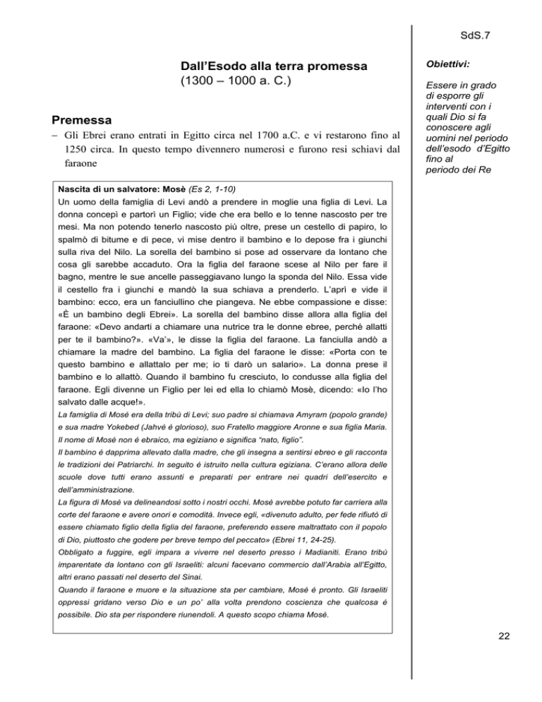 SdS.7 Dall’Esodo alla terra promessa (1300 – 1000 a. C.) Premessa − Gli Ebrei erano entrati in Egitto circa nel 1700 a.C. e vi restarono fino al 1250 circa. In questo tempo divennero numerosi e furono resi schiavi dal faraone Obiettivi: Essere in grado di esporre gli interventi con i quali Dio si fa conoscere agli uomini nel periodo dell’esodo d’Egitto fino al periodo dei Re Nascita di un salvatore: Mosè (Es 2, 1-10) Un uomo della famiglia di Levi andò a prendere in moglie una figlia di Levi. La donna concepì e partorì un Figlio; vide che era bello e lo tenne nascosto per tre mesi. Ma non potendo tenerlo nascosto più oltre, prese un cestello di papiro, lo spalmò di bitume e di pece, vi mise dentro il bambino e lo depose fra i giunchi sulla riva del Nilo. La sorella del bambino si pose ad osservare da lontano che cosa gli sarebbe accaduto. Ora la figlia del faraone scese al Nilo per fare il bagno, mentre le sue ancelle passeggiavano lungo la sponda del Nilo. Essa vide il cestello fra i giunchi e mandò la sua schiava a prenderlo. L’aprì e vide il bambino: ecco, era un fanciullino che piangeva. Ne ebbe compassione e disse: «È un bambino degli Ebrei». La sorella del bambino disse allora alla figlia del faraone: «Devo andarti a chiamare una nutrice tra le donne ebree, perché allatti per te il bambino?». «Va’», le disse la figlia del faraone. La fanciulla andò a chiamare la madre del bambino. La figlia del faraone le disse: «Porta con te questo bambino e allattalo per me; io ti darò un salario». La donna prese il bambino e lo allattò. Quando il bambino fu cresciuto, lo condusse alla figlia del faraone. Egli divenne un Figlio per lei ed ella lo chiamò Mosè, dicendo: «Io l’ho salvato dalle acque!». La famiglia di Mosè era della tribù di Levi; suo padre si chiamava Amyram (popolo grande) e sua madre Yokebed (Jahvè è glorioso), suo Fratello maggiore Aronne e sua figlia Maria. Il nome di Mosè non è ebraico, ma egiziano e significa “nato, figlio”. Il bambino è dapprima allevato dalla madre, che gli insegna a sentirsi ebreo e gli racconta le tradizioni dei Patriarchi. In seguito è istruito nella cultura egiziana. C’erano allora delle scuole dove tutti erano assunti e preparati per entrare nei quadri dell’esercito e dell’amministrazione. La figura di Mosè va delineandosi sotto i nostri occhi. Mosè avrebbe potuto far carriera alla corte del faraone e avere onori e comodità. Invece egli, «divenuto adulto, per fede rifiutò di essere chiamato figlio della figlia del faraone, preferendo essere maltrattato con il popolo di Dio, piuttosto che godere per breve tempo del peccato» (Ebrei 11, 24-25). Obbligato a fuggire, egli impara a viverre nel deserto presso i Madianiti. Erano tribù imparentate da lontano con gli Israeliti: alcuni facevano commercio dall’Arabia all’Egitto, altri erano passati nel deserto del Sinai. Quando il faraone e muore e la situazione sta per cambiare, Mosè è pronto. Gli Israeliti oppressi gridano verso Dio e un po’ alla volta prendono coscienza che qualcosa è possibile. Dio sta per rispondere riunendoli. A questo scopo chiama Mosè. 22 SdS.7 Mosè dunque venne salvato e cresciuto alla corte del faraone, ma all’età di quarant’anni, deve fuggire dall’Egitto perché ha ucciso un egiziano. − Per quarant’anni vive nel deserto di Madian presso Ietro, suo suocero, facendo il pastore. − All’età di ottant’anni, Dio gli si rivela 1° Intervento Dio sceglie Mosè per liberare il popolo ebreo (Es 3) Ora Mosè stava pascolando il gregge di Ietro, suo suocero, sacerdote di Madian, e condusse il bestiame oltre il deserto e arrivo al monte di Dio, l’Oreb. L’angelo del Signore gli apparve in una fiamma di fuoco in mezzo a un roveto. Egli guardò ed ecco: il roveto ardeva nel fuoco, ma quel roveto non si consumava. Mosè pensò: «Voglio avvicinarmi a vedere questo grande spettacolo: perché il roveto non brucia?». Il Signore vide che si era avvicinato per vedere e Dio lo chiamò dal roveto e disse: «Mosè, Mosè!». Rispose: «Eccomi!». Riprese: «Non avvicinarti! Togliti i sandali dai piedi, perché il luogo sul quale tu stai è una terra santa!». E disse: «Io sono il Dio di tuo padre, il Dio di Abramo, il Dio di Isacco, il Dio di Giacobbe». Mosè allora si velò il viso, perché aveva paura di guardare verso Dio. Il Signore disse: «Ho osservato la miseria del mio popolo in Egitto e ho udito il suo grido a causa dei suoi sorveglianti; conosco infatti le sue sofferenze. Sono sceso per liberarlo dalla mano dell’Egitto e per farlo uscire da questo paese verso un paese bello e spazioso, verso l'Amorreo, il Perizzita, l’Eveo, il Gebuseo. Ora dunque il grido degli Israeliti è arrivato fino a me e io stesso ho visto l’oppressione con cui gli Egiziani li tormentano. Ora va’! io ti mando dal faraone. Fa’ uscire dall’Egitto il mio popolo, gli Israeliti!». Mosè disse a Dio: «Chi sono io per andare dal faraone e per far uscire dall’Egitto gli Israeliti?». Rispose: « Io sarò con te. Eccoti il segno che io ti ho mandato: quando tu avrai fatto uscire il popolo dall’Egitto, servirete Dio su questo monte». Mosè disse a Dio: «Ecco io arrivo dagli Israeliti e dico loro: il Dio dei vostri padri mi ha mandato a voi. Ma mi diranno: come si chiama? E io che cosa risponderò?». Dio disse a Mosè: «Io sono colui che sono!». Poi disse: «Dirai agli Israeliti: Io-Sono mi ha mandato a voi». Dio aggiunse a Mosè: «Dirai agli Israeliti: il Signore, il Dio dei vostri padri, il Dio di Abramo, il Dio di Isacco, il Dio di Giacobbe mi ha mandato a voi. Questo è il mio nome per sempre; questo è il titolo con cui sarò ricordato di generazione in generazione. Va’! riunisci gli anziani d’Israele e dì loro: il Signore, Dio dei vostri padri, mi è apparso, il Dio di Abramo, di Isacco, d Giacobbe, dicendo: sono venuto a vedere voi e ciò che viene fatto a voi in Egitto. E ho detto: vi farò uscire dall