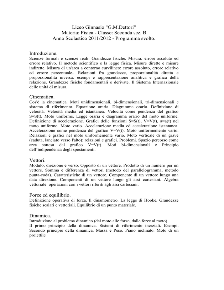 Liceo Ginnasio "G.M.Dettori" Materia: Fisica - Classe: Seconda sez. B Anno Scolastico 2011/2012 - Programma svolto. Introduzione. Scienze formali e scienze reali. Grandezze fisiche. Misura: errore assoluto ed errore relativo. Il metodo scientifico e la legge fisica. Misure dirette e misure indirette. Misura di un'area a contorno curvilineo: errore assoluto, errore relativo ed errore percentuale.. Relazioni fra grandezze, proporzionalità diretta e proporzionalità inversa: esempi e rappresentazione analitica e grafica della relazione. Grandezze fisiche fondamentali e derivate. Il Sistema Internazionale delle unità di misura. Cinematica. Cos'è la cinematica. Moti unidimensionali, bi-dimensionali, tri-dimensionali e sistema di riferimento. Equazione oraria. Diagramma orario. Definizione di velocità. Velocità media ed istantanea. Velocità come pendenza del grafico S=S(t). Moto uniforme. Legge oraria e diagramma orario del moto uniforme. Definizione di accelerazione. Grafici delle funzioni S=S(t), V=V(t), a=a(t) nel moto uniforme. Moto vario. Accelerazione media ed accelerazione istantanea. Accelerazione come pendenza del grafico V=V(t). Moto uniformemente vario. Relazioni e grafici nel moto uniformemente vario. Moto verticale di un grave (caduta, lanciato verso l'alto): relazioni e grafici. Problemi. Spazio percorso come area sottesa dal grafico V=V(t). Moti bi-dimensionali e Principio dell’indipendenza degli spostamenti. Vettori. Modulo, direzione e verso. Opposto di un vettore. Prodotto di un numero per un vettore. Somma e differenza di vettori (metodo del parallelogramma, metodo punta-coda). Caratteristiche di un vettore. Componente di un vettore lungo una data direzione. Componenti di un vettore lungo gli assi cartesiani. Algebra vettoriale: operazioni con i vettori riferiti agli assi cartesiani. Forze ed equilibrio. Definizione operativa di forza. Il dinamometro. La legge di Hooke. Grandezze fisiche scalari e vettoriali. Equilibrio di un punto materiale. Dinamica. Introduzione al problema dinamico (dal moto alle forze, dalle forze al moto). Il primo principio della dinamica. Sistemi di riferimento inerziali. Esempi. Secondo principio della dinamica. Massa e Peso. Piano inclinato. Moto di un proiettile