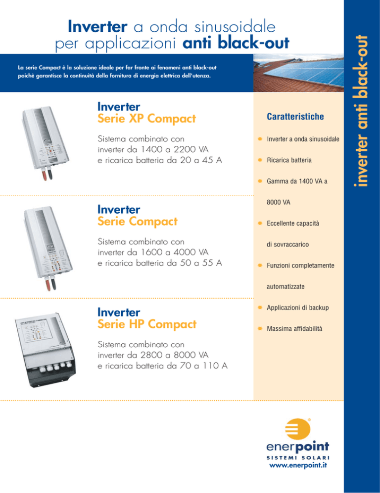 La serie Compact è la soluzione ideale per far fronte ai fenomeni anti black-out poichè garantisce la continuità della fornitura di energia elettrica dell'utenza. Inverter Serie XP Compact Sistema combinato con inverter da 1400 a 2200 VA e ricarica batteria da 20 a 45 A Caratteristiche ✹ Inverter a onda sinusoidale ✹ Ricarica batteria ✹ Gamma da 1400 VA a Inverter Serie Compact Sistema combinato con inverter da 1600 a 4000 VA e ricarica batteria da 50 a 55 A 8000 VA ✹ Eccellente capacità di sovraccarico ✹ Funzioni completamente automatizzate Inverter Serie HP Compact ✹ Applicazioni di backup ✹ Massima affidabilità Sistema combinato con inverter da 2800 a 8000 VA e ricarica batteria da 70 a 110 A www.enerpoint.it inverter anti black-out Inverter a onda sinusoidale per applicazioni anti black-out XP COMPACT Inverter Tensione nominale batteria Range tensione d'ingresso Potenza continuativa @ 25°C (potenza nominale) Massima potenza per 30 min @ 25°C Massima potenza per 5 sec. Massimo carico Massimo carico asimmetrico Regolazione Standby Cos φ Efficienza massima Consumo OFF/Stanby/ON Tensione d'uscita Frequenza d'uscita con controllo a cristallo Distorsione armonica totale Comportamento dinamico con variazione di carico da 0 a 100% Sovraccarico e protezione dal corto circuito Protezione da surriscaldamento Carica Batteria (4 FASI) I-U-Uo-Equalize (ogni 25 cicli) Regolazione della corrente di carica Regolazione bilanciata della corrente d'ingresso (power sharing) Massima tensione d'ingresso Minima tensione d'ingresso Frequenza d'ingresso Correzione del fattore di potenza (PFC) Caricatore solare opzionale (4 stadi) I-U-Uo-Equalize (ogni 25 cicli) Massima tensione PV a circuito aperto (Uoc) Massima corrente di carica (A) Principio di funzionamento: I-U-Uo-Equalize (ogni 25 cicli) Controllo batteria (soglia e tentativi regolabili dagli utenti) Tempo di assorbimento Tensione di fine carica del ciclo Tensione tampone Equalizzazione della tensione Protezione da scarica profonda Compensazione della temperatura (CT-35 opzionale) Dati generali Contatto multifunzione - Potenziale libero (3 punti) Massima corrente sul relay di trasferimento Tempo di trasferimento Peso Dimensioni l x b x h [mm] Indice di protezione IP 20 Conformità norme CEE Range temperatura di funzionamento Ventilazione Livello acustico senza/con ventilazione Garanzia Opzioni Regolatore carica solare (XPC & Compact) Controllo remoto (112 x 138 x 25 mm / lunghezza massima cavo 20 m) Distribuzione potenza da remoto (lunghezza massima cavo 20 m) Contenitore IP-23 (XPC & Compact) Rivestimento cavo AC (XPC & Compact) Sensore di temperatura della batteria (58 x 51,5 x 22 mm / 3 m di cavo) COMPACT HP COMPACT XPC1400-12 XPC2200-24 XPC2200-48 C1600-12 C2600-24 C4000-48 HPC2800-12 HPC4400-24 HPC6000-48 HPC8000-48 12 V 9,5 - 16 V 1100 VA 1400 VA 24 V 19 - 32 V 1600 VA 2200 VA 48 V 38 - 64 V 1600 VA 2200 VA 12 V 9,5 - 16 V 1300 VA 1600 VA 24 V 19 - 32 V 2300 VA 2600 VA 48 V 38 - 64 V 3500 VA 4000 VA 12 V 9,5 - 17 V 2500 VA 2800 VA 24 V 19 - 34 V 4000 VA 4400 VA 48 V 38 - 68 V 5000 VA 6000 VA 48 V 38 - 68 V 7000 VA 8000 VA 94% 1,7/2/16 W 2/2,5/18 W 2/3/30 W 0 - 70 A 0 - 90 A 1 - 50 A 94% 0,5/0,6/4 W 3 x Pnom fino al corto circuito fino a Pcont. da 1 a 25 W 0,1 - 1 95% 94% 93% 0,5/0,6/6 W 0,8/0,9/9 W 1,4/1,8/10 W 1,2/1,4/12 W 230 Vca (- 10% / 0) 50 Hz +/- 0,05% < 2% 0,5 ms Disconnessione automatica con 3 tentativi di restart Avvertimento acustico prima dello spegnimento con restart automatico 95% 0,8/0,9/7 W 1,2/1,3/7 W 0 - 37 A - 0 - 20 A < 4% 0 - 45 A 0 - 55 A 0 - 55 A 1 - 16 A 0 - 50 A 0 - 110 A 0 - 100 A 1 - 30 A 14,4 V 13,6 V 15,6 V 10,8 V 28,8 V 27,2 V 31,2 V 21,6 V 96% 265 Vac Regolazione da 150 a 230 Vca 45 - 65 Hz EN 61000-3-2 25 V 30 A 45 V 30 A 90 V 20 A 25 V 30 A 45 V 30 A 90 V 20 A Shunt 14,4 V 13,6 V 15,6 V 10,8 V 16A / 3,7 kVA 11,7 kg XPC / C xxx-S RCC-01 RPS-01 C-IP23 CFC-01 CT-35 28,8 V 27,2 V 31,2 V 21,6 V 57,6 V 54,4 V 62,4 V 43,2 V 14,4 V 13,6 V 15,6 V 10,8 V 0-4h 28,8 V 57,6 V 27,2 V 54,4 V 31,2 V 62,4 V 21,6 V 43,2 V - 3 mV/ °C / cell 16 A - 250 Vca 16A / 3,7 kVA 16A / 3,7 kVA 30A / 6,9 kVA < 20 ms 39 kg 16 kg 33 kg 17,1 kg 29,4 kg 12,6 kg 410 / 215 / 124 480 / 215 / 124 670 / 215 / 124 480 / 288 / 242 IP 23 con contenitore CxxxxIP 23 IP 23 EN 61000-6-1, EN 61000-6-3, EN 55014, EN 55022, EN 61000-3-2, Dir. 89/336/EEC, LVD 73/23/EEC da - 20 a 55 °C da 45 °C < 10 dB / < 35 dB 2 anni 16A / 3,7 kVA 16A / 3,7 kVA 57,6 V 54,4 V 62,4 V 43,2 V 50A / 11,5 kVA 16A / 3,7 kVA 41 kg 45 kg 500 / 288 / 242 Questi dati sono solo informativi e potrebbero essere soggetti a modifiche senza preavviso.