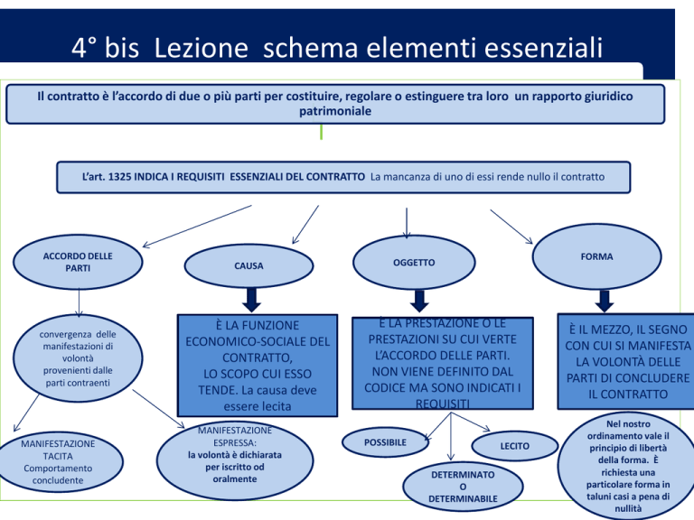 4° bis Lezione schema elementi essenziali Il contratto è l’accordo di due o più parti per costituire, regolare o estinguere tra loro un rapporto giuridico patrimoniale L’art. 1325 INDICA I REQUISITI ESSENZIALI DEL CONTRATTO La mancanza di uno di essi rende nullo il contratto ACCORDO DELLE PARTI convergenza delle manifestazioni di volontà provenienti dalle parti contraenti MANIFESTAZIONE TACITA Comportamento concludente CAUSA È LA FUNZIONE ECONOMICO-SOCIALE DEL CONTRATTO, LO SCOPO CUI ESSO TENDE. La causa deve essere lecita MANIFESTAZIONE ESPRESSA: la volontà è dichiarata per iscritto od oralmente FORMA OGGETTO È LA PRESTAZIONE O LE PRESTAZIONI SU CUI VERTE L’ACCORDO DELLE PARTI. NON VIENE DEFINITO DAL CODICE MA SONO INDICATI I REQUISITI POSSIBILE LECITO DETERMINATO O DETERMINABILE È IL MEZZO, IL SEGNO CON CUI SI MANIFESTA LA VOLONTÀ DELLE PARTI DI CONCLUDERE IL CONTRATTO Nel nostro ordinamento vale il principio di libertà della forma. È richiesta una particolare forma in 1 di taluni casi a pena nullità 4 bis° Lezione schema di conclusione del contratto ACCORDO DELLE PARTI convergenza delle manifestazioni di volontà provenienti dalle parti contraenti MANIFESTAZIONE ESPRESSA: la volontà è dichiarata per iscritto od oralmente MANIFESTAZIONE TACITA : quando ci si comporta in modo che implica la volontà di contrarre (comportamento concludente) Di seguito lo schema semplificativo proposto dal legislatore: PROPOSTA è la dichiarazione con cui la parte che assume l’iniziativa offre, all’altra, la conclusione del contratto (La proposta può essere revocata finché il contratto non sia stato concluso) . Se l’altra parte accetta, il contratto si conclude. Deve contenere gli elementi essenziali del contratto altrimenti è un INVITO A PROPORRE ACCETTAZIONE: atto nel quale si esprime la volontà di vincolarsi al contenuto della proposta. L’accettazione deve corrispondere esattamente alla proposta altrimenti diventa L’accettazione deve giungere al proponente nel termine da lui stabilito, o, in mancanza, entro un tempo adeguato secondo la natura dell’affare o gli usi (art 1326 2°comma). Il contratto si considera concluso quando il proponente viene a conoscenza dell'accettazione dell'altra parte. La conoscenza si presume nel momento in cui la dichiarazione giunge all'indirizzo del destinatario Teoria della cognizione L’ACCETTAZIONE Può ESSERE REVOCATA PRIMA CHE GIUNGA AL PROPONENTE, CONTROPROPOSTA CHE DEVE ESSERE ACCETTATA DALLA CONTROPARTE 2 4 bis° Lezione GLI ELEMENTI DEL CONTRATTO: L’ACCORDO CONTRATTI CONSENSUALI E REALI Lo schema dell’art 1326 non vale per tutti i contratti. E’ opportuno distinguere tra CONTRATTI CONSENSUALI che si perfezionano (e quindi si concludono) nel momento in cui si è raggiunto il consenso CONTRATTI REALI Si perfezionano nel momento in cui la cosa oggetto del contratto viene consegnata. Per questi contratti c'è quindi bisogno di: consenso + consegna. (mutuo, deposito, comodato) 3 4bis° Lezione GLI ELEMENTI DEL CONTRATTO: L’ACCORDO CONTRATTI CONSENSUALI RIENTRANO IN QUESTI CONTRATTI CONTRATTI CONTRATTI che attuano il trasferimento della proprietà di una cosa determinata che hanno ad oggetto il trasferimento o la costituzione di diritti reali CONTRATTI che attuano il trasferimento di altri tipi di diritti diversi da quelli reali (art. 1376 c.c.) 4 4° Lezione GLI ELEMENTI DEL CONTRATTO: L’ACCORDO UNA PROPOSTA PUÒ ESSERE RESA IRREVOCABILE PER VOLONTÀ DEL PROPONENTE: ll proponente può rendere irrevocabile la proposta per un certo tempo. La proposta rimane irrevocabile anche nel caso di morte o sopravvenuta incapacità del proponente, a meno che la natura dell'affare o altre circostanze la rendano revocabile. PER UN PRECEDENTE ACCORDO DELLE PARTI(DIRITTO DI OPZIONE) Nasce da un precedente accordo che ha ad oggetto un futuro contratto. Le parti convengono che una parte formuli la proposta contrattuale, mentre l'altra sia libera di accettarla o meno entro il termine stabilito. La proposta formulata si considera irrevocabile a norma dell'art. 1329 c.c 5