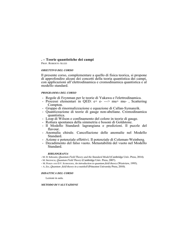 . – Teorie quantistiche dei campi PROF. ROBERTO AUZZI OBIETTIVO DEL CORSO Il presente corso, complementare a quello di fisica teorica, si propone di approfondire alcuni dei concetti della teoria quantistica dei campi, con applicazioni all’elettrodinamica e cromodinamica quantistica e al modello standard. PROGRAMMA DEL CORSO - Regole di Feynman per le teorie di Yukawa e l'elettrodinamica. - Processi elementari in QED: e+ e- ---> mu+ mu- , Scattering Compton. - Gruppo di rinormalizzazione e equazione di Callan-Symanzik. - Quantizzazione di teorie di gauge non-abeliane. Cromodinamica quantistica. - Loop di Wilson e confinamento del colore in teorie di gauge. - Rottura spontanea della simmetria e bosoni di Goldstone. - Il Modello Standard: lagrangiana e predizioni. Il puzzle del flavour. - Anomalia chirale. Cancellazione delle anomalie nel Modello Standard. - Azione e potenziale effettivi. Il potenziale di Coleman-Weinberg. - Decadimento del falso vuoto. Metastabilità del vuoto nel Modello Standard. BIBLIOGRAFIA - M. D. Schwartz, Quantum Field Theory and the Standard Model (Cambridge Univ. Press, 2014). - M. SREDNICKI, Quantum Field Theory (Cambridge Univ. Press, 2007). - M. PESKIN AND D.V. SCHROEDER, An introduction to quantum field theory (Westview, 1995). - A. ZEE, Quantum field theory in a nutshell (Princeton University Press, 2010). DIDATTICA DEL CORSO Lezioni in aula. METODO DI VALUTAZIONE Esame orale. La prova orale intende accertare l’assimilazione dei concetti esposti durante il corso, e verterà nella discussione e esposizione da parte del candidato di alcuni approfondimenti su vari punti del programma. La valutazione della prova orale terrà conto della correttezza delle risposte, del loro rigore logico e metodologico, e della efficacia della esposizione. AVVERTENZE Il Prof. Roberto Auzzi riceverà gli studenti dopo le lezioni.