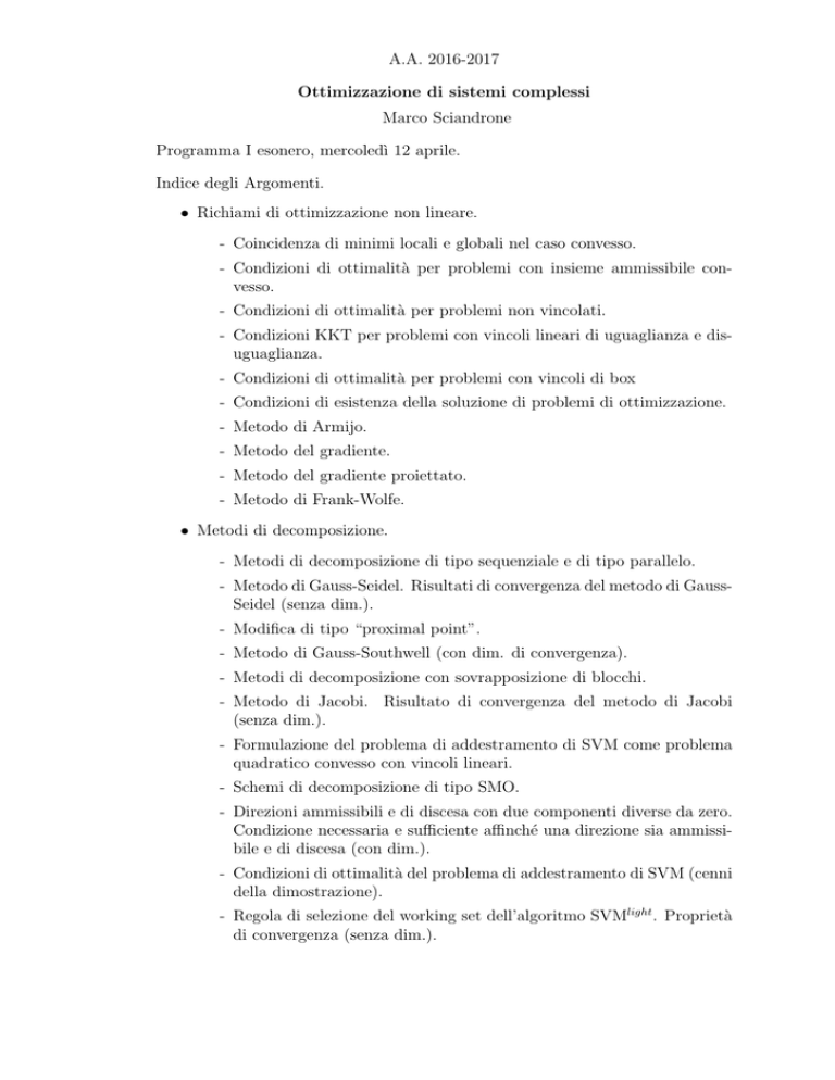A.A. 2016-2017 Ottimizzazione di sistemi complessi Marco Sciandrone Programma I esonero, mercoledı̀ 12 aprile. Indice degli Argomenti. • Richiami di ottimizzazione non lineare. - Coincidenza di minimi locali e globali nel caso convesso. - Condizioni di ottimalità per problemi con insieme ammissibile convesso. - Condizioni di ottimalità per problemi non vincolati. - Condizioni KKT per problemi con vincoli lineari di uguaglianza e disuguaglianza. - Condizioni di ottimalità per problemi con vincoli di box - Condizioni di esistenza della soluzione di problemi di ottimizzazione. - Metodo di Armijo. - Metodo del gradiente. - Metodo del gradiente proiettato. - Metodo di Frank-Wolfe. • Metodi di decomposizione. - Metodi di decomposizione di tipo sequenziale e di tipo parallelo. - Metodo di Gauss-Seidel. Risultati di convergenza del metodo di GaussSeidel (senza dim.). - Modifica di tipo “proximal point”. - Metodo di Gauss-Southwell (con dim. di convergenza). - Metodi di decomposizione con sovrapposizione di blocchi. - Metodo di Jacobi. Risultato di convergenza del metodo di Jacobi (senza dim.). - Formulazione del problema di addestramento di SVM come problema quadratico convesso con vincoli lineari. - Schemi di decomposizione di tipo SMO. - Direzioni ammissibili e di discesa con due componenti diverse da zero. Condizione necessaria e sufficiente affinché una direzione sia ammissibile e di discesa (con dim.). - Condizioni di ottimalità del problema di addestramento di SVM (cenni della dimostrazione). - Regola di selezione del working set dell’algoritmo SVMlight . Proprietà di convergenza (senza dim.). - Criterio d’arresto dell’algoritmo SVMlight . • Clustering e metodi di decomposizione. - Tralasciare Proposizione 1. • Giochi ed equilibri di Nash. - Notazione e definizioni principali di giochi. Equilibrio di Nash. - Condizione necessaria e sufficiente di esistenza dell’equilibrio di Nash nel caso di giochi finiti e antagonisti (con dim). - Condizioni sufficienti di esistenza dell’equilibrio di Nash nel caso di giochi infiniti (senza dim.). - Algoritmi di tipo best-response. - Equivalenza con disequazioni variazionali (con dim.). - Problemi di equilibrio di Nash generalizzato.