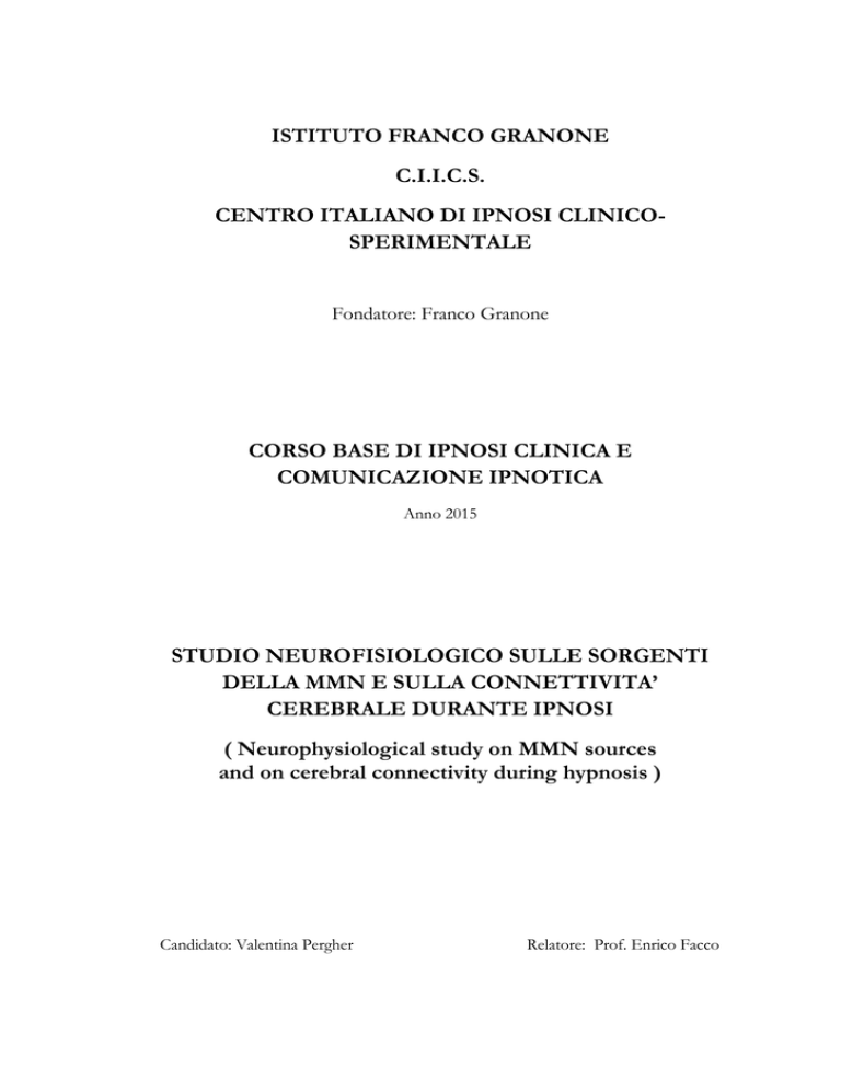 ISTITUTO FRANCO GRANONE C.I.I.C.S. CENTRO ITALIANO DI IPNOSI CLINICOSPERIMENTALE Fondatore: Franco Granone CORSO BASE DI IPNOSI CLINICA E COMUNICAZIONE IPNOTICA Anno 2015 STUDIO NEUROFISIOLOGICO SULLE SORGENTI DELLA MMN E SULLA CONNETTIVITA’ CEREBRALE DURANTE IPNOSI ( Neurophysiological study on MMN sources and on cerebral connectivity during hypnosis ) Candidato: Valentina Pergher Relatore: Prof. Enrico Facco 2 Sommario ABSTRACT............................................................................................................................ 5 1. INTRODUZIONE ........................................................................................................... 6 1.1. ELETTROENCEFALOGRAMMA ............................................................................. 7 1.1.1. Generalità e basi neurofisiologiche ............................................................ 7 1.1.2. Ritmi cerebrali ............................................................................................. 7 1.1.3. Montaggio e posizionamento elettrodi ...................................................... 8 1.1.4. Stima delle sorgenti corticali e problema inverso EEG ............................. 10 1.1.5. Connettività............................................................................................... 11 1.2. POTENZIALI EVOCATI ........................................................................................ 14 1.2.1. Generalità.................................................................................................. 14 1.2.2. Denominazione delle componenti e registrazione ................................... 15 1.2.3. Classificazione dei potenziali..................................................................... 16 1.3. L’IPNOSI ............................................................................................................. 24 1.3.1. Introduzione .............................................................................................. 24 1.3.2. Definizione ................................................................................................ 25 1.3.3. Etimologia ....................................................................................................... 25 1.3.3. Storia ......................................................................................................... 26 1.3.4. Fenomenologia dell’ipnosi ........................................................................ 27 1.3.5. Modificazioni neuro-psico-fisiologiche ..................................................... 28 1.3.6. Neuropsicologia ........................................................................................ 29 1.3.7. Scale di ipnotizzabilità e tecniche ipnotiche ............................................. 31 1.3.8. Neurofisiologia .......................................................................................... 34 2. SCOPO DELLO STUDIO............................................................................................... 42 3. MATERIALI E METODI................................................................................................ 43 3.1. Popolazione....................................................................................................... 43 3.2. Procedure .......................................................................................................... 44 3.3. MMN ................................................................................................................. 44 3.3.1. Stimolazione MMN ................................................................................... 44 3.3.2. Montaggio, registrazione ed averaging MMN .......................................... 45 3.4. EEG .................................................................................................................... 45 3.4.1. Montaggio e registrazione ........................................................................ 46 3.5. Protocollo ipnotico............................................................................................ 46 3.6. Analisi dei dati ................................................................................................... 46 3.6.1. Software LORETA ...................................................................................... 47 3 4. RISULTATI .................................................................................................................. 49 4.1. 4.1.1. Seduta di ipnosi ......................................................................................... 49 4.1.2. Seduta in bianco ........................................................................................ 51 4.2. Analisi di sorgente (LORETA) ............................................................................. 52 4.2.1. Sessione di ipnosi ...................................................................................... 52 4.2.2. Sessione in bianco ..................................................................................... 53 4.3. 5. Analisi della risposta MMN in Cz ....................................................................... 49 Connettività (LORETA) ....................................................................................... 54 4.3.1. Banda DELTA ............................................................................................. 54 4.3.2. Banda THETA ............................................................................................. 54 4.3.3. Banda ALFA 1............................................................................................. 55 4.3.4. Banda ALFA 2............................................................................................. 55 4.3.5. Banda BETA 1 ............................................................................................ 56 DISCUSSIONE ...........................................................................................................