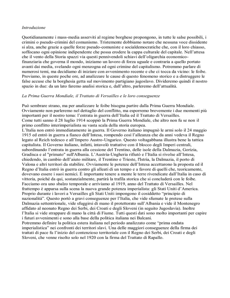 Introduzione Quotidianamente i mass-media asserviti al regime borghese propongono, in tutte le salse possibili, i crimini o pseudo-crimini del comunismo. Tristemente dobbiamo notare che nessuna voce dissidente si alza, anche grazie a quelle forze pseudo-comuniste e socialdemocratiche che, con il loro chiasso, soffocano ogni opinione indipendente che possa erodere la cappa culturale del capitale. Nell’attesa che il vento della Storia spazzi via questi pennivendoli schiavi dell’oligarchia economicofinanziaria che governa il mondo, iniziamo un lavoro di forza uguale e contraria a quello portato avanti dai media, svelando ogni menzogna ed ogni crimine del capitalismo. Potremmo parlare di numerosi temi, ma decidiamo di iniziare con avvenimento recente e che ci tocca da vicino: le foibe. Proviamo, in queste poche ore, ad analizzare le cause di questo fenomeno storico e a distruggere le false accuse che la borghesia getta sul movimento partigiano jugoslavo. Divideremo quindi il nostro spazio in due: da un lato faremo analisi storica e, dall’altro, parleremo dell’attualità. La Prima Guerra Mondiale, il Trattato di Versailles e le loro conseguenze Può sembrare strano, ma per analizzare le foibe bisogna partire dalla Prima Guerra Mondiale. Ovviamente non parleremo nel dettaglio del conflitto, ma esporremo brevemente i due momenti più importanti per il nostro tema: l’entrata in guerra dell’Italia ed il Trattato di Versailles. Come tutti sanno il 28 luglio 1914 scoppiò la Prima Guerra Mondiale, che altro non fu se non il primo conflitto interimperialista su vasta scala della storia europea. L’Italia non entrò immediatamente in guerra. Il Governo italiano impugnò le armi solo il 24 maggio 1915 ed entrò in guerra a fianco dell’Intesa, rompendo così l’alleanza che da anni vedeva il Regno legato al Reich tedesco e all’Impero Austro-Ungarico. Questo voltagabbana illustra bene la tattica capitalista. Il Governo italiano, infatti, intavolò trattative con il blocco degli Imperi centrali, subordinando l’entrata in guerra alla cessione del Trentino, delle isole della Dalmazia, Gorizia, Gradisca e al "primato" sull'Albania. L’Austria-Ungheria rifiutò e l’Italia si rivolse all’Intesa, chiedendo, in cambio dell’aiuto militare, il Trentino e Trieste, l'Istria, la Dalmazia, il porto di Valona e altri territori da stabilire. Ovviamente le potenze dell’Intesa accettarono la proposta ed il Regno d’Italia entrò in guerra contro gli alleati di un tempo e a favore di quelli che, teoricamente, dovevano essere i suoi nemici. È importante tenere a mente le terre rivendicate dall’Italia in caso di vittoria, poiché da qui, sostanzialmente, partirà la trafila storica che si concluderà con le foibe. Facciamo ora uno sbalzo temporale e arriviamo al 1919, anno del Trattato di Versailles. Nel frattempo è apparsa sulla scena la nuova grande potenza imperialista: gli Stati Uniti d’America. Proprio durante i lavori a Versailles gli Stati Uniti impongono il cosiddetto “principio di nazionalità”. Questo portò a gravi conseguenze per l’Italia, che vide sfumate le pretese sulla Dalmazia settentrionale, vide sfuggirsi di mano il protettorato sull’Albania e vide il Montenegro affidato al neonato Regno dei Serbi, dei Croati e degli Sloveni (in seguito Jugoslavia). Inoltre l’Italia si vide strappare di mano la città di Fiume. Tutti questi dati sono molto importanti per capire i futuri avvenimenti e sono alla base della politica italiana nei Balcani. Potremmo definire la politica estera italiana nel periodo analizzato come “prima ondata imperialistica” nei confronti dei territori slavi. Una delle maggiori conseguenze della firma dei trattati di pace fu l’inizio del contenzioso territoriale con il Regno dei Serbi, dei Croati e degli Sloveni, che venne risolto solo nel 1920 con la firma del Trattato di Rapallo. I territori annessi alla fine della Prima Guerra Mondiale erano territori italiani? Il nostro compito ora, come detto poco fa, è quello di svelare le menzogne create ad arte dalla borghesia. Ecco che ci troviamo subito di fronte alla prima grande mistificazione storica. Cosa ci dicono fascisti, nazionalisti e altra feccia simile? Essi continuano a ripetere: “I territori annessi dopo la Prima Guerra Mondiale erano territori italiani!”. Purtroppo molta gente crede ancora a questa affermazione, si impone quindi una spiegazione. I territori conquistati dall’imperialismo italiano non erano assolutamente “italici” né, tanto meno, abitati in maggioranza da italiani. Per rendersene conto basta guardare una cartina etnica, per esempio quella redatta da Cesare Battisti nel 1915 e pubblicata nel 1920 dall’Istituto Geografico De Agostini. Riferendosi al 1910 l’autore nota che la popolazione della Venezia Giulia era così ripartita: - italiani: 43,09% sloveni: 32,23% croati: 20,64% tedeschi: 3.30% tot. popolazione slava: 52,87% mentre per l’Istria la popolazione era così ripartita: - italiani: 35,15% sloveni: 14,27% croati: 43,52% tedeschi: 3,51% tot. popolazione slava: 57,79% L’avvento del fascismo, l’italianizzazione dei territori slavi e la politica imperialistica nei confronti della Jugoslavia Altro balzo storico. 1922, marcia su Roma: il fascismo prende il potere. Con l’avvento del fascismo inizia quella che possiamo definire “seconda ondata imperialista contro la Jugoslavia”. Ma cos’è il fascismo? La versione che oggi va per la maggiore è che il fascismo è nato come reazione della piccola e media borghesia contro la grande borghesia finanziaria. Ciò è errato: come insegna il rapporto del VII Congresso dell’Internazionale Comunista il fascismo “ non è né un potere al di sopra delle classi, né il potere della piccola borghesia o del sottoproletariato sul capitale finanziario. Il fascismo è il potere dello stesso capitale finanziario. È la organizzazione della repressione terroristica contro la classe operaia e contro la parte riv