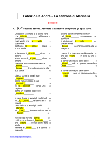 CHAPTER FOUR Soluzioni Attività 1 The title of this poem is «I soldati» In the discussion elicit from the students the different ways in which the elements of the poem could be combined, the lines could appear in any order and still make sense. The inversion of the sentence strengthens the imagery as the reader is left with the image of leaves inevitably being blown from the trees, lifeless with nobody mourning them. The lines that the students are asked to look at have a different number of syllables. Il sole splende 5 syllables La luce avvolge 6 syllables D’altronde le onde 6 syllables Ci cantano le favole 8 syllables. Attività 2 Number of syllables in parenthesis is indicated after each line of the poem. Onomatopoeia indicated in bold. Eugenio Montale da Ossi di seppia Meriggiare pallido e assorto presso un rovente muro d’orto, ascoltare tra i pruni e gli sterpi schiocchi di merli, frusci di serpi. Nelle crepe del suolo o su la veccia spiare le file di rosse formiche ch’ora si rompono ed ora s’intrecciano a sommo di minuscole biche. Osservare tra frondi il palpitare lontano di scaglie di mare mentre si levano tremuli scricchi di cicale dai calvi picchi. E andando nel sole che abbaglia sentire con triste meraviglia com’è tutta la vita e il suo travaglio in questo seguitare una muraglia che ha in cime cocci agissi di bottiglia. Eugenio Montale da «Ossi di seppia» p. 534 Meriggiare pallido e assorto (11) presso un rovente muro d’orto, (10) ascoltare tra i pruni e gli sterpi (11) schiocchi di merli, frusci di serpi. (10) Nelle crepe del suolo o su la veccia (12) spiare le file di rosse formiche (12) ch’ora si rompono ed ora s’intrecciano (13) a sommo di minuscole biche. (10) Osservare tra frondi il palpitare (12) lontano di scaglie di mare (9) mentre si levano tremuli scricchi (11) di cicale dai calvi picchi. (9) E andando nel sole che abbaglia (11) sentire con triste meraviglia (10) com’è tutta la vita e il suo travaglio (14) in questo seguitare una muraglia (12) che ha in cime cocci agissi di bottiglia. (14) © Theresa Oliver-Federici 2008 rimbombare tonfo scricchiolare squillo cinguetta sbattere ticchettare fuoco terra cielo acqua il tempo piante/fiori una voce, un grido, uno sparo… qualcosa pesante che cade nell’acqua – una roccia, un corpo… i cardini, una porta, un pavimento di legno, una sedia mentre ci si siede… telefono, campanello da casa, trombe … uccelli, bambini, persone... porta, finestra … computer, macchina da scrivere, tacchi, orologio… il fuoco della passione; il fuoco dell’ira; il fuoco nello stomaco; occhi di fuoco; avere un fuoco negli occhi... sentirsi a terra; avere i piedi per terra... avere la testa tra le nuvole; sembrare caduto/a dalle nuvole... acqua cheta; acqua marcia... al tempo in cui Berta filava; tempo da lupi; tempi di magra; sfogliare la margherita; fresco come una rosa; Attività 3 All are false. The correct words are: 1. pero 2. meta 3. papà 4. provino 5. subito 6. pésca 7. capitano pèro pear tree mèta goal pàpa pope pròvino verb provare sùbito immediately pésca fishing capìtano they happen però however metà half papà dad provìno audition subìto undergone pèsca peach capitàno captain The accent is needed on: però, metà, papà There are no correct answers to the sentence building activity but here are some suggestions: © Theresa Oliver-Federici 2008 tendine ancora principi leggere benefici botte desideri formica volano rubino Ho rotto il tèndine mettendo le tendìne La nave non ha ancóra gettato l’àncora I prìncipi devono seguire i princìpi del buon comportamento Ogni tanto è importante lèggere le cose leggère Benefici dei benefìci del nostro albergo di lusso! Si sono presi a botte per prendere la botte di vino Penso che lei desideri che tutti i suoi desidèri diventino realtà La formìca corre sul tavolo di fòrmica Giocando a volàno le ore volano via Temo che rubino il rubìno Attività 4 Artista: Fabrizio De Andrè Album: In Direzione Ostinata E Contraria Titolo: «La Canzone Di Marinella» Artista: Fabrizio De Andrè Album: In Direzione Ostinata E Contraria Titolo: «La Canzone Di Marinella» Questa di Marinella e la storia vera che scivolo nel fiume a p… ma il vento che la vide così bella dal fiume la porto sopra a una s… Questa di Marinella è la storia vera che scivolò nel fiume a primavera ma il vento che la vide così bella dal fiume la portò sopra a una stella sola senza il ricordo di un dolore vivevi senza il sogno di un … ma un re senza corona e senza scorta bussò tre volte un giorno a.. … … sola senza il ricordo di un dolore vivevi senza il sogno di un amore ma un re senza corona e senza scorta bussò tre volte un giorno alla sua porta bianco come la …… il suo cappello come l'amore ….. il suo mantello tu lo seguisti senza una ragione come un ragazzo segue un … bianco come la luna il suo cappello come l'amore rosso il suo mantello tu lo seguisti senza una ragione come un ragazzo segue un aquilone E c'era il sole e avevi gli occhi belli lui ti baciò le labbra ed i capelli c'era la luna e avevi gli occhi stanchi lui pose le sue mani suoi tuoi fianchi Furono baci e furono sorrisi poi furono soltanto i fiordalisi che videro con gli occhi delle stelle fremere al vento e ai baci la tua pelle Dicono poi che mentre ritornavi nel fiume chissà come scivolavi e lui che non ti volle creder morta bussò cent'anni ancora alla tua porta Questa è la tua canzone Marinella © Theresa Oliver-Federici 2008 che sei volata in cielo su una stella e come tutte le più belle cose vivesti solo un giorno, come le rose E come tutte le più belle cose vivesti solo un giorno, come le rose. LA CANZONE DI MARINELLA ( De Andrè) C. 1964 Edizione Leonardi s.r.l. -Milano La Cascina Edizioni Musicali s.r.l Class work or homework activity: follow the guidelines in the course book and set word limit at around 250 words. Portfolio activity: increase word limit to 300-400 words. Us