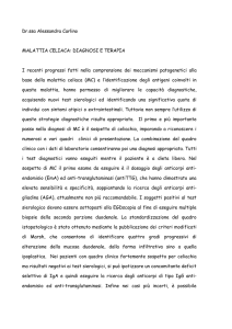 UNIVERSITA’ DEGLI STUDI DI NAPOLI FEDERICO II DOTTORATO DI RICERCA IN BIOLOGIA AVANZATA XXIII ciclo - TESI DI DOTTORATO - Un biosensore a fluorescenza per un rapido screening ed il follow-up di pazienti celiaci Relatore Candidata Ch.mo Prof. Silvana FILOSA Dott.ssa Elisa APICELLA Correlatore Dott. Sabato D’AURIA Coordinatore Ch.mo Prof. Luciano GAUDIO ANNO ACCADEMICO 2009 - 2010 Indice INDICE Capitolo I: LA MALATTIA CELIACA 1.1 Storia clinica pag. 1 1.2 Epidemiologia pag. 3 1.3 Eziologia pag. 5 1.3.1 Fattori ambientali: il glutine pag. 7 1.3.2 Fattori genetici pag. 10 1.4 Patogenesi pag. 15 1.4.1 Pre-processamento luminale e trasporto transepiteliale dell’antigene glutine 1.4.2 Modificazioni post-traslazionali e legame al complesso HLA pag. 16 pag. 20 1.4.2.1 Il ruolo della transglutaminasi nella malattia celiaca: la deamidazione dei peptidi del glutine 1.4.2.2 Gli epitopi del glutine ristretti alle regioni DQ2/DQ8 pag. 20 pag. 23 1.4.3 Meccanismo d’immunità adattativa al glutine 1.4.4 Meccanismo d’immunità innata al glutine 1.4.5 Il ruolo dei linfociti intraepiteliali 1.4.6 Cellule T regolatorie 1.4.7 Citochine e rimodellamento della matrice nella malattia celiaca 1.5 Patologia 1.5.1 Tipi di lesioni della mucosa 1.6 Presentazione clinica: segni e sintomi 1.6.1 Categorie di sprue celiaca 1.7 Diagnosi pag. 27 pag. 27 pag. 28 pag. 30 pag. 31 pag. 34 pag. 36 pag. 37 pag. 38 pag. 41 1.7.1 La biopsia intestinale 1.7.2 Marcatori sierologici pag. 41 pag. 42 1.8 Trattamento e “follow-up” pag. 48 1.8.1 La dieta priva di glutine 1.8.2 Il “follow-up” 1.9 Le nuove terapie pag. 48 pag. 49 pag. 50 Indice Capitolo II: LO SCOPO DEL LAVORO 2.1 I biosensori pag. 53 2.2 Obiettivi del Progetto di Ricerca pag. 54 Capitolo III: MATERIALI E METODI 3.1 Materiali 3.1.1 Ceppi batterici 3.1.2 Vettori plasmidici ed enzimi 3.1.3 Reagenti 3.2 Metodi 3.2.1 Produzione della transglutaminasi tissutale ricombinante in Escherichia coli 3.2.1.1 Progettazione dei “primer” 3.2.1.2 Amplificazione per PCR (Polymerase Chain Reaction) 3.2.1.3 Clonaggio nel vettore plasmidico pGEM-T Easy 3.2.1.4 Trasformazione delle cellule competenti 3.2.1.5 Clonaggio nel vettore d’espressione pET-28(a) 3.2.1.6 La sovraespressione della gptTG ricombinante 3.2.1.7 Analisi delle proteine nel lisato batterico pag. 57 pag. 57 pag. 57 pag. 57 pag. 58 pag. 58 pag. 58 pag. 59 pag. 60 pag. 60 pag. 61 pag. 62 pag. 63 3.3 Elettroforesi: gel di poliacrilammide in condizioni riducenti e denaturanti pag. 63 3.4 Determinazione della concentrazione proteica pag. 64 3.5 Saggio enzimatico per la transglutaminasi (EC 2.3.2.13) pag. 64 3.6 Produzione e purificazione di anticorpi policlonali anti-gptTG pag. 66 3.7 Marcatura chimica della gptTG e degli Ab anti-gptTG con sonde fluorescenti pag. 67 3.8 Strumentazione pag. 67 3.9 Studi di Spettroscopia di fluorescenza pag. 68 3.9.1 Misure di fluorescenza statica e applicazione del fenomeno “FRET” 3.9.2 Misure di fluorescenza risolta nel tempo 3.10 Configurazione “front-face” 3.10.1 Immobilizzazione di gptTG e Ab anti-gptTG su vetrino pag. 69 pag. 70 pag. 71 pag. 71 Indice 3.11 Determinazione di Singola Molecola basata sul principio della microscopia a fluorescenza 3.11.1 Spettroscopia di Correlazione di Fluorescenza 3.11.2 “FRET” a livello di singola molecola 3.11.3 Aumento di fluorescenza in presenza di particelle metalliche 3.11.3.1 Crescita elettrochimica di nanostrutture d’argento ramificate 3.11.4 Misure di Microscopia Confocale 3.11.4.1 Microscopia a Immagini basata sulla Fluorescenza risolta nel tempo pag. 73 pag. 73 pag. 76 pag. 80 pag. 81 pag. 82 pag. 83 Capitolo IV: RISULTATI E DISCUSSIONE 4.1 Produzione della gptTG ricombinante in Escherichia coli 4.1.1 Clonaggio del cDNA della gptTG nel vettore plasmidico pGEM-T Easy 4.1.2 Analisi di sequenza 4.1.3 Clonaggio del cDNA della gptTG nel vettore d’espressione pET-28(a) 4.1.4 Espressione della gptTG ricombinante in Escherichia coli 4.1.5 Determinazione dell’attività specifica della gptTG ricombinante 4.2 Valutazione funzionale del biosensore: indagini di fluorescenza 4.2.1 Selezione d’immunoreagenti e marcatura con sonde fluorescenti 4.2.2 Saggio di “FRET”: misure di fluorescenza in stadio stazionario 4.2.3 Saggio di “FRET”: misure di fluorescenza risolta nel tempo 4.2.4 Saggio di “FRET”: misure di fluorescenza in configurazione “front-face” 4.2.5 Determinazione di fluorescenza a livello di singola molecola 4.2.5.1 Studi di Spettroscopia di Correlazione di Fluorescenza 4.2.5.2 (Pulse-Interleaved Excitation) Fluorescence Resonance Energy Transfer & Time-Correlated Single Photon Counting 4.2.5.3 Metal-Enhanced Fluorescence & Fluorescence Lifetime Imaging Microscopy pag. 84 pag. 85 pag. 87 pag. 88 pag. 89 pag. 94 pag. 96 pag. 96 pag. 98 pag. 101 pag. 104 pag. 108 pag. 108 pag. 110 pag. 112 Indice Capitolo V: CONCLUSIONI E PROSPETTIVE FUTURE pag. 121 BIBLIOGRAFIA I-XXIII Abstrac t Abstract Celiac disease is a particular food intolerance leading to chronic autoimmune enteropathy to the detriment of the small intestine. It is a disease particularly prevalent in the western world and although there is a clear risk of hereditary, inheritance does not follow the classic Mendelian pattern, suggesting a multigenic and/or multifactor etiopathogenesis, fundamentally linked to two factors: an intrinsic to the patient, represented by genetic predisposition, which is mostly tied to gene HLA DQ2/8; an exogenous, or better, environmental, related to intake, through diet, of gluten. This protein component is contained in various cereals. The toxic fraction of this protein is represented by the alcohol-soluble component: gliadin, characterized by the frequent recurrence of the tetra peptide -gln-gln-gln-pro-, now considered as the detrimental agent of the disease. In fact, the serious injuries to the mucosa of the small intestine caused by intolerance to gluten, are resolved only after the elimination of such nutrient fr