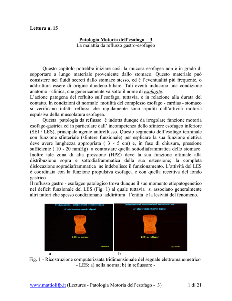 Lettura n. 15 Patologia Motoria dell’esofago - 3 La malattia da reflusso gastro-esofageo Questo capitolo potrebbe iniziare così: la mucosa esofagea non è in grado di sopportare a lungo materiale proveniente dallo stomaco. Questo materiale può consistere nei fluidi secreti dallo stomaco stesso, ed è l’eventualità più frequente, o addirittura essere di origine duodeno-biliare. Tali eventi inducono una condizione anatomo - clinica, che genericamente va sotto il nome di esofagite. L’azione patogena del refluito sull’esofago, tuttavia, è in relazione alla durata del contatto. In condizioni di normale motilità del complesso esofago - cardias - stomaco si verificano infatti reflussi che rapidamente sono ripuliti dall’attività motoria espulsiva della muscolatura esofagea. Questa patologia da reflusso è indotta dunque da irregolare funzione motoria esofago-gastrica ed in particolare dall’ incompetenza dello sfintere esofageo inferiore (SEI / LES), principale agente antireflusso. Questo segmento dell’esofago terminale con funzione sfinteriale (sfintere funzionale) per esplicare la sua funzione elettiva deve avere lunghezza appropriata ( 3 - 5 cm) e, in fase di chiusura, pressione sufficiente ( 10 - 20 mmHg) a contrastare quella sottodiaframmatica dello stomaco. Inoltre tale zona di alta pressione (HPZ) deve la sua funzione ottimale alla distribuzione sopra e sottodiaframmatica della sua estensione; la completa dislocazione sopradiaframmatica ne indebolisce il funzionamento. L’attività del LES è coordinata con la funzione propulsiva esofagea e con quella recettiva del fondo gastrico. Il reflusso gastro - esofageo patologico trova dunque il suo momento etiopatogenetico nel deficit funzionale del LES (Fig. 1) al quale tuttavia si associano generalmente altri fattori che spesso condizionano addirittura l’entità e la lesività del fenomeno. a b Fig. 1 - Ricostruzione computerizzata tridimensionale del segnale elettromanometrico - LES: a) nella norma; b) in reflussore - www.mattiolifp.it (Lectures - Patologia Motoria dell’esofago - 3) 1 di 21 Questi fattori risiedono, come già detto, nella capacità clearing dell’esofago e nella compliance recettiva del fundus. Ma bisogna fare i conti anche con l’attività motoria del complesso gastro-piloro-duodenale, che, più di quanto non si creda, influenza l’iter patogenetico e la gravità della Malattia da reflusso gastro - esofageo (MRGE / GERD). Se lo svuotamento gastrico non avviene come di norma e importante materiale refluibile, spesso intensamente acido, ristagna nello stomaco, è facile dedurne le conseguenze sulla gravità del reflusso in esofago. Com’è noto, spetta all’antro gastrico tale funzione egestoria, che può essere compromessa da svariate condizioni: flogosi cronica, modificazioni del trofismo mucoso (gastrite cronica atrofica, fenomeni displasici e/o metaplasici), alterazioni primitive della motilità gastrica. L’attività antrale, deputata allo svuotamento gastrico e al clearing di reflussi duodeno-gastrici nell’ambito della normalità fisiologica, ancorchè primitivamente valida, può risentire di fenomeni discinetici del duodeno. Infatti contrazioni duodenali incoordinate possono creare resistenza al passaggio del chimo gastrico in duodeno e addirittura possono respingere il contenuto duodenale nello stomaco attraverso l’anello pilorico (Fig. 2 - 6). Ciò, oltre ad impedire un corretto svuotamento gastrico, è in grado di provocare reflusso duodeno-gastrico patologico, nel senso che l’attività antrale non è in grado in tali condizioni di esercitare la sua funzione di clearing. Il contatto prolungato di materiale duodenale con la mucosa gastrica è causa di lesioni gravi a carico di questa, configurandosi la cosiddetta gastrite alcalina, meglio denominata gastropatia alcalina. Si creano pertanto due pesanti condizioni patologiche: maggiore disponibilità di materiale refluibile dallo stomaco in esofago e possibile contaminazione del refluibile con materiale duodenale. Anche da nostre osservazioni è documentata una significativa frequenza nei pazienti con reflusso gastro-esofageo di rallentato svuotamento gastrico, suggerendo e confermando così le nozioni sopraindicate ( Fig. 7). A seconda del pattern motorio del complesso esofago-gastro-duodenale potranno verificarsi qualificazioni diverse del reflusso in base al pH del refluito: con frequenza decrescente, reflussi rispettivamente acidi, misti, alcalini. Questa frequente compartecipazione dell’intero tratto digestivo superiore alla sindrome da reflusso ne potrebbe suggerire la denominazione di Malattia da reflusso duodeno-gastro-esofageo. (MRDGE) Da quanto esposto emerge il superamento di alcune convinzioni del passato che attribuivano la patologia da reflusso al venir meno di strutture anatomiche quali la membrana freno-esofagea di Bertelli-Laimer, l’angolazione acuta tra margine sinistro dell’esofago e fondo gastrico (angolo di Hiss), la fionda di Allison, ecc., ecc.. www.mattiolifp.it (Lectures - Patologia Motoria dell’esofago - 3) 2 di 21 a b Fig. 2 - elettromanometria esofagea e gastroduodenale in condizioni di normalità motoria. a) esofago: la traccia inferiore corrisponde alla zona di alta pressione (HPZ) all’altezza del LES. Si notino i rilasciamenti coordinati con le onde primarie esofagee. b) stomaco (ST) - duodeno (D): da notare la prevalenza pressoria delle onde propulsive antrali rispetto a quelle duodenali. Fig. 3 - Rappresentazione schematica dell’attività motoria normalmente coordinata antro-piloro-duodenale in fase di svuotamento gastrico. La seconda traccia dall’alto corrisponde alla HPZ/LES in fase di chiusura (competenza anti-reflusso). www.mattiolifp.it (Lectures - Patologia Motoria dell’esofago - 3) 3 di 21 Fig. 4 - Grave iperdiscinesia duodenale: si noti la differenza con i tracciati della figura 2 b a b Fig. 5 - a) Difficoltà di svuotamento gastrico per la prevalenza della cinesi duodenale su q
