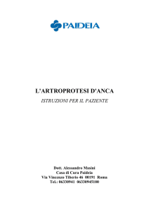 L'ARTROPROTESI D'ANCA ISTRUZIONI PER IL PAZIENTE Dott. Alessandro Masini Casa di Cura Paideia Via Vincenzo Tiberio 46 00191 Roma Tel.: 06330941 06330945100 DOPO L'INTERVENTO Nelle ore che seguono all’intervento vi possono essere dei modesti dolori, ma il paziente è comunque aiutato a combatterli dall'infusione continua a goccia lenta di un farmaco antidolorifico. Subito dopo l'intervento si pone attenzione alla prevenzione della trombosi migliorando la circolazione del sangue sia con farmaci, sia con le calze elastiche, sia con la mobilizzazione precoce. Si invita il paziente ad effettuare delle contrazioni del quadricipite e dei glutei ed a mobilizzare frequentemente la caviglia. La terapia anticoagulante con calciparina viene proseguita per 40 giorni. Fin dal primo giorno è importante il posizionamento corretto dell'arto inferiore, che deve essere mantenuto in estensione, abduzione e lieve rotazione esterna. Per mantenere l'arto in abduzione si utilizza, in posizione supina, un grosso cuneo divaricatore posto tra gli arti inferiori. In decubito laterale, consentito dopo la rimozione del drenaggio (in 2a giornata), si utilizza un cuscino che mantenga gli arti divaricati in questa posizione. 2 In 2a - 3a giornata il paziente viene messo in posizione eretta ed inizia a camminare dapprima con il deambulatore e poi con i bastoni canadesi, avendo cura di caricare parzialmente sul lato operato. Le sedute di chinesiterapia consistono in esercizi attivi del collo del piede e del ginocchio ed attiviassistiti dell'anca (figura n. 1) in modesta flessione; è comunque necessario evitare esercizi in adduzione, rotazione interna e flessione oltre i 90°. Fig. 1 : esercizi di rinforzo muscolare per il quadricipite Tra la 5a e la 7a giornata il paziente viene dimesso con un appuntamento per un successivo controllo ambulatoriale. Prima della dimissione viene insegnato l'uso dei bastoni canadesi nella deambulazione, come salire e scendere dal letto, alzarsi e sedersi, il salire e lo scendere le scale e come comportarsi nelle attività della vita quotidiana. 3 Bisogna salire e scendere dal letto sempre dal lato non operato: quindi, in caso di intervento all'anca destra, si scenderà dalla parte sinistra e si risalirà dalla parte sinistra. Bisogna, nell'alzarsi e sedersi, aiutarsi con gli arti superiori per controllare il bacino ed evitare quindi movimenti a rischio come la flessione, l'adduzione e la rotazione interna. 4 • Bisogna deambulare aiutandosi inizialmente con il deambulatore e successivamente appena sicuri delle proprie capacità con i bastoni canadesi. ALLA DIMISSIONE Una volta a casa il paziente deve utilizzare due bastoni canadesi per un carico graduale e progressivo fino al controllo ambulatoriale, dormire con un cuscino tra le gambe, indossare le calze elastiche per almeno 40 giorni ed eseguire gli esercizi di potenziamento muscolare già appresi durante il ricovero, in particolare per i glutei e per i muscoli della coscia (figure n. 2, 3, 4). Fig. 2: esercizi di rinforzo muscolare per il quadricipite e l'ileo-psoas 5 Fig. 3a : esercizi di rinforzo muscolare per gli abduttori eseguiti in ortostatismo…. Fig. 3b: …. ed in clinostatismo. Fig. 4 : esercizi di rinforzo muscolare per gli estensori Gli esercizi devono essere eseguiti più volte nel corso della giornata; è importante comunque evitare di stancarsi eccessivamente, ricordando che è meglio un giorno di inattività che fare il "passo più lungo della gamba". 6 posizione seduta scorretta posizione seduta corretta Il paziente deve continuare a non flettere l'anca oltre i 90°, addurla e/o intraruotarla; pertanto deve sedersi solo su sedie alte, ad arti leggermente divaricati, senza mai accavallare le gambe, ed utilizzare un rialzo per il bidet e per il water. Durante i mesi successivi si va verso una progressiva normalizzazione, grazie ad un opportuno trattamento rieducativo che consenta di recuperare l'ampiezza dei movimenti e la forza muscolare. Dopo il primo controllo ambulatoriale clinico e radiografico (in genere ad 1 mese dall’intervento) può essere utile usare la cyclette con sellino alto ed iniziare il nuoto. Si abbandonano quindi gradualmente la terapia antitrombotica, le calze elastiche ed i bastoni canadesi. Si torna pertanto ad una vita normale, con il solo limite di evitare di sottoporre l'impianto protesico ad un lavoro eccessivo od a stress inutili che ne ridurrebbero l'efficienza e la durata. 7 Per evitare flessioni dell’anca mentre fa il bagno, usi una spugna con il manico lungo e una doccia. Il terapista le può mostrare come usare un sedile da doccia, o una sedia nella vasca da bagno o nel box doccia. Nel vestirsi farsi aiutare nell’indossare le calze e usare un calzascarpe dal manico lungo per mettere le scarpe evitando così una eccessiva flessione e adduzione dell’anca Utilizzare uno strumento per prendere oggetti che sono o troppo bassi o troppo alti. Cercare di mettere gli oggetti sempre ad altezza conveniente. Piccoli oggetti possono essere tenuti nelle tasche magari di un grembiule. Come passeggero assicurarsi che il sedile della macchina sia spostato tutto indietro. Appoggiarsi sul sedile utilizzandolo come supporto. Scivolare quindi posteriormente in posizione semireclinata e ruotare tutto il corpo e le gambe in posizione frontale. 8 L'efficienza dell’artroprotesi e la sua affidabilità nel tempo è, infine, assicurata dalla precisa effettuazione di periodiche visite di controllo. Nessun sanitario è responsabile nei confronti di un paziente che non si sia sottoposto ad un preciso calendario di controlli, sia clinici che radiografici, che prevede le seguenti scadenze: - 1 mese - 3 mesi - 6 mesi - 1 anno dall'intervento. Successivamente i controlli clinici e radiologici dovranno essere effettuati ogni anno per tutta la vita o quando intervengano disturbi o situazioni particolari. La ricerca sui materiali e sui modelli ha reso molto affidabili e durature le artroprotesi attualmente in uso;