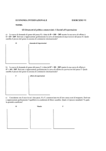 Economia politica Prof. Simona Comi AA. 2011/2012 Domande per la preparazione del programma del corso (solo le domande evidenziate in giallo hanno una soluzione SITETICA: significa che voi all’esame dovete scrivere di più!) 1) Quali sono gli ingredienti del mercato? 2) Considerate una curva di domanda e un curva di offerta di un generico mercato: rappresentatele graficamente, descrivetene le caratteristiche e ricavate graficamente l’equilibrio. 3) Considerate la relazione esistente tra prezzo quantità domandata di fragole al mercato di un piccolo paese come dettagliato nella seguente tabella. Rappresentate la curva di domanda di fragole e descrivetene le caratteristiche. Prezzo fragole al Quantità domandata di kilo fragole 5 euro 0,5 4 euro 0.7 3 euro 1.5 2 euro 3 1 euro 5 4) Come riesce un mercato a riassorbire un eccesso di domanda? 5) Come riesce un mercato a riassorbire un eccesso di offerta? 6) Quali sono i benefici (SURPLUS) che un mercato in concorrenza perfetta porta alle due controparti dello scambio? Rappresentate graficamente. 7)Ipotizzate che il mercato delle carote a dicembre 2010 sia caratterizzato dalle curve di offerta e domanda rappresentate in figura, e che per qualche ragione( non rilevante per noi) il prezzo attuale sia pari a P1. Rappresentate in figura quale sarà la quantità scambiata di carote a dicembre 2010, indicatela con Q1 e giustificate economicamente la vostra risposta. Che tipo di eccesso caratterizza il mercato delle carote? Cosa succederà in futuro? Come e perché si aggiusteranno prezzi e quantità? Quali saranno prezzo e quantità di equilibrio alla fine degli aggiustamenti? Indicateli in figura con P2 e q2 Risposta sintetica C’è eccesso di offerta, prevale il lato corto (la domanda) e la quantità scambiata a dicembre 2010 in corrispondenza di P1 è Q1. In futuro per i venditori (che non riescono a vendere tutte le carote) sarà conveniente abbassare il prezzo, questo porterà più compratori ad acquistare carote e l’equilibrio (stabile) del sistema sarà (P2 Q2) 1 8) Cosa è il surplus del consumatore (produttore) e come si genera? Come è possibile rappresentarlo graficamente? Indicate a cosa corrisponde nel grafico seguente. Risposta sintetica Siccome il prezzo di ogni unità scambiata è quello determinato dall’incontro tra domanda e offerta, esistono molti consumatori che sarebbero stati disposti a pagare di più il bene da loro acquistato (freccia verde) e quindi traggono maggiori benefici dallo scambio. La somma di questi benefici è esattamente il surplus del consumatore (area in verde). 2 9) Ipotizzate una impresa che operi in un mercato in concorrenza perfetta: come sceglie la quantità da produrre? (facoltativo: rappresentatela graficamente) 10) Come è possibile aggregare curve di domanda (offerta) individuale per ricavare la curva di domanda (offerta) di mercato? 11) Rappresentate una generica funzione di costo totale e la funzione di costo marginale che ne deriva: spiegatele brevemente. 12) Considerate l’impresa prodottoSP che opera in concorrenza perfetta e che ha i costi di produzione riportati in tabella. Descrivete brevemente quali sono i suoi obiettivi e come deve scegliere per raggiungerli. Completate le colonne mancanti. Quante unità sceglierà di produrre questa impresa? Risposta sintetica L’impresa prodotto SPA è in concorrenza perfetta …. prende il prezzo come dato e agisce con l’obiettivo della massimizzazione del profitto. Per conseguirlo………. Deve scegliere la quantità da produrre in modo da uguagliare costi marginali a ricavi marginali (prezzi). Questa impresa produrrà 6 unità. 13) Definite il concetto di efficienza nel senso di Pareto e enunciate il primo teorema fondamentale dell’economia del benessere. 14)Illustrate graficamente cosa si intende per “spreco del monopolio”. Commentate. 15) Illustrate graficamente come si intende per “perdita secca di monopolio” e spiegate come mai si verifica. 16)Considerate un monopolista che fronteggia la curva di domanda rappresentata in figura. Se l’impresa eguagliasse costo marginale a prezzo la produzione si collocherebbe nel punto B. Ma l’impresa che ha potere di mercato sceglie di massimizzare il suo profitto, di produrre la quantità 1 del bene e venderla al prezzo 1 (punto E). Indicate graficamente e definite economicamente cosa si intende per spreco del monopolio. 3 Risposta sintetica. In monopolio una parte della domanda rimane inevasa perché……… Lo spreco del monopolio è rappresentato dall’area in giallo perché… 17. 18. 19. 20. 21. 22. 23. 24. 25. 26. 27. 28. 29. 30. Cosa è l’oligopolio? Cosa è la concorrenza monopolistica? In che modo la differenziazione può generare potere di mercato? Cosa è e come funziona la discriminazione di prezzo? Che cosa è il valore atteso? Illustrate con un esempio. Definite l’avversione/neutralità/propensione al rischio. Che cosa è l’asimmetria informativa? Quali sono i suoi effetti sul mercato? Date la definizione e illustrate il problema con un esempio. Che cosa è la selezione avversa? Quali possono essere i suoi effetti sul mercato? Date la definizione e illustrate il problema con un esempio Che cosa è l’azzardo morale? Quali possono essere i suoi effetti sul mercato? Date la definizione e illustrate il problema con un esempio Considerate il mercato (generico) dei laptop e ipotizzate che esso sia in equilibrio. Quali effetti può avere l’introduzione di una tassa sulla produzione dei laptop? Come si modifica l’equilibrio. Come si modifica il benessere sociale a seguito dell’introduzione di una tassa? (fig10.2) Cosa è l’incidenza di una tassa? Illustrate graficamente.(fig 10.3) Come possono le regole modificare il funzionamento di un mercato? Illustrate graficamente il caso dell’introduzione di un prezzo minimo.(fig 10.5 a) Come possono le regole modificare il funzionamento di un mercato? Illustrate graficamente il caso dell’introduzione di un prezzo massimo