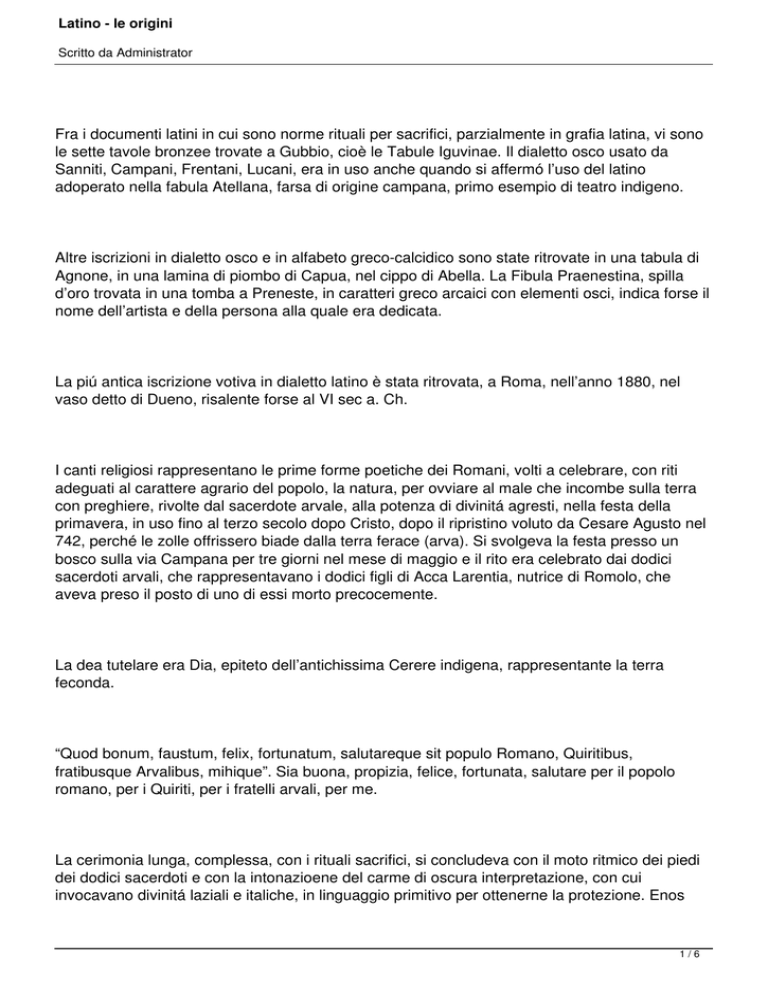 Latino - le origini Scritto da Administrator Fra i documenti latini in cui sono norme rituali per sacrifici, parzialmente in grafia latina, vi sono le sette tavole bronzee trovate a Gubbio, cioè le Tabule Iguvinae. Il dialetto osco usato da Sanniti, Campani, Frentani, Lucani, era in uso anche quando si affermó l’uso del latino adoperato nella fabula Atellana, farsa di origine campana, primo esempio di teatro indigeno. Altre iscrizioni in dialetto osco e in alfabeto greco-calcidico sono state ritrovate in una tabula di Agnone, in una lamina di piombo di Capua, nel cippo di Abella. La Fibula Praenestina, spilla d’oro trovata in una tomba a Preneste, in caratteri greco arcaici con elementi osci, indica forse il nome dell’artista e della persona alla quale era dedicata. La piú antica iscrizione votiva in dialetto latino è stata ritrovata, a Roma, nell’anno 1880, nel vaso detto di Dueno, risalente forse al VI sec a. Ch. I canti religiosi rappresentano le prime forme poetiche dei Romani, volti a celebrare, con riti adeguati al carattere agrario del popolo, la natura, per ovviare al male che incombe sulla terra con preghiere, rivolte dal sacerdote arvale, alla potenza di divinitá agresti, nella festa della primavera, in uso fino al terzo secolo dopo Cristo, dopo il ripristino voluto da Cesare Agusto nel 742, perché le zolle offrissero biade dalla terra ferace (arva). Si svolgeva la festa presso un bosco sulla via Campana per tre giorni nel mese di maggio e il rito era celebrato dai dodici sacerdoti arvali, che rappresentavano i dodici figli di Acca Larentia, nutrice di Romolo, che aveva preso il posto di uno di essi morto precocemente. La dea tutelare era Dia, epiteto dell’antichissima Cerere indigena, rappresentante la terra feconda. “Quod bonum, faustum, felix, fortunatum, salutareque sit populo Romano, Quiritibus, fratibusque Arvalibus, mihique”. Sia buona, propizia, felice, fortunata, salutare per il popolo romano, per i Quiriti, per i fratelli arvali, per me. La cerimonia lunga, complessa, con i rituali sacrifici, si concludeva con il moto ritmico dei piedi dei dodici sacerdoti e con la intonazioene del carme di oscura interpretazione, con cui invocavano divinitá laziali e italiche, in linguaggio primitivo per ottenerne la protezione. Enos 1/6 Latino - le origini Scritto da Administrator Lases iuvate...........triumpe, triumpe, triumpe, triumpe, triump. Questo culto di carattere agreste non aveva nulla a che vedere con quelli di carattere mistico proprio dei Greci, perchè indirizzato, nelle sacre formule, a liberare la terra e l’uomo dai morbi, attraverso il sacrificio di tre vittime, l’agnella, il porco e il toro, condotte intorno alle messi verdeggianti. Molto noto era anche il Carmen saliare, cantato dai dodoci sacerdoti Sali danzanti, stabiliti a Tusculum e a Tibur e ministri di Mars e di Hercules. Il loro numero corrispondeva a quello degli ancilia, gli scudi sacri custoditi da loro, uno dei quali era caduto dal cielo, come emblema della futura grandezza di Roma, mentre gli altri, perchè nessuno potesse impadronirsi di quello vero, erano stati fabbricati da un mitico artista, poi divinizzato, Mamurius Veturius. Virgilio fa comparire i Salii al tempo di Evandro, che accolse Enea e i Troiani ai piedi del Palatino dove sorse piú tardi il Forum Boarum. I Salii con le tempie recinte di ramoscelli di pioppo, mentre i vecchi cantavano le lodi di Ercole e i giovani ne seguivano l’azione con la mimica della danza, sacrificavano a Marte e ad Ercole. “Axamenta dicebantur carmina saliaria, quae a Saliis sacerdotibus componebantur, in universos homines ( forse deos ) composita”. Axamenta erano chiamati i carmi saliari che erano composti dai sacerdoti Salii e rivolti a tutti gli dei. Famose sono anche le formule di scongiuro, gli oracoli, le profezie, i proverbi, (che si riscontrano ancora nelle consuetudini popolari e rusticane,) che una volta i vati di Fauno recitavano, con i quali sembra che Fauno abbia rivelato i fati agli uomini. “quos olim Fauni vatesque canebant, quibus Faunus fata cecinisse hominibus videtur” Non mancavano certamente i canti di amore, le cantilene delle donne al telaio e degli uomini al loro lavoro, che hanno sempre accompagnato le varie attivitá umane. 2/6 Latino - le origini Scritto da Administrator Le nenie, i carmi conviviali e quelli trionfali erano molto importanti e da essi, forse, nella celebrazione eroica delle imprese rimaste nella memoria, provenivano le radici di racconti leggendari alla base dell’epopea nazionale. “Utinam exstarent illa carmina quae, multis saecliis ante suam aetatem, in epulis esse cantitata a singulis convivis de clarorum vivorum laudibus, in Originibus scriptum reliquit Cato!” fa dire Cicerone a Bruto La “Nenia est carmen quod in funere laudandi gratia cantatur ad tibiam” La nenia é il carme che veniva cantato con l’accompagnamento della tibia in lode dell’estinto. Dapprima fu una parente ad esaltare il defunto, mentre poi fu una donna prezzolata, la praefica, a farlo e perse il carattere della improvvisazione, per assumere quello di un eccesso di sconfinata lode, che travisava la reale personalitá e la storia della vita connessa all’estinto. Nell’Italia meridionale l’usanza delle lamentazioni funebri rimase viva a lungo.. Oggi , per l’evoluzione dei costumi di vita, in seguito al livellamento della cultura agevolata dai mezzi di comunicazione di massa, tipo la televisione, i quotidiani e l’obbligo scolare, questo uso é, per fortuna, venuto meno. I carmi trionfali delle soldatesche accompagnavano, in genere, con lazzi il trionfo dei condottieri ed erano colmi di beffe anche verso il vincitore, per esaltare, a volte, un tribuno caro al popolo, erano la viva testimonianza della partecipazione della plebe alla vita pubblica. Alternando le lodi ai vituperi, con lo scopo di moderare la gioia del trionfo, si volevano scongiurare le possibili ritorsioni della sorte. Questa licentia p
