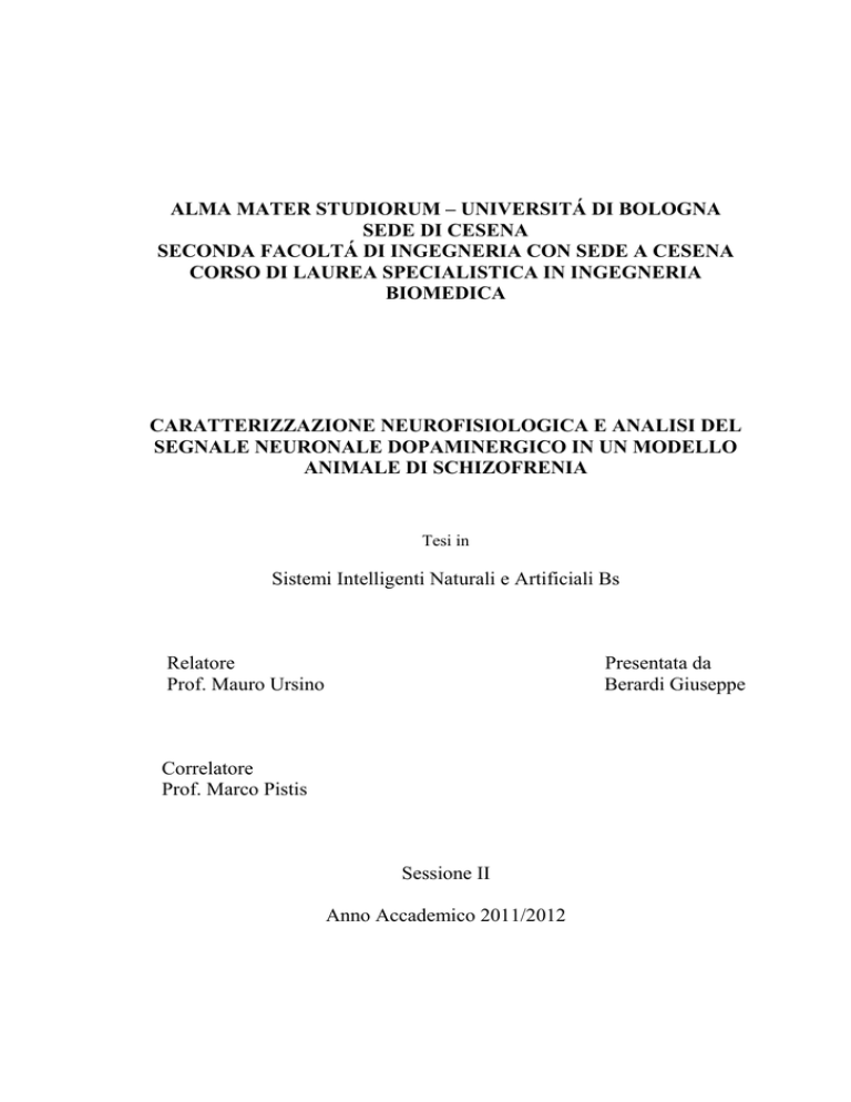 ALMA MATER STUDIORUM – UNIVERSITÁ DI BOLOGNA SEDE DI CESENA SECONDA FACOLTÁ DI INGEGNERIA CON SEDE A CESENA CORSO DI LAUREA SPECIALISTICA IN INGEGNERIA BIOMEDICA CARATTERIZZAZIONE NEUROFISIOLOGICA E ANALISI DEL SEGNALE NEURONALE DOPAMINERGICO IN UN MODELLO ANIMALE DI SCHIZOFRENIA Tesi in Sistemi Intelligenti Naturali e Artificiali Bs Relatore Prof. Mauro Ursino Presentata da Berardi Giuseppe Correlatore Prof. Marco Pistis Sessione II Anno Accademico 2011/2012 INDICE 1 INTRODUZIONE 1. ELEMENTI DI NEUROSCIENZE 5 1.1. Il neurone 5 1.2. Il Sistema Dopaminergico 11 1.3. Sostanze psicoattive e Dipendenza 13 1.4. Cannabis 16 1.5. Schizofrenia 18 2. PROGETTO 21 3. METODI SPERIMENTALI ED ELABORAZIONE DATI 25 3.1. Trattamenti e cura degli animali 25 3.2. Elettrofisiologia in vivo 28 3.3. Trasferimento del segnale in Matlab 33 3.4. Analisi parametri 33 3.4.1. Parametri Tradizionali 33 3.4.2. Parametri Burst 34 3.4.3. Parametri di confronto Tradizionali e Burst 34 3.4.4. Ritmicità della cellula 35 3.4.5. Relazione tra SO e Burst 43 45 4. RISULTATI 4.1. Risultati parametri Tradizionali 46 4.2. Risultati parametri e studio del Burst 47 4.3. Risultati confronto parametri Tradizionali e 52 Burst 4.4. Analisi ritmicità del firing della cellula 57 4.5. Parametri relazione tra SO e Burst 60 5. DISCUSSIONE RISULTATI E CONCLUSIONI 65 5.1. Commento risultati 65 5.2. Conclusioni finali 71 73 6. SVILUPPI FUTURI BIBLIOGRAFIA 77 RINGRAZIAMENTI 83 i ii INTRODUZIONE Obiettivo generale del progetto, svolto a partire da Maggio 2012 presso il Dipartimento di Neuroscienze “Bernard B. Brodie” dell’Università di Cagliari, unico “Centro di Eccellenza” in Italia per la ricerca sulla Neurobiologia delle Tossicodipendenze, in collaborazione con l’Istituto di Neuroscienze del C.N.R., è stata la caratterizzazione neurofisiologica e l’analisi del segnale neuronale dopaminergico in un modello animale di schizofrenia. I neuroni DAergici della Ventral Tegmental Area VTA rappresentano una delle popolazioni cellulari del sistema nervoso centrale (SNC) maggiormente implicate in alcuni processi fisiologici, quali la codifica delle risposte agli stimoli gratificanti, la motivazione e la regolazione del tono dell’umore. In aggiunta, parallelamente al loro ruolo nelle suddette funzioni, gli stessi neuroni DAergici giocano un ruolo basilare nella fisiopatologia di determinati disturbi, tra cui la dipendenza da sostanze e le psicosi. Queste ultime condizioni patologiche includono una larga gamma di disturbi gravi e ben caratterizzati dal punto di vista nosografico che vanno dall’autismo fino alle varie sotto-forme di schizofrenia. La ricerca degli ultimi decenni, mossa dalle esigenze messe in luce da dati epidemiologici allarmanti sull’incidenza di detti disturbi nelle società evolute, si sta muovendo verso lo studio delle cause e/o delle concause che possono favorire l’insorgenza di stati patologici pervasivi come quelli psicotici. A tal riguardo sia studi di natura preclinica (mediante utilizzo di modelli animali) che di natura clinica (sull’uomo) si stanno accordando sul fatto che l’insorgenza di psicosi (in particolare della schizofrenia e dell’autismo) possa essere dovuta, almeno in parte, a fattori prenatali che agiscono direttamente sul neurosviluppo del feto. Ad esempio, numerosi studi sui modelli animali hanno sottolineato che l’esposizione alle citochine pro-infiammatorie materne nel corso di periodi critici della gravidanza possa intaccare il corretto sviluppo di aree cerebrali del feto altamente implicate nella patogenesi delle psicosi. In linea con tali evidenze, una mole di lavori ha riportato, ad esempio, che la somministrazione di un composto detto acido poliriboinosilico-poliribocitidilico 1 (poli I:C) nei roditori, dai 2/3 della gravidanza, mimando una risposta immunitaria aspecifica ad agenti patogeni, possa indurre una degenerazione nella corretta neurogenesi di circuiti temporolimbici e corticali nel feto. L’effetto di tale malfunzionamento di circuiti implicati nelle funzioni adattive dell’animale potrebbe, dunque, essere responsabile della comparsa di comportamenti aberranti nelle fasi di vita postnatale del nascituro, inducendo dei comportamenti simil-psicotici nello stesso. Nel contempo, altri studi, prevalentemente concentrati su aspetti delle psicosi adulte hanno riscontrato un’elevata incidenza di patologie con sintomi psicotosimili in pazienti che in età adolescenziale abusavano di derivati della cannabis. Queste ultime evidenze sono state supportate anche da studi sui modelli animali che hanno riportato l’insorgenza di sintomi simil-schizofrenici in animali trattati cronicamente con dosi crescenti del principio attivo della cannabis, il ∆9tetraidrocannabinolo (THC). Tuttavia, malgrado entrambe le cause (quelle prenatali e quelle postnatali) pare ricoprano un ruolo importante nell’insorgenza di disturbi psicotici, la loro possibile interazione nello sviluppo di detti disturbi è stata ancora poco esplorata dalla letteratura. Inoltre, nessuno studio in bibliografia ha ancora messo in evidenza se l’effetto aberrante di tali fattori di rischio (da soli o ancor di più in interazione) possa causare conseguenze nella fisiologia e nell’attività dei neuroni DAergici della VTA. Per questo motivo, obiettivo generale del progetto è stato quello di caratterizzare dal punto di vista elettrofisiologico l’attività e la funzionalità dei neuroni dopaminergici (DAergici) dell’area ventrale del tegmento (VTA) in un modello animale (nello specifico di ratto) di esposizione adolescenziale ai cannabinoidi e contemporaneamente sottoposto in fase prenatale ai prodotti immunitari materni. Come detto, infatti, entrambe le suddette cause ambientali sono state associate sia nell’uomo, che nell’animale all’insorgenza di sintomi psicotici in età adulta. Tuttavia, sebbene evidenze di varia natura nei modelli animali abbiano preso in 2 considerazione l’effetto singolo d