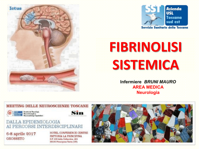 FIBRINOLISI SISTEMICA Infermiere BRUNI MAURO AREA MEDICA Neurologia COSA E’ LA FIBRINOLISI Con il termine “Fibrinolisi” ci riferiamo ad un trattamento in emergenza da effettuare nelle prime 4,5 ore dall’ insorgenza dei sintomi di un Ictus Ischemico in base a rigidi criteri di “inclusione e di esclusione”. Il trattamento è da effettuarsi in una Stroke Unit. Il farmaco che viene infuso per via sistemica è l’ rt-PA (attivatore tissutale del plasminogeno) attivo nel torrente vascolare in particolare dove si trova la fibrina (trombosi) dove esplicherà particolari attività enzimatiche per la lisi del trombo stesso. PROCEDURA INFERMIERISTICA FIBRINOLISI SISTEMICA NELLO STROKE ISCHEMICO CEREBRALE CRITERI ASSOLUTI D’ ESCLUSIONE La presenza anche di una sola delle condizioni indicate esclude la trombolisi CONDIZIONI CLINICHE Insorgenza dei sintomi da più di 4,5 ore prima dell’inizio del trattamento od ora dell’esordio non nota (n.b. per i pazienti che si svegliano con il deficit neurologico, l’ora presunta dell’esordio è quella in cui sono andati a dormire. Età inferiore a 18 anni, superiore ad 80 anni Paziente grave: NIHSS > 25 Deficit lieve o rapido miglioramento dei sintomi prima del trattamento Sospetto di ESA (anche in caso di TAC normale) Ictus esordito con una crisi epilettica Ictus ischemico negli ultimi 3 mesi Ictus ischemico pregresso e diabete mellito concomitante Storia di emorragia cerebrale nota o sospetta SI NO CRITERI ASSOLUTI D’ ESCLUSIONE CONDIZIONI CLINICHE Storia di patologia del SNC (neoplasia, aneurisma, intervento chirurgico cerebrale o midollare) Ipertensione arteriosa non controllabile al momento del trattamento (PAS > 185 o PAD > 110 mmHg o terapia aggressiva per riportare la PA entro questi limiti) Endocardite batterica, pericardite acute Intervento chirurgico maggiore o grave trauma negli ultimi 3 mesi Malattia ulcerosa del tratto gastroenterico (< 3 mesi) Pancreatite acuta Grave epatopatia, compresa insufficienza epatica, cirrosi, ipertensione portale (varici esofagee), epatite attiva Aneurisma arterioso, malformazioni venose o arteriose note SI NO CRITERI ASSOLUTI D’ ESCLUSIONE CONDIZIONI CLINICHE Diatesi emorragica ereditaria o acquisita nota incluso: • uso corrente di anticoagulanti orali • somministrazione di eparina nelle 24 ore precedenti l’ictus e con APTT eccedente il limite del laboratorio • conta piastrinica < 100.000/mmc Glicemia di base <50 mg/dl o > 400 mg/dl Recente (< 10 giorni) massaggio cardiaco esterno, parto, puntura di vaso sanguigno in sede non comprimibile (es. vena succlavia o giugulare) Neoplasia con aumento rischio emorragico Retinopatia emorragica (es. nei diabetici un disturbo visivo può essere sintomo di retinopatia emorragica) Sanguinamento grave recente o in atto SI NO CRITERI ASSOLUTI D’ ESCLUSIONE CRITERI TAC Emorragia intracranica Tumore cerebrale Emorragia subaracnoidea Malformazione artero-venosa cerebrale Aneurisma cerebrale Presenza di ipodensità (criteri Aspect) SI NO CRITERI D’INCLUSIONE AL TRATTAMENTO CON ACTILYSE Criteri d’inclusione al trattamento con Actilyse Criteri di ambo i sessi di età compresa fra i 18 e gli 80 anni Ictus ischemico responsabile di un deficit misurabile di linguaggio, motorio, cognitivo, di sguardo, del visus e/o neglet Inizio dei sintomi da meno di 4,5 ore. Vanno esclusi i pazienti per i quali non è possibile stabilire l’ora dell’esordio (Per i pazienti che presentino i sintomi al risveglio, l’ora d’esordio deve essere considerata quella in cui i pazienti sono andati a dormire). Sintomi presenti da almeno 30 minuti e non significativamente migliorati prima del trattamento. I sintomi vanno distinti da quelli di un episodio sincopale, da quelli di una crisi epilettica o da quelli di una crisi emicranica. Il paziente ha espresso la volontà ad essere trattati, dopo opportuna informazione. SI NO CHECK-LIST (1) Farmaco per la fibrinolisi (Actilyse) 2 Siringhe da 50 cc con relativo deflussore Pompa siringa e pompa volumetrica 2 aghi cannula del 18 G Soluzione Fisiologica 250 cc e 500 cc Deflussori per flebo Siringhe da 10 cc per la somministrazione del bolo Sfigmo-manometro manuale Monitor multiparametrico per il rilevamento della PA, ECG, Sat O2, FR • Letto bilancia • Carrello dell’ emergenza, con defribillatore e sistema di ventilazione • • • • • • • • • CHECK LIST (2) FARMACI PRESSIONE • TRANDATE (labetalolo) da 20 ml = 100 mg. E.V. • EBRANTIL (urapidil) da 5 ml = 25 mg o da 10 ml = 50 mg. e.v. • NITROPRUSSIATO DI SODIO 0,5-1,0 mg/Kg/minuto • Scheda registrazione, per pazienti sottoposti a trombolisi sistemica INIZIO PROCEDURA • Posizionamento del paziente sopra il letto bilancia, per la determinazione del peso (riportare scheda registrazione) e quindi della dose di Actilyse da infondere • Posizionamento del catetere vescicale qualora non sia posizionato • Reperire 2 accessi venosi (dx e sx) con agocannula 18 G • Collegamento del paziente al sistema di monitoraggio multiparametrico • (Sat O2, P.A., Respirogramma, ECG). • Rapido controllo (prima di iniziare) dei criteri della check-list. Rilevamento dei parametri al tempo «0», cioè prima dell’infusione rt-PA come da scheda registrazione, con relativa trascrizione (ricordarsi di riportare nella scheda l’ora d’inizio della procedura). • Preparazione del farmaco (Actilyse) in base al peso corporeo (0,9 mg/Kg) con un max. della dose di 90 mg • Infondere il 10% della quantità totale in bolo in 1 minuto. PROCEDURA (segue) • Aspirare il quantitativo per il bolo con siringa (scrivere sulla stessa bolo rt-PA) ed iniziare ad infondere in 1 minuto. • Aspirare la restante parte con 1 o 2 siringhe da pompa (scrivere dose rt-PA) • Connettere la siringa all’infusore e la linea di infusione al paziente. • Impostare la pompa-siringa in modo tale che la dose di farmaco rimanente (vedi tabella dosaggio-peso corporeo) sia infuso in 60 minuti. • Al te
