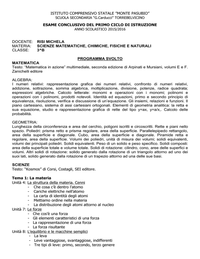 ISTITUTO COMPRENSIVO STATALE ”MONTE PASUBIO” SCUOLA SECONDARIA “G.Carducci” TORREBELVICINO ESAME CONCLUSIVO DEL PRIMO CICLO DI ISTRUZIONE ANNO SCOLASTICO 2015/2016 DOCENTE: MATERIA: CLASSE: RISI MICHELA SCIENZE MATEMATICHE, CHIMICHE, FISICHE E NATURALI 3^B PROGRAMMA SVOLTO MATEMATICA Testo: “Matematica in azione” multimediale, seconda edizione di Arpinati e Mursiani, volumi E e F. Zanichelli editore ALGEBRA: I numeri relativi: rappresentazione grafica dei numeri relativi, confronto di numeri relativi, addizione, sottrazione, somma algebrica, moltiplicazione, divisione, potenze, radice quadrata; espressioni algebriche. Calcolo letterale: monomi e operazioni con i monomi; polinomi e operazioni con i polinomi, prodotti notevoli. Identità ed equazioni, primo e secondo principio di equivalenza, risoluzione, verifica e discussione di un’equazione. Gli insiemi, relazioni e funzioni. Il piano cartesiano, sistema di assi cartesiani ortogonali. Elementi di geometria analitica: la retta e sua equazione, studio e rappresentazione grafica di rette del tipo y=ax, y=a/x,. Calcolo delle probabilità. GEOMETRIA: Lunghezza della circonferenza e area del cerchio, poligoni iscritti e circoscritti. Rette e piani nello spazio. Poliedri: prisma retto e prisma regolare, area della superficie. Parallelepipedo rettangolo, area della superficie e diagonale. Cubo, area della superficie e diagonale. Piramide retta e regolare, area della superficie. Volumi dei poliedri, unità di misura dei volumi; solidi equivalenti, volumi dei principali poliedri. Solidi equivalenti. Peso di un solido e peso specifico. Solidi composti: area della superficie totale e volume totale. Solidi di rotazione: cilindro, cono, aree delle superfici e volumi. Altri solidi di rotazione: solido generato dalla rotazione di un triangolo attorno ad uno dei suoi lati, solido generato dalla rotazione di un trapezio attorno ad una delle sue basi. SCIENZE Testo: “Kosmos” di Corsi, Costagli, SEI editore. Tema 1: La materia Unità 4: La struttura della materia. Cenni - Che cosa c’è dentro l’atomo - Cariche elettriche nell’atomo - La carta di identità degli atomi - Mettiamo ordine nella materia - La distribuzione degli atomi attorno al nucleo Unità 7: Le forze - Che cos’è una forza - Gli elementi caratteristici di una forza - La rappresentazione di una forza - La forza risultante Unità 8: L’equilibrio e le macchine semplici - La leva - Leve vantaggiose, svantaggiose, indifferenti - Tre tipi di leve: primo, secondo, terzo genere Tema2: Uomo, genetica, evoluzione Unità 5: La scoperta dell’ereditarietà - La nascita della genetica - Gli esperimenti di Mendel - Dai fattori di Mendel ai geni - L’ereditarietà mendeliana nell’uomo Tema 3: La Terra nel Sistema Solare Unità: 1: L’universo - Il cielo stellato - L’universo - La distanza tra le stelle - La luce delle stelle - Nascita, vita e morte di una stella - Origini ed evoluzione dell’Universo Unità 2: Il Sistema Solare - Il Sistema Solare - Il Sole - I pianeti del Sistema Solare - Gli altri corpi del Sistema Solare Unità 3: La Terra e la Luna - Conosciamo la Terra - Il moto di rotazione della Terra - Reticolato geografico - Il moto di rivoluzione della Terra - L’alternarsi delle stagioni - La Luna: satellite della Terra - Le fasi lunari Unità 7: Vulcani e terremoti - Come è fatto un vulcano - Che cosa fuoriesce da un vulcano - Due tipi di eruzioni - Vita e morte di un vulcano - I terremoti - La forza di un terremoto - La distribuzione dei vulcani e terremoti sulla Terra Unità 8: La struttura della Terra e la sua storia - Continenti alla deriva - Alla scoperta della struttura interna della Terra - Lo studio dei fondali oceanici - La teoria della tettonica a zolle L’insegnante Prof. Michela Risi