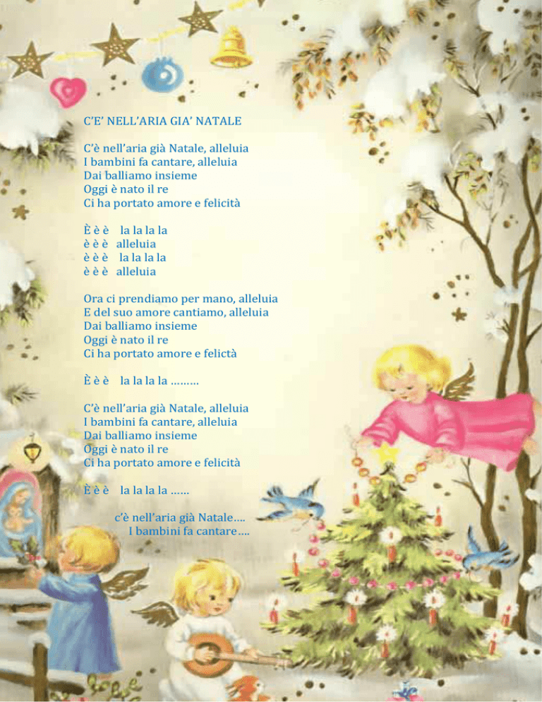 C’E’ NELL’ARIA GIA’ NATALE C’è nell’aria già Natale, alleluia I bambini fa cantare, alleluia Dai balliamo insieme Oggi è nato il re Ci ha portato amore e felicità Èèè èèè èèè èèè la la la la alleluia la la la la alleluia Ora ci prendiamo per mano, alleluia E del suo amore cantiamo, alleluia Dai balliamo insieme Oggi è nato il re Ci ha portato amore e felictà È è è la la la la ……… C’è nell’aria già Natale, alleluia I bambini fa cantare, alleluia Dai balliamo insieme Oggi è nato il re Ci ha portato amore e felicità È è è la la la la …… c’è nell’aria già Natale…. I bambini fa cantare…. NINNA NANNA DEI BAMBINI Ninna oh, ninna oh. Ninna nanna ninna oh. Ninna oh, ninna oh. Ninna nanna ninna oh. Suona il tamburo piano piano Se il bimbo strilla non lo suono più Suono i legnetti piano piano Per il mio amico, il mio amico Gesù. Suono il cembalo piano piano, una stella brilla nel cielo lassù. Suono il triangolo piano piano Per il mio amico, il mio amico Gesù Suono le maracas piano piano, e la neve bianca scende quaggiù Suono le nacchere piano piano Per il mio amico, il mio amico gesù Suono il flauto piano piano, una ninna nanna canta anche tu Suoniamo bambini piano piano È nato un amico, è nato Gesù SONO UNA PECORELLA Rit. Sono una pecorella, siamo le pecorelle Portiamo un regalino, col cuore glielo diamo Perché, perché (2 volte) Tu sei il pastore ecco perché Perché, perché (2volte) Ero nell’ovile con le mie sorelle Sotto un cielo nero dipinto di stelle Una stretta all’altra e tutte quante lì Era molto freddo, com’è freddo qui. Dormivano tutte, dormivamo bene Nel calduccio bello di chi si vuole bene Quando all’improvviso un angelo lassù Ha detto in un annuncio che eri nato tu! Rit. Così siamo partite e adesso siamo qua Con un regalino che ti vogliamo dare Con la nostra lana ti potrai scaldare Con la nostra gioia e tutto il nostro amore E dopo porteremo tutto il nostro late Insieme alla ricotta pure le caciotte Così tu crescerai e grande diverrai E da ogni male ci difenderai. Rit. E adesso ce ne andiamo Con un ricordo bello di chi ti ha riscaldato Il bue e l’asinello E lo diremo a tutti, a tutti in ogni dove È nato in una stalla il figlio del Signore!