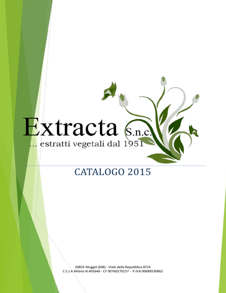 CATALOGO 2015 20835 Muggiò (MB) - Viale della Repubblica 87/A C.C.I.A Milano N.405646 - CF 00760270157 - P.IVA 00689530962 La nostra proposta commerciale I prodotti Extracta S.n.c. offre ai suoi clienti un ampio catalogo di prodotti che afferiscono al settore cosmetico, alimentare e nutraceutico: - estratti vegetali in forma liquida : tinture, estratti fluidi, acque distillate, distillati alcolici, estratti glicolici, estratti idroglicerici, estratti oleosi; - estratti vegetali in pasta: estratti molli; - estratti in polvere : estratti secchi, succhi di frutta, miele, preparazioni aromatiche, coloranti; - sciroppi: sciroppi aromatizzati. I servizi Extracta S.n.c. offre ai suoi clienti diversi servizi. - prodotti personalizzati: estratti vegetali studiati sulle esigenze del cliente. Per ogni estratto possono essere variate: il rapporto E/D, il grado alcolico, la densità, gli eccipienti, la granulometria, la scorrevolezza etc. - poliestratti: su formulazione nostra o del cliente. - miscelazione polveri. - atomizzazione conto terzi : abbiamo maturato una ventennale esperienza nella formulazione e nel trattamento di prodotti atomizzati tra i quali: estratti vegetali, aromi, oli essenziali, succhi di frutta, coloranti, lisati proteici, vitamine, amminoacidi, dolcificanti, miele, nero di seppia, malto, latte di bufala, yogurt, vino, sale, colloidi organici e inorganici, emulsioni, tensioattivi etc. Lavoriamo su 3 impianti con capacità produttiva complessiva giornaliera da 1 a 1000 Kg di polveri. Siamo disponibili per prove e piccole lavorazioni. - noleggio impianto di atomizzazione: proponiamo, presso la nostra sede, un servizio di noleggio di un impianto di atomizzazione Grandezza 3 (imp. pilota / piccola produzione), in grado di incontrare ogni esigenza di prove o piccole produzioni e di garantire al cliente disponibilità esclusiva dell'impianto, massima affidabilità e certezza nella programmazione. Il valore aggiunto Extracta S.n.c. offre ai suoi clienti una solida struttura ed un know-how maturati in oltre sessant'anni di attività nei settori cosmetico, alimentare e nutraceutico, combinati con la flessibilità e la passione per l'innovazione tipiche di una startup. Extracta S.n.c. fonda la sua filosofia lavorativa sui concetti di disponibilità e flessibilità. Noi crediamo che esista un prodotto perfetto per ogni necessità e, attraverso un attento lavoro di ricerca che coinvolge tutte le fasi produttive, offriamo al cliente qualcosa che va al di la di un semplice rapporto commerciale: la fiducia nella qualità e nell'efficacia di un prodotto pensato e realizzato su misura rispetto alle proprie necessità. Pagina 1 Catalogo prodotti Atomizzati 1 Açai Albicocca Amarena Ananas Arancia Aronia Banana Ciliegia Cocco Cranberry Novità Fragola Goji berry Kiwi Lampone Lime Limone Mandarino Mango Mela Melograno Melone Miele Mirtillo Mora Papaya Passionfruit (Maracuja) Novità Pera Pesca Pompelmo Prugna Ribes nero Rosa canina Composizioni aromatiche 1 Pianta Chinotto Erbe Alpine Vin brulè Droga Tipo di produzione Miscela di erbe Miscela di erbe Miscela di erbe Poliestratto fluido Poliestratto fluido Poliestratto secco Estratti 1 EF = Estratto fluido; EM = Estratto molle; ES = Estratto secco; TI = Tintura; AD = Distillato acquoso; AHD = Distillato alcolico EG = Estratto glicolico; EI = Estratto idroglicerico; EO = Estratto oleoso Pianta 1 Achillea Agarico bianco Aglio Agnocasto Albicocca Alchemilla Alfa alfa Alloro Aloe Altea Ananas Angelica Anice stellato Anice verde Arancio Arancio amaro Arancio dolce Arnica Artemisia 1 Nome scientifico Achillea millefolium L. Polyporus officinalis Fries Allium sativum L. Vitex agnus castus (L.) Kurz Prunus armeniaca L. Alchemilla vulgaris L. Medicago sativa L. Laurus nobilis L. Aloe ferox Miller Althaea officinalis L. Ananas sativus Schult. Angelica archangelica L. Illicium verum Hooker Pimpinella anisum L. Citrus aurantium L. Citrus aurantium L.v.amara Citrus aurantium L.v.dulcis Arnica montana L. Artemisia vulgaris L. Droga Somm.fiorite Tallo Bulbi freschi Frutti Frutti Foglie Pianta Foglie Succo Radice Frutti Radice Frutti Frutti Fiori Scorze Scorze Fiori Pianta fiorita EF EM * ES TI * * * * AD AHD EG IG EO * * * * * * * * * * * * * * * * * * * * * * * * * * * * * * * * * * * * * * * * * * * * * * * * * * * * * * * * * * Il catalogo non è esaustivo - Per qualsiasi prodotto non presente nel catalogo, contattare in nostro ufficio commerciale Pagina 2 * * Pianta 1 Artiglio del diavolo Asparago Assenzio Astragalo Avena Balsamo Fioravanti Balsamo Tolù Bardana Basilico Betulla 2 Biancospino 2 Boldo 2 Borragine Bosso Cacao Caffè nero Caffè verde 2 Novità Calamo Calendola Camomilla romana Camomilla volgare Cannella Capelvenere Capsella Capsico Carciofo Cardamomo Cardiaca Cardo mariano 2 Cardo santo Carota Carrube Cartamo Carvi Cascara 2 Cascarilla Cassia fistula Castagno 2 Centaurea Centella Asiatica Cetriolo China calisaya China rossa Chiretta Cicoria Ciliegio Cimicifuga Cipresso Cocco Coda cavallina 2 Cola 1 2 Nome scientifico Vedi Harpago Asparagus officinalis L. Artemisia absinthium L. Astragalus membranaceus B. Avena sativa L. Miscela di droghe Myroxilon toluiferum DC Arctium lappa L. Ocimum basilicum L. Betula alba L. Crataegus oxyacantha L. Peumus boldus Molina Borrago officinalis L. Buxus sempervirens L. Theobroma cacao L. Coffea arabica L. Coffea arabica L. Acorus calamus L. Calendula officinalis L. Anthemis nobilis L. Chamomilla recutita R. Cinnamomum zeylanicum Nees. Adiantum capillus-Veneris L. Capsella bursa-pastoris Moench. Capsicum annuum L. Cynara scolymus L. Elettaria cardamomum W.M. Leonurus cardiaca L. Sylibum marianum (L.) Gaertn. Cnicus benedictus L. Daucus carota L. Ceratonia siliqua L. Carthamus tinctorius L. Carum carvi L. Rhamnus purshiana D.C. Croton eluteria (L.) Bennet Cassia fistula L. Castanea sativa Miller Centaurium erythraea Rafn. Centella asiatica L. Cucumis sativus L. Cinchona calisaya Wedd. Cinchona succirubra Pavon And