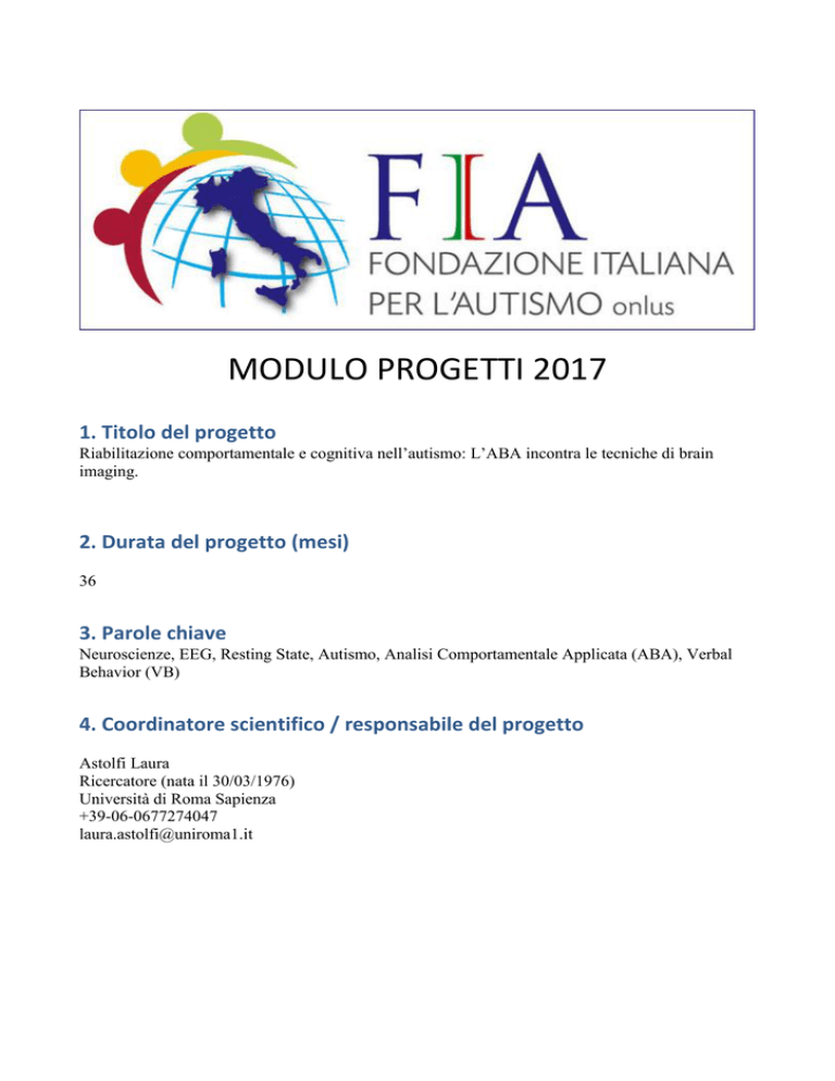 MODULO PROGETTI 2017 1. Titolo del progetto Riabilitazione comportamentale e cognitiva nell’autismo: L’ABA incontra le tecniche di brain imaging. 2. Durata del progetto (mesi) 36 3. Parole chiave Neuroscienze, EEG, Resting State, Autismo, Analisi Comportamentale Applicata (ABA), Verbal Behavior (VB) 4. Coordinatore scientifico / responsabile del progetto Astolfi Laura Ricercatore (nata il 30/03/1976) Università di Roma Sapienza +39-06-0677274047 [email protected] Pubblicazioni del Coordinatore Scientifico/responsabile del progetto rilevanti ed inerenti al Progetto Selezione delle pubblicazioni del Coordinatore Scientifico su riviste scientifiche peer review indicizzate su Scopus, inerenti al progetto (produzione scientifica complessiva: 104 Journal papers indicizzati su Scopus, citazioni totali: 3148, IF totale: 170.209, h-index: 31): 1. Toppi J, Borghini G, Petti M, He EJ, De Giusti V, He B, Astolfi L, Babiloni F. Investigating Cooperative Behavior in Ecological Settings: An EEG Hyperscanning Study. (2016) PLoS One. Apr 28;11(4):e0154236. 2. Leistritz, L., Schiecke, K., Astolfi, L., Witte, H. Time-variant Modeling of Brain Processes (2016), Proceedings of the IEEE, 104 (2), art. no. 7352314, pp. 262-281. 3. Petti, M., Toppi, J., Babiloni, F., Cincotti, F., Mattia, D., Astolfi, L., EEG Resting-State Brain Topological Reorganization as a Function of Age (2016) Computational Intelligence and Neuroscience, 2016, art. no. 6243694 . 4. Toppi, J., Astolfi, L., Poudel, G.R., Innes, C.R.H., Babiloni, F., Jones, R.D. Time-varying effective connectivity of the cortical neuroelectric activity associated with behavioural microsleeps (2016) NeuroImage, 124, pp. 421-432. 5. Plomp, G., Hervais-Adelman, A., Astolfi, L., Michel, C.M. Early recurrence and ongoing parietal driving during elementary visual processing (2015) Scientific Reports, 5, art. no. 18733. 6. Toppi, J., Petti, M., Mattia, D., Babiloni, F., Astolfi, L. Time-varying effective connectivity for investigating the neurophysiological basis of cognitive processes (2015) Neuromethods, 91, pp. 171-204. 7. Pichiorri, F., Morone, G., Petti, M., Toppi, J., Pisotta, I., Molinari, M., Paolucci, S., Inghilleri, M., Astolfi, L., Cincotti, F., Mattia, D. Brain-computer interface boosts motor imagery practice during stroke recovery (2015) Annals of Neurology, 77 (5), pp. 851-865. 8. Plomp, G., Quairiaux, C., Michel, C.M., Astolfi, L.The physiological plausibility of timevarying Granger-causal modeling: Normalization and weighting by spectral power (2014) NeuroImage, 97, pp. 206-216. 9. Babiloni, F., Astolfi, L. Social neuroscience and hyperscanning techniques: Past, present and future (2014) Neuroscience and Biobehavioral Reviews, 44, pp. 76-93. 10. Plomp, G., Quairiaux, C., Kiss, J.Z., Astolfi, L., Michel, C.M. Dynamic connectivity among cortical layers in local and large-scale sensory processing (2014) European Journal of Neuroscience, 40 (8), pp. 3215-3223. 11. Toppi, J., Risetti, M., Quitadamo, L.R., Petti, M., Bianchi, L., Salinari, S., Babiloni, F., Cincotti, F., Mattia, D., Astolfi, L. Investigating the effects of a sensorimotor rhythm-based BCI training on the cortical activity elicited by mental imagery (2014) Journal of Neural Engineering, 11 (3), art. no. 035010, .. 12. Risetti, M., Formisano, R., Toppi, J., Quitadamo, L.R., Bianchi, L., Astolfi, L., Cincotti, F., Mattia, D. On ERPs detection in disorders of consciousness rehabilitation (2013) Frontiers in Human Neuroscience, (NOV), art. no. 775, . 13. Leistritz, L., Pester, B., Doering, A., Schiecke, K., Babiloni, F., Astolfi, L., Witte, H. Timevariant partial directed coherence for analysing connectivity: A methodological study (2013) Philosophical Transactions of the Royal Society A: Mathematical, Physical and Engineering Sciences, 371 (1997), art. no. 20110616. 14. Toppi, J., De Vico Fallani, F., Vecchiato, G., Maglione, A.G., Cincotti, F., Mattia, D., Salinari, S., Babiloni, F., Astolfi, L. How the statistical validation of functional connectivity patterns can prevent erroneous definition of small-world properties of a brain connectivity network (2012) Computational and Mathematical Methods in Medicine, 2012, art. no. 130985. 15. De Vico Fallani, F., Chessa, A., Valencia, M., Chavez, M., Astolfi, L., Cincotti, F., Mattia, D., Babiloni, F. Community structure in large-scale cortical networks during motor acts (2012) Chaos, Solitons and Fractals, 45 (5), pp. 603-610. 16. Astolfi, L., Toppi, J., De Vico Fallani, F., Vecchiato, G., Cincotti, F., Wilke, C.T., Yuan, H., Mattia, D., Salinari, S., He, B., Babiloni, F. Imaging the social brain by simultaneous hyperscanning during subject interaction (2011) IEEE Intelligent Systems, 26 (5), art. no. 5959142, pp. 38-45. 17. He, B., Dai, Y., Astolfi, L., Babiloni, F., Yuan, H., Yang, L. EConnectome: A MATLAB toolbox for mapping and imaging of brain functional connectivity (2011) Journal of Neuroscience Methods, 195 (2), pp. 261-269. 18. De Vico Fallani, F., Rodrigues, F.A., Da Fontoura Costa, L., Astolfi, L., Cincotti, F., Mattia, D., Salinari, S., Babiloni, F. Multiple pathways analysis of brain functional networks from eeg signals: An application to real data (2011) Brain Topography, 23 (4), pp. 344-354. 19. Astolfi, L., Cincotti, F., Mattia, D., Fallani, F.V., Vecchiato, G., Salinari, S., Vecchiato, G., Witte, H., Babiloni, F. Time-varying cortical connectivity estimation from noninvasive, high-resolution EEG recordings (2010) Journal of Psychophysiology, 24 (2), pp. 83-90. 20. De Vico Fallani, F., Nicosia, V., Sinatra, R., Astolfi, L., Cincotti, F., Mattia, D., Wilke, C., Doud, A., Latora, V., He, B., Babiloni, F. Defecting or not defecting: How to "read" human behavior during cooperative games by EEG measurements (2010) PLoS ONE, 5 (12), art. no. e14187, . Cited 46 times. 21. Astolfi, L., Toppi, J., De Vico Fallani, F., Vecchiato, G., Salinari, S., Mattia, D., Cincotti, F., Babiloni, F. Neuroelectrical hyperscanning measures simultaneous b