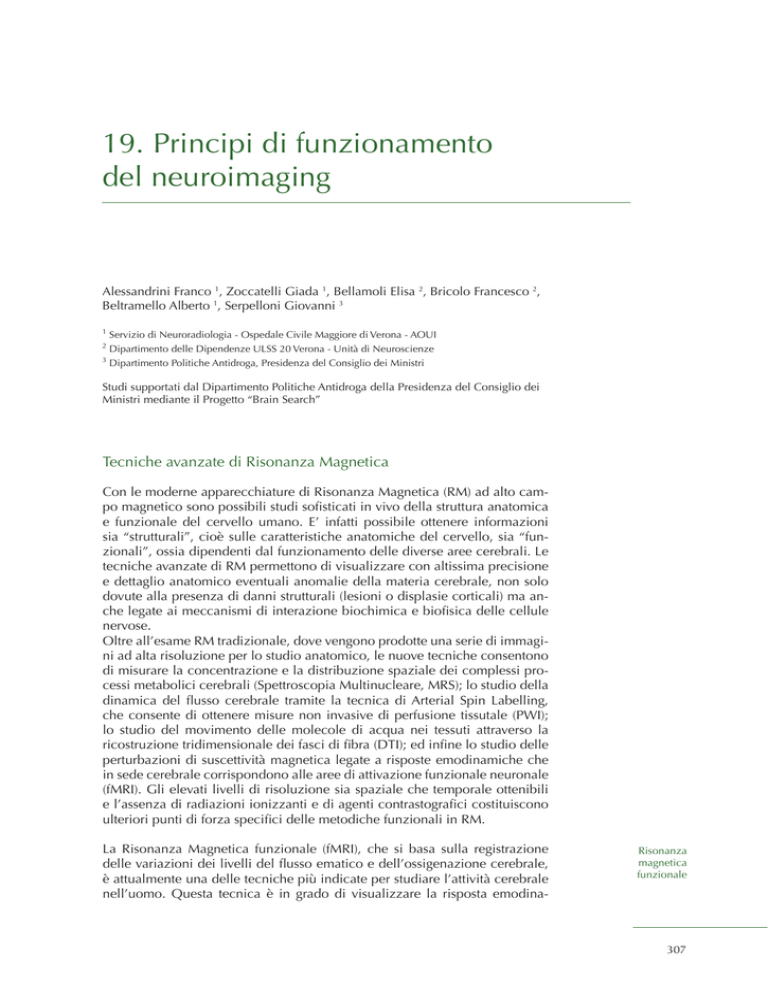 19. Principi di funzionamento del neuroimaging Alessandrini Franco 1, Zoccatelli Giada 1, Bellamoli Elisa 2, Bricolo Francesco 2, Beltramello Alberto 1, Serpelloni Giovanni 3 1 Servizio di Neuroradiologia - Ospedale Civile Maggiore di Verona - AOUI Dipartimento delle Dipendenze ULSS 20 Verona - Unità di Neuroscienze 3 Dipartimento Politiche Antidroga, Presidenza del Consiglio dei Ministri 2 Studi supportati dal Dipartimento Politiche Antidroga della Presidenza del Consiglio dei Ministri mediante il Progetto “Brain Search” Tecniche avanzate di Risonanza Magnetica Con le moderne apparecchiature di Risonanza Magnetica (RM) ad alto campo magnetico sono possibili studi sofisticati in vivo della struttura anatomica e funzionale del cervello umano. E’ infatti possibile ottenere informazioni sia “strutturali”, cioè sulle caratteristiche anatomiche del cervello, sia “funzionali”, ossia dipendenti dal funzionamento delle diverse aree cerebrali. Le tecniche avanzate di RM permettono di visualizzare con altissima precisione e dettaglio anatomico eventuali anomalie della materia cerebrale, non solo dovute alla presenza di danni strutturali (lesioni o displasie corticali) ma anche legate ai meccanismi di interazione biochimica e biofisica delle cellule nervose. Oltre all’esame RM tradizionale, dove vengono prodotte una serie di immagini ad alta risoluzione per lo studio anatomico, le nuove tecniche consentono di misurare la concentrazione e la distribuzione spaziale dei complessi processi metabolici cerebrali (Spettroscopia Multinucleare, MRS); lo studio della dinamica del flusso cerebrale tramite la tecnica di Arterial Spin Labelling, che consente di ottenere misure non invasive di perfusione tissutale (PWI); lo studio del movimento delle molecole di acqua nei tessuti attraverso la ricostruzione tridimensionale dei fasci di fibra (DTI); ed infine lo studio delle perturbazioni di suscettività magnetica legate a risposte emodinamiche che in sede cerebrale corrispondono alle aree di attivazione funzionale neuronale (fMRI). Gli elevati livelli di risoluzione sia spaziale che temporale ottenibili e l’assenza di radiazioni ionizzanti e di agenti contrastografici costituiscono ulteriori punti di forza specifici delle metodiche funzionali in RM. La Risonanza Magnetica funzionale (fMRI), che si basa sulla registrazione delle variazioni dei livelli del flusso ematico e dell’ossigenazione cerebrale, è attualmente una delle tecniche più indicate per studiare l’attività cerebrale nell’uomo. Questa tecnica è in grado di visualizzare la risposta emodina- Risonanza magnetica funzionale 307 mica, ossia i cambiamenti nel contenuto di ossigeno del parenchima e dei capillari, correlata all’attività neurale del cervello. Permette di rilevare i collegamenti tra l’attivazione del cervello e i compiti motori o cognitivi che il soggetto esegue durante la scansione. La Risonanza Magnetica Funzionale (fMRI) è una tecnica non invasiva che consente di misurare le variazioni dell’attività cerebrale nel tempo e di evidenziare le aree preposte al controllo di una parte dell’organismo o di una specifica funzione (sensoriale, cognitiva o motoria) rilevando le aree che si attivano maggiormente durante l’esecuzione di un determinato compito. L’ottima risoluzione spaziale e temporale consente di ottenere risultati molto affidabili circa la comprensione dei meccanismi neuro-funzionali delle neuroscienze di base. Tra le applicazioni cliniche più importanti della fMRI ricordiamo lo studio dei meccanismi di riorganizzazione funzionale prima e dopo interventi chirurgici. Grazie alle sue caratteristiche di non invasività, la fMRI si presenta come formidabile strumento di ricerca per la comprensione delle relazioni esistenti tra struttura cerebrale, funzionalità cerebrale ed eventuali patologie. L’approccio metodologico che guida lo studio della funzionalità cerebrale si basa principalmente su due principi: 1. esiste una localizzazione spaziale della funzionalità cerebrale, 2. esiste una stretta correlazione tra il fenomeno dell’attivazione neuronale e l’alterazione locale di alcuni parametri metabolici ed emodinamici cerebrali. La fMRI è in grado di definire delle mappe delle regioni attivate nel cervello dopo l’esecuzione di compiti da parte del soggetto, registrando le variazioni dell’attività neuronale legate al flusso sanguigno cerebrale regionale (rCBF), al volume sanguigno cerebrale regionale (rCBV) e alla variazione del consumo di ossigeno (CMRO2). Figura 1 - Nell’immagine a sinistra, una macchina di Risonanza Magnetica ad alto campo (3.0 Tesla, ditta Siemens). A destra, il soggetto viene posizionato all’interno del magnete e un sistema di proiezione delle immagini posto di fronte agli occhi permette di vedere gli stimoli visivi. Riduzione del volume, della morfometria e dell’integrità del cervello nei consumatori di cannabis 308 Studi di neuroimmagine hanno recentemente iniziato ad esplorare il volume, la morfometria e l’integrità del cervello anche di adolescenti che fanno uso di cannabis, focalizzandosi sui sistemi associati con la vulnerabilità ai disturbi cognitivi e dell’umore. Le tecniche di Risonanza Magnetica (MRI) hanno quantificato la densità dei tessuti, differenziato la composizione dei tessuti, e valutato l’organizzazione e l’integrità dei tessuti in vivo. Uno studio con la MRI e la PET (tomografia a emissione di positroni) ha ripor- Principi di funzionamento del neuroimaging tato che le persone che hanno cominciato a fare uso di cannabis prima dei 17 anni avevano un volume cerebrale minore, con una percentuale minore di materia grigia ed una percentuale maggiore di materia bianca (Wilson et al., 2000). Oltre agli studi sulla struttura cerebrale dei consumatori di cannabis, vi sono studi che indagano il funzionamento cerebrale di questi soggetti in stato di riposo oppure durante l’esecuzione di un compito cognitivo. Gli studi funzionali in