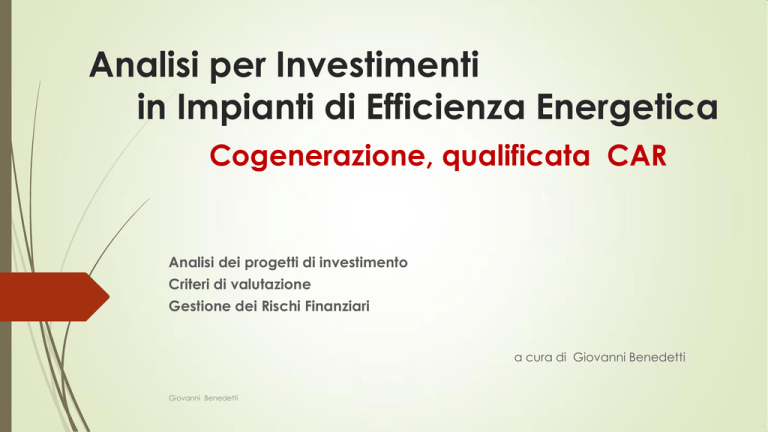 Analisi per Investimenti in Impianti di Efficienza Energetica Cogenerazione, qualificata CAR Analisi dei progetti di investimento Criteri di valutazione Gestione dei Rischi Finanziari a cura di Giovanni Benedetti Giovanni Benedetti “…migliaia, milioni di individui lavorano, producono e risparmiano nonostante tutto quello che noi possiamo inventare per molestarli, incepparli, scoraggiarli. È la vocazione naturale che li spinge; non soltanto la sete di denaro. Il gusto, l’orgoglio di vedere la propria azienda prosperare, acquistare credito, ispirare fiducia a clientele sempre più vaste, ampliare gli impianti, abbellire le sedi, costituiscono una molla di progresso altrettanto potente che il guadagno. Se così non fosse, non si spiegherebbe come ci siano imprenditori che nella propria azienda prodigano tutte le loro energie e investono tutti i loro capitali per ritrarre spesso utili di gran lunga più modesti di quelli che potrebbero sicuramente e comodamente con altri impieghi.” Luigi Einaudi Giovanni Benedetti * Investimento di Impresa: necessità per garantirsi il futuro Un’impresa, se vuole rimanere attiva sul mercato, non può prescindere da eseguire investimenti. Gli investimenti servono infatti a realizzare, attraverso programmi di sostituzione, espansione e innovazione, le finalità aziendali come appunto: • la sopravvivenza stessa dell’impresa sul mercato. Investire, significa anche immobilizzare per un certo periodo di tempo (in genere si parla di anni) risorse finanziarie al fine di ricavarne una redditività. L’investimento può in altre parole essere considerato: • lo scambio di un bene attuale con uno futuro che si presume essere di valore superiore. Ogni investimento cioè deve fornire un reddito, senza il quale non è possibile per l’azienda rimanere sul mercato. Giovanni Benedetti Giovanni Benedetti * Investimenti In Attività Industriali Cosa è un investimento? Per comprendere meglio come sia strutturato un investimento occorre fare una distinzione tra due tipologie di investimento: 1°genere: Investimento industriale Un investimento industriale risulta tale, se opera in asset reali, ovvero riguarda l’acquisto o il noleggio di beni quali: macchinari, impianti di produzione o di servizio, infrastrutture tecnologiche come, connessioni veloci, soluzioni software, applicativi gestionali, oppure stabilimenti per l’implementazione di nuove linee di produzione, di unità logistiche, o la creazione di uffici e aule per la formazione o infine nuovi spazi per la distribuzione dei prodotti come show room, negozi ed spazi retail (per mostra e la vendita al dettaglio). Giovanni Benedetti Questi investimenti, tutti appartenenti alla gestione caratteristica di un’impresa, vanno ad impattare sul futuro dell’impresa stessa Si ha un investimento di natura industriale, ogni qual volta che i presunti ritorni derivino dalla vendita dei prodotti, materiali o immateriali, che gli investimenti eseguiti consentono di ottenere. Questi investimenti si possono suddividere a loro volta in: • Investimenti tecnici relativi cioè al processo di produzione ed in subordine, agli impianti di servizio • Investimenti Commerciali indirizzati all’attività Mkg (Promozione e distribuzione) • Investimenti Amministrativi e • Strategici questi ultimi due, sono dedicati a migliorare l’efficienza dell’azienda Giovanni Benedetti * “La Borsa è quel luogo dove gli stupidi vengono separati dal loro denaro” Paul Samuelson 2° genere: Investimento finanziario Siamo in presenza di Investimenti di natura finanziaria, quando i ritorni economici sono dati (generalmente nel breve periodo) dalla rivendita degli investimenti stessi. Nella nostra trattazione circa investimenti in Impianti di cogenerazione (CAR), ci riferiremo chiaramente al 1° genere: Giovanni Benedetti Investimento Industriale !! * Impianti di Servizio o Facility Gli impianti di servizio non rientrano strettamente nelle attività «core» o caratteristiche di un impresa, ma sono spesso ad esse correlati dal punto di vista • del servizio offerto al processo produttivo, • del confort o disconfort reso, che ne influenza appunto la produttività e non ultimo • dei consumi energetici, quindi dei costi di esercizio dell’impresa stessa Giovanni Benedetti *** La Cogenerazione ad Alto Rendimento - CAR • La CAR, rientra negli investimenti tecnici in Impianti di Servizio che oggi in Italia hanno sicuramente enormi margini di intervento mirati all’efficienza energetica, dati i costi dell’energia che sono storicamente elvati,nel nostro paese • La CAR, quando viene progettata bene e nel contesto corretto, rappresenta una soluzione di recupero di risorse importanti per molte realtà energivore e anche di recupero di vantaggio competitivo soprattutto nei confronti delle manifatture che si confrontano con la concorrenza nazionale ed estera Giovanni Benedetti ** Risparmio di sprechi → libera risorse per Investimenti I margini di risparmio che si ottengono con la generazione combinata di calore e corrente elettrica diventano da subito risorse importanti da impiegare in ambiti più produttivi La cogenerazione libera sin dal primo anno risorse da investire ad esempio nel «core business» di impresa, con la possibilità di guadagnare vantaggio competitivo prezioso per stare sul mercato Giovanni Benedetti *** Investimento e Rischio I metodi che verranno presentati in seguito, cercano di rendere più razionale ed oggettivo il criterio di decisione per una corretta scelta di investimento sotto il profilo economico e finanziario, cercando di rispondere alle due seguenti esigenze • Il bisogno di Investire e • la necessità di minimizzare il Rischio Giovanni Benedetti ** Approccio al Rischio in un Investimento Primo comandamento e regola fondamentale di colui che investe in qualsiasi attività che ha valenza universale: Non ti assumerai altro rischio all’infuori del necessario !! Infatti, prima di investire occorre 