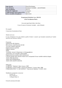 Programma di Statistica I (a.a. 2013/2014) L-Z (Prof. Viola Domenico) Università degli Studi di Bari Aldo Moro I Facoltà di Economia Corso di Laurea Economia Aziendale Pre-requisiti: Nozioni di Matematica di base Obiettivi del corso: Il corso si propone di fornire agli studenti le metodologie statistiche di base per l’analisi dei fenomeni economici, aziendali e finanziari. Programma: Introduzione alla Statistica Rilevazione e classificazione dei dati Vari tipi di tabelle statistiche Rappresentazioni grafiche Rapporti statistici Medie Variabilità: misure di dispersione e di disuguaglianza Asimmetria, curva normale e disnormalità Rappresentazione analitica delle distribuzioni Divergenza tra due variabili statistiche Concetti generali sulle relazioni interne tra le componenti di una variabile statistica doppia Analisi della dipendenza Analisi dell’interdipendenza Analisi delle mutabili statistiche Bibliografia: G. GIRONE. Statistica, Bari, CACUCCI, 2009. D.VIOLA (A cura di) Valutazione e qualità degli atenei : Modelli, metodi e indicatori statistici, UNIVERSITA’ DEGLI STUDI DI BARI ALDO MORO, 2011, BARI. P. PERCHINUNNO, V.C. DENICOLO', Esercizi di statistica, CLEUP, Padova, 2010G. GIRONE - G. 1 Modalità di accertamento conoscenze: Esoneri: No Prova Scritta: Si Colloquio Orale: Si Forme di assistenza allo studio: Corso presente nella zona in e-learning del Sito Web di Facoltà: No Organizzazione della didattica: Cicli interni di lezione: Si Corsi integrativi: No Esercitazioni: Si Seminari: Si Attività di laboratorio: No Project work: No Visite di studio: No 2 Programma di Statistica I A-K (a.a. 2013/2014) (Prof. Massari Antonella) Università degli Studi di Bari Aldo Moro Dipartimento di Studi Aziendali e Giusprivatistici Corso di Laurea Triennale in Economia Aziendale Pre-requisiti: Non è previsto alcun requisito. Obiettivi del corso: Il corso di Statistica I è un corso introduttivo di Statistica che ha come obiettivo quello di fornire i concetti e gli strumenti essenziali per l’analisi descrittiva dei fenomeni collettivi. Scopo del corso è quello di sviluppare la formazione critica necessaria ad applicare, nel modo più adeguato, la metodologia proposta ai casi concreti. Programma: Introduzione alla Statistica Rilevazione e classificazione dei dati Vari tipi di tabelle statistiche Rappresentazioni grafiche Rapporti statistici Medie Variabilità: misure di dispersione e di disuguaglianza Asimmetria, curva normale e disnormalità Rappresentazione analitica delle distribuzioni Concetti generali sulle relazioni interne tra le componenti di una variabile statistica doppia Analisi della dipendenza Analisi dell’interdipendenza Analisi delle mutabili statistiche Bibliografia: G.GIRONE, “Statistica”, Bari, Cacucci, 2009 D.POSA- S.DE IACO- M.PALMA- S.MAGGIO, “Esercizi di Statistica descrittiva”, G.Giappichelli, Torino, 2006 P.PERCHINUNNO- V.C.DE NICOLO’, “Esercizio di Statistica”, CLEUP, 2010 Modalità di accertamento conoscenze - Esoneri: No - Prova Scritta: No - Colloquio Orale: Si Forme di assistenza allo studio: - Corso presente nella zona in e-learning del Sito Web di Facoltà: No 3 Organizzazione della didattica: ite di studio: No 4 Programma del corso di Istituzioni di economia politica a.a. 2013-2014 Prof. Andrea Morone Obiettivi formativi del corso: Il corso si prefigge un duplice obiettivo. In primo luogo intende illustrare i concetti fondamentali dell'analisi del comportamento dei singoli operatori (famiglie e imprese) all'interno di un'economia di mercato. In secondo luogo si propone di considerare i temi caratterizzanti l'analisi economica relativamente alla determinazione del reddito nazionale, dell'occupazione, del livello generale dei prezzi e dell'equilibrio della bilancia dei pagamenti. In tale ambito si analizzeranno le decisioni fondamentali dell'operatore pubblico per ciò che concerne la politica fiscale, e della Banca Centrale relativamente all'impostazione della politica monetaria. Modalità di svolgimento dell'esame: L'esame si svolge preliminarmente mediante una prova scritta composta da due domande aperte che vertono sull'intero programma di studio. Successivamente, chi supera la prova scritta viene ammesso a sostenere una prova orale con specificazione scritta (grafici ed espressioni analitiche). Argomenti oggetto di studio: Modulo I (Microeconomia): Introduzione alla microeconomia. Domanda e offerta. Il comportamento del consumatore. Il comportamento dell'impresa. La funzione di produzione. I costi di produzione. L'ottima combinazione dei fattori produttivi. La massimizzazione del profitto in un mercato di concorrenza perfetta. Il monopolio e i mercati non concorrenziali. L'offerta dell'impresa. I casi di fallimento del mercato e la giustificazione dell'intervento pubblico. Modulo II (Macroeconomia): Introduzione alla macroeconomia. Elementi di contabilità nazionale. La domanda aggregata. Il modello di determinazione del reddito. La politica fiscale. La moneta: natura e ruolo del sistema finanziario. L'offerta di moneta ed il ruolo della Banca Centrale. Gli strumenti della politica monetaria. La domanda di moneta e l'equilibrio monetario. L'equilibrio macroeconomico in un'economia chiusa a prezzi dati: il modello IS-LM. La politica monetaria e fiscale nel modello AS-AD a prezzi flessibili. 5 Equilibrio macroeconomico, prezzi ed aggiustamento internazionale. Testi consigliati: Modulo I: Amendola A., Boccella N. e Imbriani C. (2007), Microeconomia, seconda edizione, LED. Modulo II: Imbriani C. e Lopes A. (2009), Aggregati macroeconomici e struttura finanziaria, nuova edizione, UTET (capp. 1, 2, 3, 4, 5, 7, 10, 12). 6 Programma di Istituzioni di Economia Politica Prof. Di Liddo Giuseppe CdL in Economia Aziendale II semestre 10 CFU Obiettivi del corso Il corso si prefigge un duplice obiettivo: 1) illustrare i concetti fondamentali dell'analisi del comportamento dei singoli operatori (famiglie e imprese) all'interno di una economia di mercat
