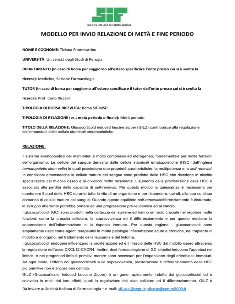 MODELLO PER INVIO RELAZIONE DI METÀ E FINE PERIODO NOME E COGNOME: Tiziana Frammartino UNIVERSITÀ: Univeristà degli Studi di Perugia DIPARTIMENTO (in caso di borsa per soggiorno all’estero specificare l’ente presso cui si è svolta la ricerca): Medicina, Sezione Farmacologia TUTOR (in caso di borsa per soggiorno all’estero specificare il tutor dell’ente presso cui si è svolta la ricerca): Prof. Carlo Riccardi TIPOLOGIA DI BORSA RICEVUTA: Borsa SIF-MSD TIPOLOGIA DI RELAZIONE (es.: metà periodo o finale): Metà periodo TITOLO DELLA RELAZIONE: Glucocorticoid induced leucine zipper (GILZ) contribuisce alla regolazione dell’omeostasi delle cellule staminali ematopoietiche. RELAZIONE: Il sistema ematopoietico dei mammiferi è molto complesso ed eterogeneo, fondamentale per molte funzioni dell’organismo. Le cellule del sangue derivano dalle cellule staminali ematopoietiche (HSC, dall’inglese hematopoietic stem cells) le quali possiedono due proprietà caratteristiche: la multipotenza e la self-renewal. In condizioni omeostatiche le cellule mature del sangue sono prodotte dalle HSC che risiedono in nicchie specializzate del midollo osseo e si dividono molto raramente. L’aumento della proliferazione delle HSC è associato alla perdita della capacità di self-renewal. Per questo motivo la quiescenza è necessaria per mantenere il pool delle HSC durante tutta la vita di un organismo e per rispondere, quindi, alla sua continua domanda di cellule mature del sangue. Quando questo equilibrio self-renewal/differenziamento è disturbato, lo sviluppo aberrante potrebbe portare ad una progressione pre-leucemica ed al cancro. I glucocorticoidi (GC) sono prodotti nella corteccia del surrene ed hanno un ruolo cruciale nel regolare molte funzioni, come la crescita cellulare, la sopravvivenza ed il differenziamento e per questo mediano la soppressione dell’infiammazione e la risposta immune. Per questa ragione i glucocorticoidi sono ampiamente usati come agenti terapeutici in molte patologie infiammatorie acute e croniche, nel trapianto di midollo e di organo, nel trattamento della leucemia e del linfoma. I glucocorticoidi endogeni influenzano la proliferazione ed e il rilascio delle HSC dal midollo osseo attraverso la regolazione dell’asse CXCL12-CXCR4. Inoltre, dosi farmacologiche di GC sintetici inducono l’apoptosi nei linfociti e nei progenitori linfoidi primitivi mentre sono necessari per l’espansione degli eritroblasti immaturi. Ad ogni modo, l’effetto dei glucocorticoidi sulla sopravvivenza, proliferazione e differenziamento delle HSC più primitive non è ancora ben definito. GILZ (Glucocorticoid Induced Leucine Zipper) è un gene rapidamente indotto dai glucocorticoidi ed è coinvolto in molti dei loro effetti, quali la regolazione del ciclo cellulare ed il differenziamento. GILZ è Da inviare a: Società Italiana di Farmacologia – e-mail: [email protected]; [email protected] maggiormente espresso negli organi linfoidi e studi effettuati fino a questo momento svelano quale sia il suo ruolo nel sistema immunitario. Dal momento che GILZ inibisce la crescita cellulare normale e quella tumorale interferendo con il pathway Ras/MAPK e l’attività di NF-kB, è molto importante studiare quale sia il suo ruolo funzionale nel sistema ematopoietico. In questo progetto è stato valutato l’effetto di GILZ nell’ematopoiesi murina mediante un approccio di tipo genetico, cioè usando topi GILZ KO. Abbiamo osservato che l’mRNA di GILZ è espresso in tutte le sottopopolazioni staminali e nei progenitori. In particolare abbiamo osservato che GILZ è maggiormente espresso nelle cellule staminali ematopoietiche più primitive Lin-Sca1+ckit+CD150+CD48-FLT3- e nel tempo l’espressione non cambia nei topi più anziani. Abbiamo analizzato le frequenze delle staminali nel midollo osseo del topo GILZ KO ed abbiamo osservato una diminuzione delle cellule staminali ematopoietiche più primitive, rispetto al topo WT ed un aumento della popolazione progenitrice LMPP, definita Lin-Sca1+ckit+CD150-FLT3+. Per verificare che il fenomeno fosse intrinseco alla cellula, sono stati effettuati esperimenti di trapianto competitivo, inoculando nel topo recipiente letalmente irradiato (con allotipo Ly5.1/2) una mix cellulare composta di midollo osseo donatore (allotipo Ly5.2) e competitore (allotipo Ly5.1) in un rapporto 1:1. Le cellule staminali GILZ KO non presentano differenze nei livelli di attecchimento rispetto alle cellule WT ma le analisi del sangue a 12 settimane dal trapianto mostrano un aumento delle cellule mature GILZ KO rispetto alle cellule WT. A tre mesi dal trapianto è possibile osservare nel midollo osseo una diminuzione delle cellule staminali più primitive CD45.2 GILZ KO ed un contemporaneo aumento delle cellule progenitrici GILZ KO rispetto alle cellule WT. Un anno dopo il trapianto è possibile, invece, assistere ad una diminuzione di tutte le sottopopolazioni cellulari staminali e progenitrici nel midollo dei topi trapiantati con il midollo osseo GILZ KO. Presi insieme questi dati dimostrano che GILZ è fondamentale per la self-manteinance delle cellule staminali ematopoietiche e che la mancanza di GILZ comporta un più rapido differenziamento verso le cellule progenitrici. GILZ è quindi un gene chiave nella regolazione dell’omeostasi delle HSC. Da inviare a: Società Italiana di Farmacologia – e-mail: [email protected]; [email protected]