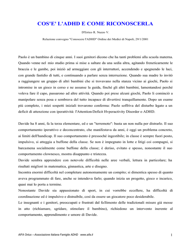 COS'E' L'ADHD E COME RICONOSCERLA D'Errico R. Nuzzo V. Relazione convegno "Conoscere l'ADHD" Ordine dei Medici di Napoli, 29/1/2001 Paolo è un bambino di cinque anni. I suoi genitori dicono che ha tanti problemi alla scuola materna. Quando venne nel mio studio prima si mise a saltare da una sedia altra, agitando freneticarnente le braccia e le gambe, poi iniziò ad armeggiare con gli interruttori, accendendo e spegnendo le luci, con grande fastidio di tutti, e continuando a parlare senza interruzione. Quando sua madre lo invitò a raggiungere un gruppo di altri bambini che si trovavano nella stanza vicino ai giochi, Paolo si intromise in un gioco in corso e ne assunse la guida, finché gli altri bambini, lamentandosi perché voleva fare il capo, passarono ad altre attività. Quando poi prese alcuni giochi, Paolo li cominciò a manipolare senza posa e sembrava del tutto incapace di divertirsi tranquillamente. Dopo un esame più completo, i miei sospetti iniziali trovarono conferma: Paolo soffriva del disturbo legato a un deficit di attenzione con iperattività: l'Attention-Deficit Hvperactivity Disorder o ADHD. Davide ha 8 anni, fa la terza elementare, ed e un "terremoto": basta un non nulla per distrarlo. Il suo comportamento iperattivo e deconcentrato, che manifestava da anni, è oggi un problema concreto, ai limiti dell'handicap. Il suo comportamento è pressoché ingestibile; in classe è sempre fuori posto, impulsivo, si atteggia a buffone della classe. Se non è impegnato in lotte e litigi coi compagni, si barcamena socialmente come buffone della classe; è deriso, evitato e spesso, nonostante il suo comportamento clownesco, mostra disappunto e tristezza. Davide sembra apprendere con notevole difficoltà nelle aree verbali, lettura in particolare; ha risultati migliori in matematica, ginnastica, arte e disegno. Incontra enormi difficoltà nel completare autonomamente un compito; si dimentica spesso di quanto aveva programmato di fare, anche se intendeva farlo; quando inizia un progetto, gioco o incarico, quasi mai lo porta a termine. Nonostante Davide sia appassionato di sport, in cui vorrebbe eccellere, ha difficoltà di coordinazione ed è impulsivo e distraibile, così da essere un giocatore poco desiderabile. Le insegnanti e i genitori, preoccupati e frustrati dal fa llimento delle tradizionali misure già messe in atto (richiamare, sgridare, stimolare il bambino), richiedono un intervento inerente al comportamento, apprendimento e umore di Davide. AIFA Onlus -–Associazione Italiana Famiglie ADHD www.aifa.it 1 Questi due casi ci danno l'idea di cosa sia un bambino che nel Nord Ame rica, e in diversi altri paesi del mondo, verrebbe chiamato "Bambino Iperattivo con Deficit dell'Attenzione" (ADHD), una vera e propria patologia caratterizzata da: 1. Deficit di Attenzione 2. Impulsività 3. Iperattività I problemi di condotta (il "bambino onnipotente") rappresentano una delle più frequenti patologie con cui si confronta oggi il Pediatra di famiglia (Pdf). Essi sono condizionati da complessi fattori psico-sociali ed antropologici che caratterizzano fortemente la condizione del bambino e della famiglia moderna. E' importante sottolineare, in questa sede, che molti dei disturbi di condotta evidenti nei bambini, si associano a patters di "iperattività", cioè di inadeguato controllo dell'attività motoria. Il modello ezio-patogenetico ambientale, però, non spiega tutti i casi di disturbo di condotta con iperattività, dal momento che esiste un gruppo di soggetti che presentano un disturbo organico dei meccanismi di controllo dell'attenzione, con secondario insufficiente controllo dell'attività motoria, definito come "Disturbo da Deficit di Attenzione" (ADD, Attention-Deficit Disorder nella letteratura di lingua inglese, ADS, Aufmerksamkheitsdefizit Störung, nella letteratura di lingua tedesca) e più conosciuto come "Disturbo di Attenzione con Iperattività" (ADHD nella letteratura anglosassone, DDAI, nella letteratura italiana). Il nucleo fisiopatogenetico e clinico che permette di definire adeguatamente il problema non è, quindi, l'iperattività, bensì un Disturbo di Concentrazione (DC) di natura organica e per questo la migliore definizione del problema è di "Disturbo dell'Attenzione" . La proposta di una sindrome così ben definita si affaccia in Italia dopo la pubblicazione negli Stati Uniti, circa venti anni fa, del Manuale Diagnostico e Statistico dei Disturbi Mentali DSM III, che definiva le caratteristiche cliniche di questo disordine. Le critiche iniziali, però, furono così marcate in Italia, come in altri Paesi, da impedire la diffusione della conoscenza organica dell'ADHD. Basti pensare che nel 1978, la casa editrice Feltrinelli pubblicava la traduzione italiana di un libro di Schrag e Divoky dall'eloquente titolo "Il mito del bambino iperattivo". Ciò nonostante, il problema era così sentito che in questi ultimi vent'anni numerosi progressi scientifici sono stati fatti, soprattutto in America e in Germania, sulla comprensione dell'ADHD. Sebbene il problema sia stato ormai ben identificato e delineato nella letteratura internazionale e, quindi, diagnosticato e trattato da molti pediatri, nel nostro paese esso è stato finora trattato in modo non sufficientemente demarcato (Levi e Penge 1996), rispetto alla cosiddetta "Sindrome da AIFA Onlus -–Associazione Italiana Famiglie ADHD www.aifa.it 2 iperattività", termine generico che si riferisce ad una costellazione sintomatologica etiopatogeneticamente disomogene a, che contiene una serie svariata di disturbi organici o funzionali dei meccanismi di controllo dell'attività, alla cui base, spesso, esistono deviazioni dei meccanismi psico-emotivi, sconfinanti in veri e propri disturbi di personalità. La conseguente caratterizzazione psico-patologica del problema ha fatto sì che esso restasse lontano non solo da una prospettiva diagnostica e terapeutica adeguata alla sua vera natura, ma anche dall'interesse da par