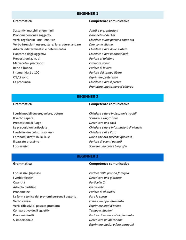 BEGINNER 1 Grammatica Competenze comunicative Sostantivi maschili e femminili Pronomi personali soggetto Verbi regolari in –are, -ere, -ire Verbo irregolari: essere, stare, fare, avere, andare Articoli indeterminativi e determinativi L’accordo degli aggettivi Preposizioni a, in, di Mi piace/mi piacciono Bene e buono I numeri da 1 a 100 C’è/ci sono La pronuncia Saluti e presentazioni Dare del tu/ del Lei Chiedere a una persona come sta Dire come stiamo Chiedere e dire dove si abita Chiedere e dire la nazionalità Parlare al telefono Ordinare al bar Parlare di lavoro Parlare del tempo libero Esprimere preferenze Chiedere e dire il prezzo Prenotare una camera d’albergo BEGINNER 2 Grammatica Competenze comunicative I verbi modali dovere, volere, potere Il verbo sapere Preposizioni di luogo Le preposizioni articolate I verbi in –ire col suffisso -iscI pronomi diretti lo, la, li, le Il passato prossimo I possessivi Chiedere e dare indicazioni stradali Scusarsi e ringraziare Descrivere una città Chiedere e dare informazioni di viaggio Chiedere e dire l’ora Dire a che ora succede qualcosa Parlare di eventi passati Scrivere una breve biografia BEGINNER 3 Grammatica Competenze comunicative I possessivi (ripasso) I verbi riflessivi Quantità Articolo partitivo Pronome ne La forma tonica dei pronomi personali oggetto Verbo venire Verbi riflessivi al passato prossimo Comparativo degli aggettivi Pronomi diretti Si impersonale Parlare della propria famiglia Descrivere una giornata Particella Ci Gli avverbi Parlare di abitudini Fare la spesa Fissare un appuntamento Esprimere stati d’animo Tempo e stagioni Parlare di moda e abbigliamento Descrivere un’abitazione Esprimere giudizi e fare paragoni Pre-Intermediate Grammatica Competenze comunicative Gli avverbi di quantità I pronomi indiretti stare + gerundio Il verbo uscire Il superlativo relativo Il superlativo assoluto Il passato prossimo di piacere L’imperfetto Gli avverbi di tempo Le frasi secondarie con mentre e quando Il verbo dare Esprimere la propria opinione: accordo/disaccordo/indecisione Raccontare qualcosa della propria infanzia Descrivere circostanze passate C’era e c’erano I dimostrativi questo e quello Il passato prossimo con i pronomi diretti L’aggettivo bello Le parti del corpo Intermediate 1 Grammatica Competenze comunicative L’imperativo informale L’imperativo negativo I numeri ordinali Il pronome relativo che La forma negativa dell’imperativo Gli aggettivi e i pronomi indefiniti L’imperativo formale L’imperativo con i pronomi, ci e ne Parlare della salute Parlare dei vantaggi e degli svantaggi di qualcosa Chiedere e offrire aiuto Chiedere informazioni Dare consigli Uso dei verbi sapere e potere Usi del passato prossimo e dell’imperfetto Intermediate 2 Grammatica Competenze comunicative Il condizionale Gli impersonali serve, ci vuole, basta, bisogna Il verbo metterci L’aggettivo buono La frase negativa con nessuno Il passato prossimo dei verbi modali Stare per + infinito Prima di + infinito Usi del condizionale Ricette e piatti tipici Parlare dei mass media e delle fonti di informazione Leggere e scrivere annunci Descrivere il proprio lavoro Parlare di un colloquio di lavoro Esprimere incertezza Intermediate 3 Grammatica Competenze comunicative Il futuro Il verbo riuscire La costruzione con si + i verbi riflessivi Formulare lamentele, divieti, richieste Parlare di stereotipi Il pronome relativo cui dopo una preposizione ce l’ho, ce l’hai … L’aggettivo e il pronome interrogativo quale Il passato prossimo con ne Meglio e migliore Il verbo pronominale farcela Parlare del futuro Fare ipotesi Esprimere sorpresa, incredulità, sollievo Dare informazioni Descrivere una regione / un paesaggio Parlare della natura e dell’ambiente I verbi sapere e conoscere al passato prossimo e all’imperfetto fare / lasciare + infinito Descrivere progetti Il trapassato prossimo Pre-Advanced Grammatica Competenze comunicative I nomi alterati Il discorso indiretto quello / ciò + pronome relativo Il congiuntivo imperfetto Il periodo ipotetico della possibilità Il congiuntivo trapassato Il periodo ipotetico dell’irrealtà Parlare di diversi generi testuali Parlare di tradizioni Comparare usi e costumi di diverse culture Riportare discorsi altrui Formulare aspettative, speranze e delusioni Fare ipotesi Porre condizioni