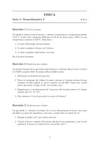 EsercizidiFISICA(6) 1. Un pezzo di ghiaccio, di massa mg = 3.0 kg e alla temperatura Tg = 253 K viene immerso in una massa di acqua pari a ma = 1.0 kg alla temperatura Ta = 373 K. Il sistema è contenuto in un recipiente a pareti adiabatiche. Determinare la temperatura finale Tf del sistema. (λf=3.3•105 J/kg, c(acqua)=4186.8 J/kg K, c(ghiaccio)=2051.5 J/kg K) 2. Un sottile guscio sferico di gomma, un palloncino, di massa M = 50 g, viene riempito di azoto e immerso in un lago. Trascurando le forze di tensione della gomma, si determini la massa di azoto (massa molare pari a mN2 =28 g) che deve essere racchiusa nella cavità affinché il guscio sferico si trovi in equilibrio statico a una profondità h = 100 m, dove la temperatura dell’acqua è T = 4.0 °C. 3. Un gas perfetto biatomico (cV = 5/2R, cP = 7/2R, γ = 7/5 = 1.4) dallo stato iniziale con pi = 2.0 atm e Vi = 0.5 l, raggiunge lo stato finale in cui Vf = 2.0 l attraverso tre diversi percorsi reversibili: a) espansione adiabatica; b) espansione isoterma seguita da un’isocora; c) un’isocora seguita da una espansione isobara. Determinare il lavoro fatto ed il calore scambiato per ciascun tipo di percorso (anche in segno). 4. Una certa quantità di aria, il cui stato iniziale è caratterizzato dalle coordinate termodinamiche Vi = 5.0 m3, pi = 4.0 atm e Ti = 60.0 °C, subisce una trasformazione fino ad uno stato finale caratterizzato da Vf = 3.0Vi e pf = 1.0 atm. La trasformazione seguita è una trasformazione del tipo pVk = cost con l’esponente k incognito. Nell’ipotesi che l’aria sia assimilabile ad un gas perfetto biatomico, si determini: a) l’esponente k della trasformazione; b) il lavoro L compiuto dall’aria; c) la variazione di energia interna, ΔEint, dell’aria; d) la quantità di calore, Q, assorbita dall’aria. 5. Una macchina reversibile utilizza come fluido una quantità di sostanza n = 1.0 mol di un gas perfetto biatomico che esegue il ciclo costituito dalle seguenti 3 trasformazioni: 1) dallo stato iniziale (p1 = 5.0 atm e T1 = 20° C) il gas viene fatto espandere lungo un’isoterma fino ad una pressione p2 = 1.0 atm; 2) a pressione costante, p2, il gas viene riportato sull’adiabatica passante per lo stato iniziale; 3) seguendo l’adiabatica il gas viene quindi riportato allo stato iniziale. Si determini: a) il lavoro L e il calore Q scambiati dal gas in un ciclo; b) il rendimento del ciclo; c) la variazione di entropia lungo la trasformazione isobara. 6. Una quantità pari a n = 1.0 mol di un gas perfetto, contenuta in un cilindro dotato di pistone libero di scorrere senza attrito, subisce in un primo tempo una lenta espansione senza scambio di calore con l’esterno, fino a raddoppiare il volume iniziale. In seguito, il gas subisce una lenta compressione a temperatura costante fino a tornare al volume iniziale. Sapendo che la temperatura iniziale e finale del gas sono T1 = 61°C e T2 = -20°C, si determinino: a) il rapporto fra i calori specifici a pressione e volume costante del gas; b) l’eventuale variazione di entropia del gas. 7. Una macchina termica basata sull’uso di un gas ideale segue un ciclo composto da due isobare e due adiabatiche (tutte reversibili). La macchina fa uso di n = 5.0 mol di gas e le due isobare sono alle pressioni pA = 20.0 atm e pB = 10.0 atm, mentre l’espansione isobara a pressione più elevata si svolge tra i volumi V1 = 5.0 l e V2 = 10.0 l. Supponendo di poter far lavorare la macchina termica sia con un gas monoatomico che con uno biatomico, determinare: a) la quantità di calore assorbito dai gas in un ciclo e per quale dei due è più elevata; b) la temperatura minima raggiunta da ogni gas lungo il ciclo; c) l’espressione del rendimento della macchina specificando per quale gas è più elevato 8. Un recipiente cilindrico con pareti adiabatiche, di sezione A = 0.3 m2 e lunghezza l = 1.0 m, è suddiviso in due camere uguali per mezzo di un pistone a tenuta (di spessore e massa trascurabili). Il pistone è adiabatico e può scorrere senza attrito lungo le pareti del cilindro. In una delle camere viene inserita una molla di costante elastica k = 100 N/cm, di lunghezza a riposo pari a l/2. L’altra camera viene riempita con n moli di un gas ideale. Sapendo che all’immissione del gas la molla si accorcia di 15 cm e che per farla riallungare di 5 cm la temperatura del gas deve essere diminuita di 120 K, determinare: (a) il numero di moli n di gas ideale immesso (b) la temperatura T0 iniziale del gas; (c) la quantità di calore Q persa dal gas durante la diminuzione di temperatura. 9. Una mole di gas monoatomico a pressione pA = 1.0 atm, volume VA = 22.4 l e temperatura TA = 273 K compie le seguenti trasformazioni reversibili: A → B isobara con VB = 1.2VA; B → C isocora con pC = 1.2pA; C → D isobara con VD = VA; D → A isocora per chiudere il ciclo. Calcolare: (a) la massima T del ciclo; (b) il lavoro fatto nel ciclo; (c) il calore scambiato.