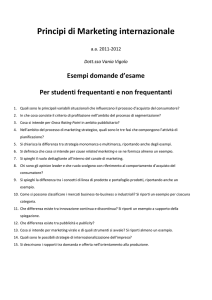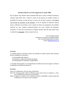 Esercizi di microeconomia 1. Si definisca il concetto di elasticità della domanda al prezzo. ii) Si spieghi da cosa dipende l’elasticità. iii) Allo stato conviene tassare un bene perfettamente elastico o un bene a domanda più rigida? Giustificare la risposta. 2. Data la curva di domanda di un bene P = 200 – 3Q Si calcoli: i) il prezzo quando la quantità è uguale a 50 ii) si scriva la formula dell’elasticità della domanda al prezzo, e si calcoli l’elasticità in corrispondenza del prezzo trovato. 3. Date le seguenti funzioni di domanda e offerta di un bene: Q = 286 – 20P. d Q = 88 + 40P s Si determini la quantità di equilibrio e l’elasticità della domanda nel punto di equilibrio. In quel punto, la domanda è elastica o anelastica? 4. Si definisca a. il concetto di elasticità della domanda rispetto al reddito b. quando è che il bene A è un bene inferiore? c. si dica come varia la domanda del bene A al ridursi del suo prezzo, se il bene A è un bene inferiore, ma non un bene di Giffen. Teoria della scelta 1. Si tracci una curva di indifferenza e se ne spieghi il significato. Come si determina, dato un insieme di curve di indifferenza, quale sarà la combinazione di beni scelta dal consumatore? Si supponga ora che il prezzo del bene a aumenti. Si spieghi come varia la quantità domandata nel caso in cui il bene sia normale. 2. Dati due beni, a e b, si spieghi l’effetto reddito e l’effetto sostituzione nel caso dell’aumento del prezzo del bene a. 3. Un consumatore ha un reddito monetario Y = 1000 che utilizza completamente nell’acquisto di due beni A e B, i cui prezzi monetari sono p = 20 e p = 40. A B a. Scrivere e rappresentare graficamente il vincolo di bilancio. b. Tracciare una curva di indifferenza tangente al vincolo di bilancio e spiegare perché corrisponde al paniere di consumo ottimo. c. Come varia la scelta del paniere se il prezzo del bene A sale a 30? 4. Se un consumatore ha un reddito monetario Y = 100 che utilizza nell’acquisto di due beni, i cui prezzi sono p = 2 e p = 5. Le sue preferenze sono descritte dal SMS = (Q +4)/(Q ) A B B A a. Si definiscano le condizioni di scelta del consumatore e le si rappresenti graficamente. c. Si determinino le quantità domandate dei due beni. 5. a. Si definiscano le condizioni di scelta del consumatore e le si rappresenti graficamente. b. Quale è il valore del rapporto fra le utilità marginali nel punto di ottimo? c. Se un consumatore ha un reddito monetario Y = 360 che utilizza nell’acquisto di due beni, i cui prezzi sono p = 40 e p = 80. Le sue preferenze sono descritte dal SMS = Q /2Q , si calcolino A B B A le quantità domandate dal consumatore 6. Si illustri come si ricava la funzione di offerta di lavoro Teoria dell’impresa 1. Si descriva come si ricavano le curve del costo medio totale, del costo medio variabile e del costo marginale. Si traccino le tre curve su un grafico insieme alla curva del prezzo, in un mercato di concorrenza perfetta. Si dica se, nel caso da voi illustrato, l’impresa ha extra-profitti. 2. Si definisca la condizione di massimizzazione del profitto di un’impresa nel breve periodo. Si dica se questa condizione è compatibile con l’esistenza di extra-profitti (se ne spieghi la ragione, aiutandosi con un grafico). 3. Si definisca il concetto di costo marginale. Si illustri poi come l’impresa che opera in un mercato concorrenziale stabilisce la quantità da produrre. Si spieghi perché in questo modo l’impresa massimizza il profitto. 4. Si definisca il concetto di costo marginale e si mostri come l’impresa determina la quantità offerta (per la massimizzazione del profitto). b) Si spieghi perché il tratto crescente del costo marginale rappresenta la curva di offerta di breve periodo dell’impresa. c) Si illustri graficamente una situazione in cui l’impresa opera in perdita. 5. Le imprese che operano in un mercato concorrenziale ottengono un extraprofitto. i) Si illustri in un grafico il caso per la singola impresa. ii) Le imprese possono continuare a ottenere extra-profitti nel lungo periodo? Si motivi la risposta e si spieghi come si arriva all’equilibrio di mercato di lungo periodo. 6. Si definisca il concetto di prodotto marginale di un fattore. Si spieghi come si determina la quantità del fattore lavoro domandata dall’impresa. Qual è l’effetto del progresso tecnico sulla domanda del fattore? 7. Si definisca la condizione che guida la domanda di un fattore produttivo (per esempio il lavoro) da parte di un’impresa e se ne illustri graficamente la funzione. Si spieghi poi come varia la domanda del fattore se il suo prezzo diminuisce (spiegandone il motivo). 8. Si spieghi come si ottiene la curva del prodotto marginale del lavoro. b) Come si passa dalla funzione del prodotto marginale del lavoro alla funzione di domanda del fattore “lavoro”? c) Come si determina il salario di equilibrio? Equilibrio economico generale 1. a)Si tracci la frontiera delle possibilità di produzione e si spieghi il significato economico. b) Si spieghi perché è spesso rappresentata da una curva convessa. c) Cosa misura l’inclinazione della frontiera. d) Si spieghi infine cosa rappresenta un punto che giace all’interno della frontiera delle possibilità di produzione. 2. Si illustri graficamente la frontiera delle possibilità produttive (senza necessariamente fare tutti i passaggi per ricavarla) e se ne spieghi il significato. Si scrivano le condizioni per l’allocazione ottima delle risorse e la si illustri nel grafico. 3. Si definisca la frontiera delle possibilità produttive. a. Come viene definito il saggio marginale di trasformazione (SMaT)? b. Come si determina l’allocazione ottimale? 6. Si consideri il caso della concorrenza perfetta. Si illustri come si determina l’offerta di una singola impresa e del mercato nel breve periodo. Si mostri poi l’aggiustamento indotto da un aumento della domanda. Si consideri ora la funzione di offerta aggregata di brev