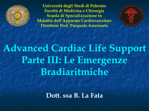 Pacing cardiaco in emergenza Pacing • Uno stimolo elettrico, condotto al cuore attraverso elettrodi, causa depolarizzazione e conseguente contrazione del cuore • Il generatore di impulsi puo essere - interno (PMK permanente) - esterno al paziente (PMK esterno) Utilizzo nelle ECC (emergency cardiac care) Endocardico (Transvenoso) Concetti di base Sistema : – Generatore (“can”) – Catetere – Paziente Pacemaker Generator Composed of: Battery Hybrid circuit (brains) and Header Pacemaker Leads • Methods of Insertion: – Epicardial – Endocardial (Transvenous) • Needed to conduct current to the heart Pacemaker Leads: Methods of Fixation Passive fixation Tined tip Passive fixation Finned tip Active fixation Screw-in lead 7 VIE DI ACCESSO principali vie di accesso per elettrocateteri endocardici: • vena cefalica (2) • vena succlavia (3) • vena giugulare esterna (4) Unipolar vs. Bipolar Pacing Technology “Secret” • Pacemakers do only 2 things: – Pace – Sense Capture • Atrial Capture Atrial Capture • Paced Atrial events re-start the pacing interval pacing interval pacing interval pacing interval Ventricular Capture • Paced Ventricular events re-start the pacing interval pacing interval pacing interval pacing interval Tipi di stimolatori • • • • • • Elettrodo Generatore Transcutaneo cute esterno Transvenoso AD VnDx esterno Transtoracico nel cuore esterno Transesofageo esofago esterno Epicardico epidardico est e int Permanente endocard. interno indicazioni • • • • • Emergenza Bradicardia con PA< 80 e sintomi bassa portata (mentale angina EPA) Bradicardia e scappamenti Overdrive nelle tachicardie refrattarie Arresto da bradisistolia Definitiva SSS, BAV mobitz 1 secondo grado, III,blocchi alternanti o trifascicolari Pacing transcutaneo o transtoracico (1952 1980) • Il cuore viene stimolato attraverso elettrodi cutanei (antero-posteriori o apico-sternale • L’impulso a parete integra raggiunge il miocardio • Non invasivo Pacing trancutaneo • 80b/m’ - intensità media dello stimolo 50-100 mA • Deve catturare • Si diminuisce la stimolazione in uscita mantenendola 10% sopra il valore soglia Pacing transcutaneo Contrazione del muscolo -- sedazione Pacing trans venoso • Stimolare l’endocardio dell’atrio e/o ventricolo attraverso un elettrodo introdotto in una vena centrale (1950) • Approccio venoso femorale • Fluoroscopia di ausilio per il corretto posizionamento • 60-100 b/m’ 20 mA soglia < 0,5 mA • Si mantiene a 1,5-2 volte la soglia di stimolo Pacing trans-esofageo (1960) • Stimolazione dell’ atrio attraverso un sondino in esofago • La vicinanza permette la cattura a relativa bassa corrente che crea minimo disturbo • La cattura del ventricollo richiede energie maggiori (10-80 mA) che provocano fastidio e talora mancata cattura • E’ perciò utilizzato per il pacing atriale come overdrive di aritmie atriali e/o studio elettrofisiologico Pacing epicardico • Elettrodo epicardico durante diretta visione • Necessita toracotomia • Elettivamente posizionati nei cardiooperati