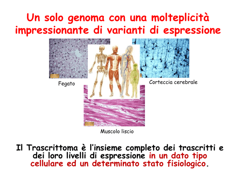 Un solo genoma con una molteplicità impressionante di varianti di espressione Corteccia cerebrale Fegato Muscolo liscio Il Trascrittoma è l’insieme completo dei trascritti e dei loro livelli di espressione in un dato tipo cellulare ed un determinato stato fisiologico. Transcriptome studies a)Mappare “sequence reads” onto a reference genome. b) De novo transcriptome assembly uses software to infer transcripts directly from short sequence reads. c) Differential expression •A eukaryotic cell contains a total mass of ∼100 000 mRNAs with ∼15.000–30.000 distinct mRNAs. Prevalence ranging from one to several thousands. •About 50% of the transcript population is made up of a relatively small number (some hundreds) of abundant transcripts, representing only 1% of the different mRNA species. •The other 50 % half contains the ‘rare’ mRNAs. •The difficulty of fishing out a gene responsible for a specialized function in a certain biological program often originates from the fact that the gene is expressed at low levels whereas the bulk of a cell’s mRNA is made up of highly abundant transcripts. Analisi di espressione differenziale Screening for differentially expressed genes is one of the most straightforward approaches to unravel the molecular basis of a biological system Le cDNAteche sono uno strumento prezioso per gli studi di espressione genica Conversione dei trascritti in cDNA Selection /Isolation of specific messenger RNA Identification of novel messenger RNA with degenerated oligo/probes Studies on differentially expressed messenger RNA Differential Hybridization Technique Differential hybridization o ibridazione sottrattiva driver cDNAteca Driver Marcata con biotina Biotina: cofattore Avidina ne è ricco il bianco d’uovo essa lega “avidamente la Biotina” e ne previene l’assorbimento intestinale;. tester Differential Dysplay Technique RT-PCR to increase mRNA abundance AAAAAAAA AAAAAAAA AAAAAAAA AAAAAAAA AAAAAAAA AAAAAAAA TTTTTTTTT AAAAAAAA TTTTTTTTT AAAAAAAA TTTTTTTTT AAAAAAAA TTTTTTTTT AAAAAAAA TTTTTTTTT AAAAAAAA TTTTTTTTT AAAAAAAA TTTTTTTTT AAAAAAAA TTTTTTTTT AAAAAAAA TTTTTTTTT AAAAAAAA TTTTTTTTT RNAsi Primer sequenza specifico TTTTTTTTT TTTTTTTTT TTTTTTTTT TTTTTTTTT TTTTTTTTT Primer hybridization high stringency TTTTTTTTT TTTTTTTTT TTTTTTTTT TTTTTTTTT TTTTTTTTT PCR Oligo dTTTTTTTTT TTTTTTTTT TTTTTTTTT TTTTTTTTT TTTTTTTTT TTTTTTTTT PCR Oligo dTTTTTTTTT TTTTTTTTT TTTTTTTTT TTTTTTTTT TTTTTTTTT TTTTTTTTT TTTTTTTTT PCR TTTTTTTTT Oligo dTTTTTTTTT TTTTTTTTT TTTTTTTTT TTTTTTTTTTA3’OH TTTTTTTTTTT TTTTTTTTTTG TTTTTTTTTTC TTTTTTTTTTCG TTTTTTTTTTCC Differentially expressed gene Misure di espressione genica: 1980 Northern Blot/Dot Blot Misure di espressione genica: 1990 Differential dysplay e tecniche sottrattive /PCR 1995 Arrays/ SAGE/RealTime PCR wide”) (analisi “genome The complexity of transcriptome http://neomorph.salk.edu/human_methylo me/data.html DNA Transcription 20.929 Protein coding RNA Translation 23.218 Non-coding RNA No Translation Protein More than 70% of the genome is transcribed and 50% is non-coding RNA Complex splicing pattern La complessità del trascrittoma Alternative promoters Complex splicing patterns Messenger RNA Tissue-specificity of promoters Corteccia somato-sensitiva Ippocampo Corteccia visiva Cervelletto Differentiation stage-specificity of promoters XM (mRNA) XR (non-coding RNA) transcript from genome annotation NM NR XP( protein) NCBI predicted NP from RNA sequencing and may differ from XP files Fantom 5 project: Alternative Transcription Starting Sites (TSS) Proteina fibrillare acida della glia Actin B
