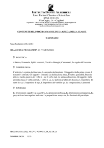 LICEO CLASSICO STATALE GOFFREDO MAMELI Anno scolastico 2015/2016 Docente: Sergio Rossetti Programma di Greco Classe: V ginnasio sezione A Morfologia nominale o I sostantivi con il tema in dittongo o I principali sostantivi irregolari della III declinazione o Gli aggettivi della seconda classe a tre, a due e ad una sola uscita; gli aggettivi irregolari o Il comparativo di uguaglianza e di minoranza o I gradi di alterazione dell’aggettivo e dell’avverbio: primo e secondo sistema di formazione o I numerali cardinali o I pronomi dimostrativi o I pronomi personali e riflessivi o Pronomi possessivi o Il pronome relativo e relativo-indefinito o I pronomi indefiniti o I pronomi interrogativi Morfologia verbale o Le classi verbali o Il futuro sigmatico o Il futuro asigmatico o contratto o Il futuro attico o Il futuro dorico o L’aoristo debole sigmatico e asigmatico o L’aoristo tematico 1 o L’aoristo atematico o L’aoristo cappatico dei verbi in – con raddoppiamento o L’aoristo passivo debole e forte o Il futuro passivo debole e forte o Il perfetto debole e forte o Il perfetto atematico o Il piuccheperfetto debole, forte e atematico o Il perfetto medio-passivo o Il piuccheperfetto medio-passivo o Gli aggettivi verbali o Verbi in : coniugazione del futuro attivo e medio, dell’aoristo attivo e medio e passivo dei verbi e coniugazione completa del verbo Sintassi o L’espressione della potenzialità nel presente e nel passato o La proposizione finale in forma esplicita o La proposizione consecutiva o Il periodo ipotetico (I, II, III e IV tipo) o Il participio predicativo o L’attrazione diretta e inversa del pronome relativo o Le completive in dipendenza dai verbi di timore Il docente Sergio Rossetti gli alunni 2